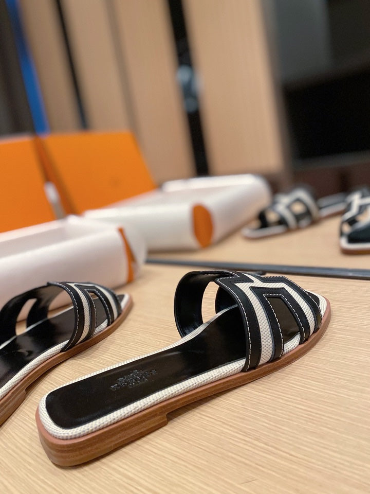 0RAN SANDALS IN BLACK CALFSKIN AND WHITE CANVAS