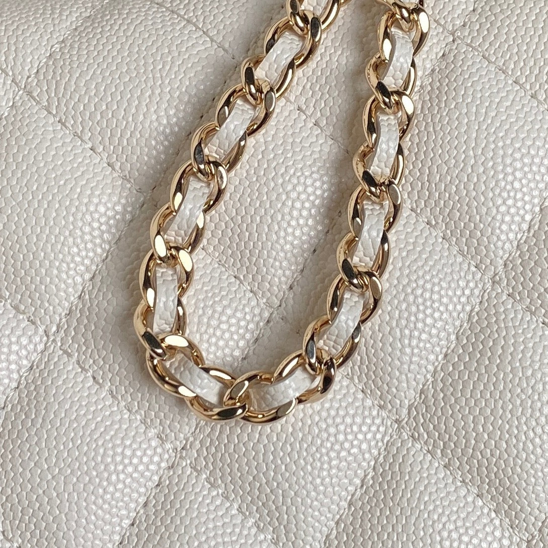 25C FLAP BAG 18 IN WHITE SHINY GRAINED CALFSKIN GOLD HARDWARE