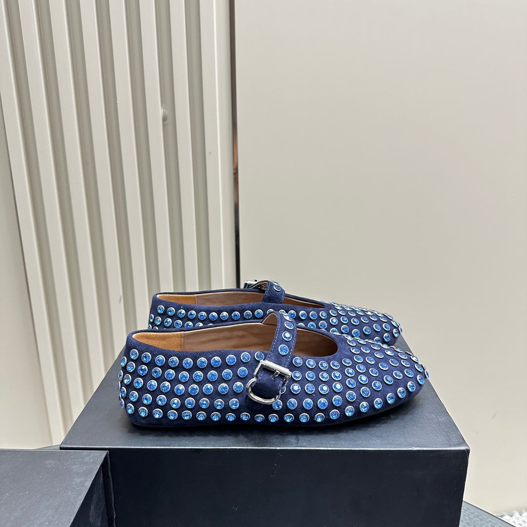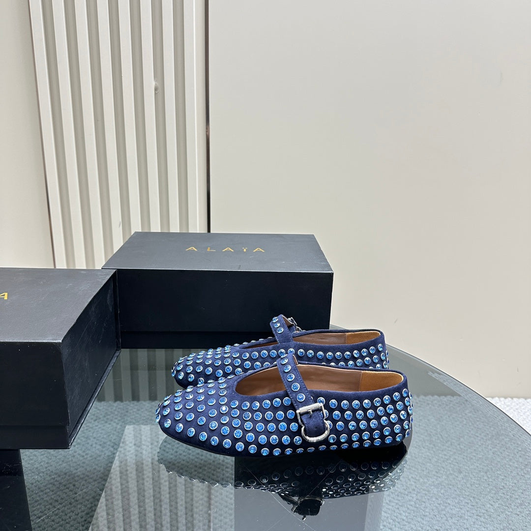 ALAIA CRYSTAL EMBELLISHED BALLET FLATS IN NAVY BLUE SUEDE