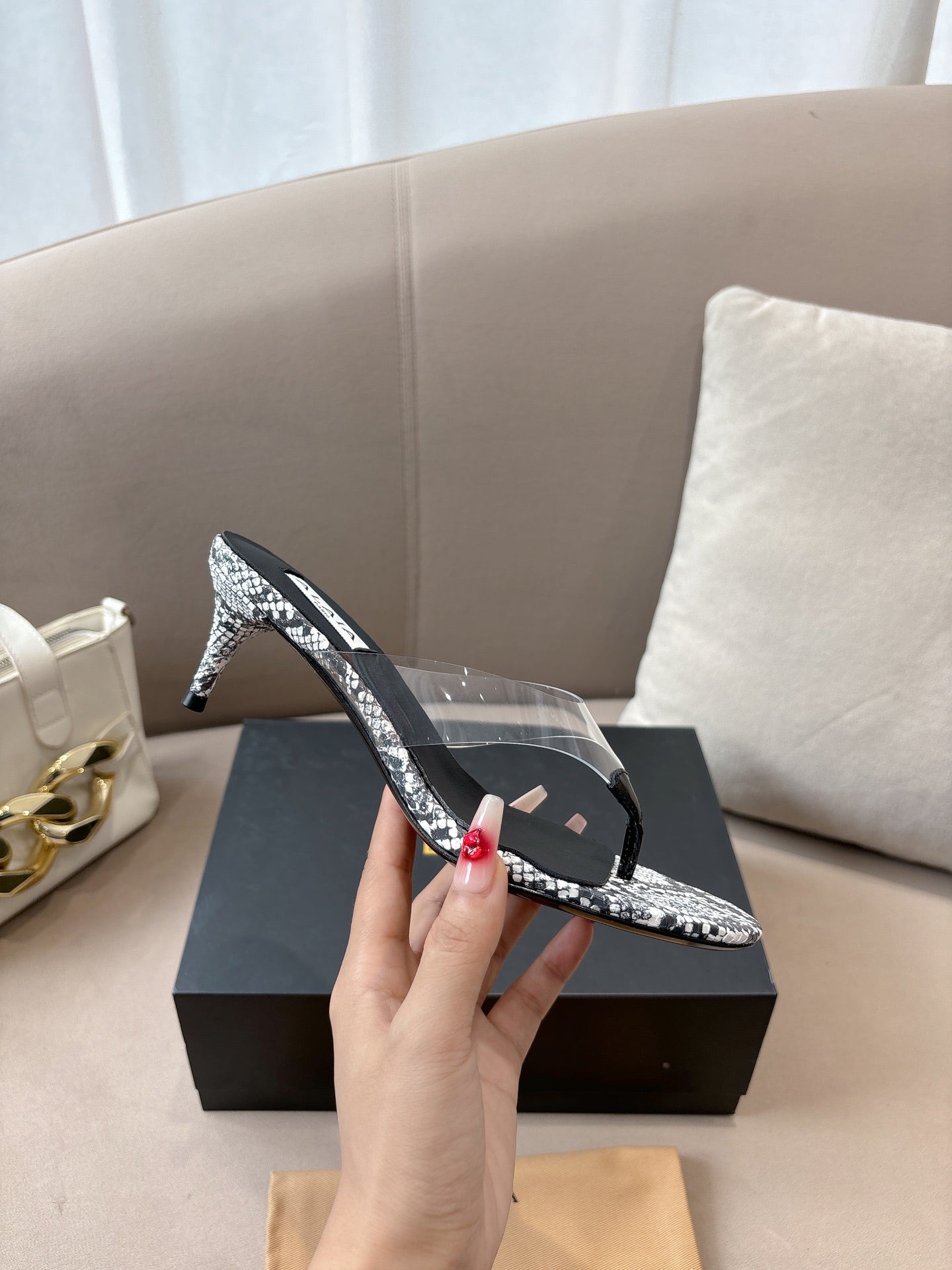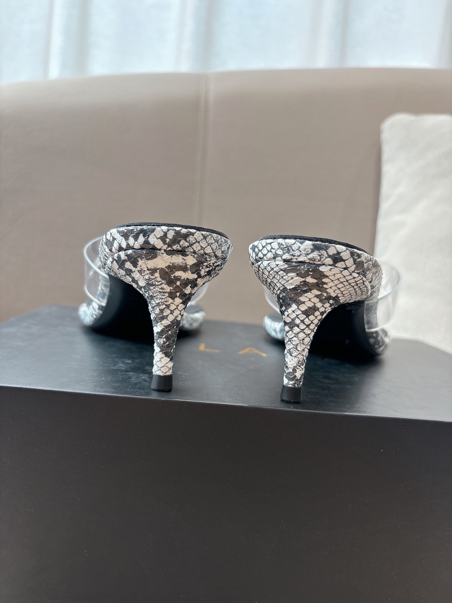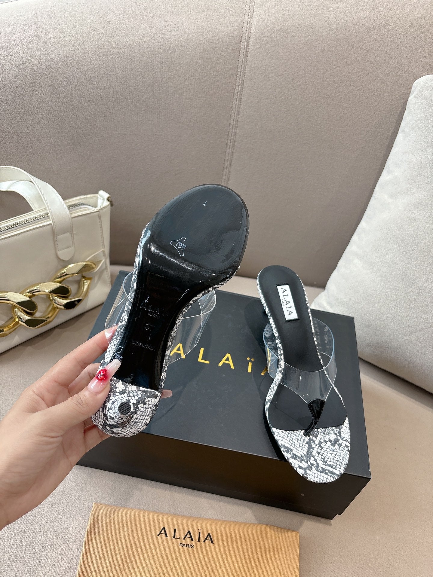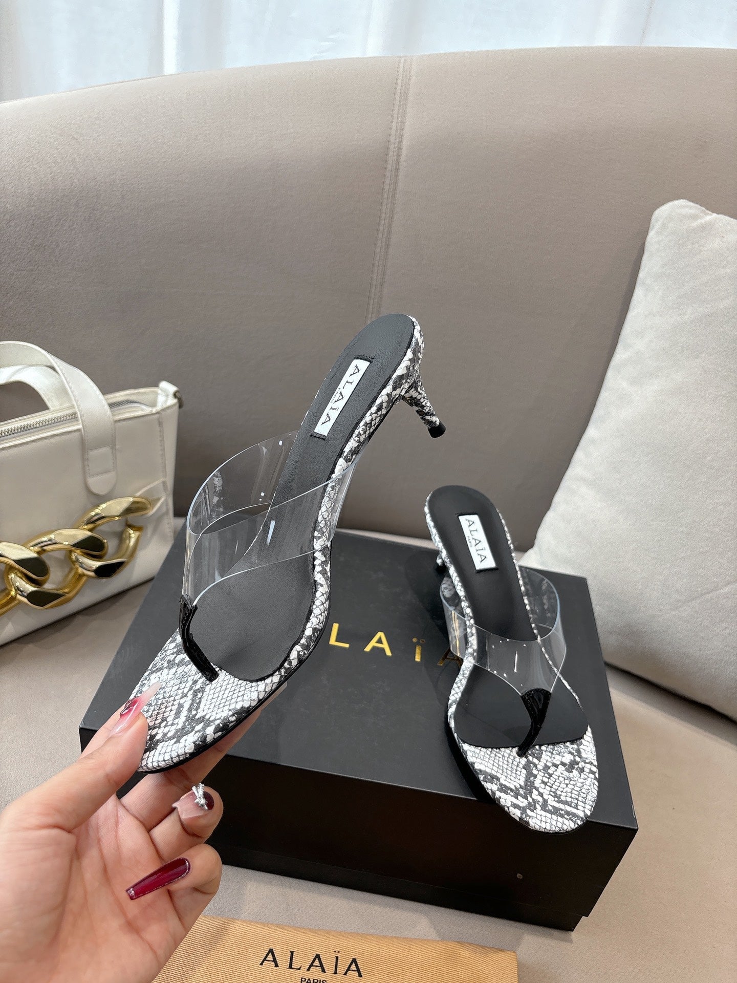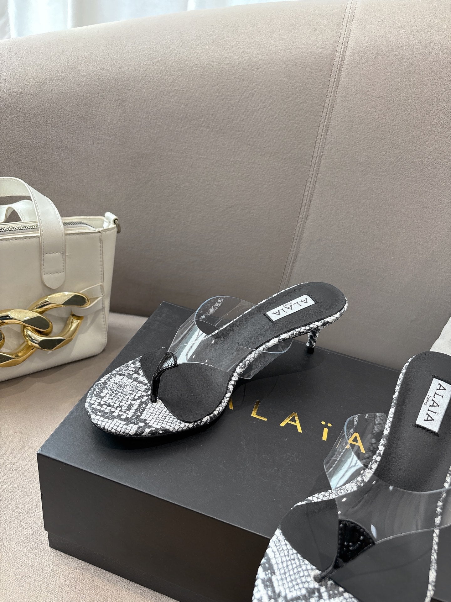 ALAIA HEELED THONG 25S 55 MM IN WHITE AND BLACK LAMBSKIN SNAKE-EMBOSSED WITH CLEAR STRAP