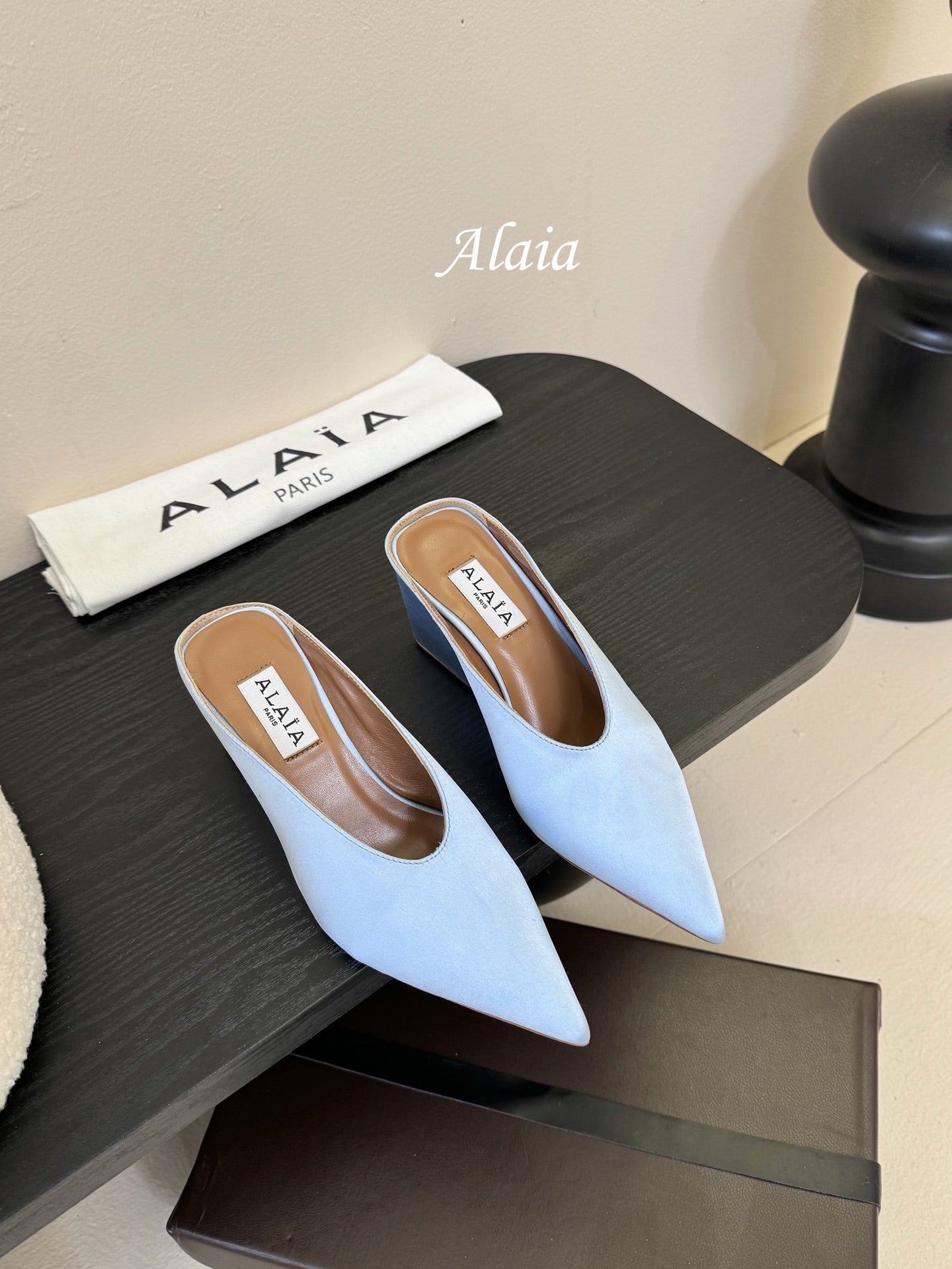 ALAIA HIGH MULES 25S IN LIGHT BLUE SATIN