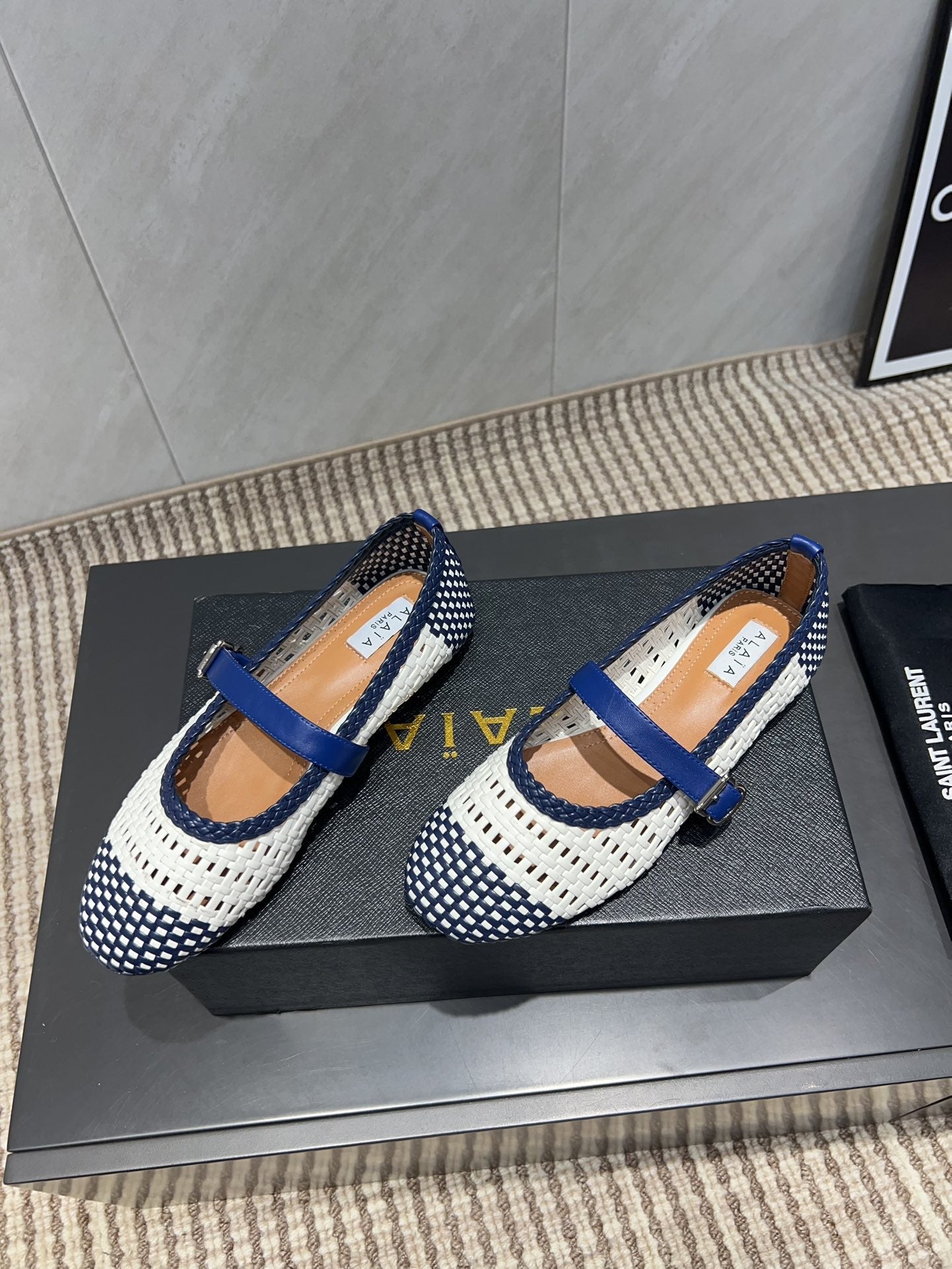 ALAIA MARY JANE FLATS WOVEN PATTERN 25S IN WHITE MIX NAVY BLUE CALFSKIN