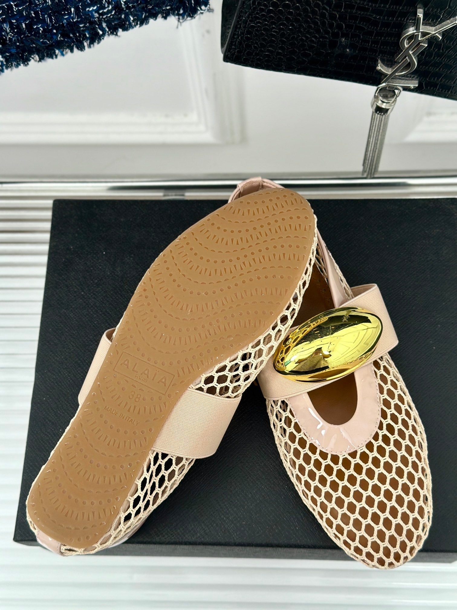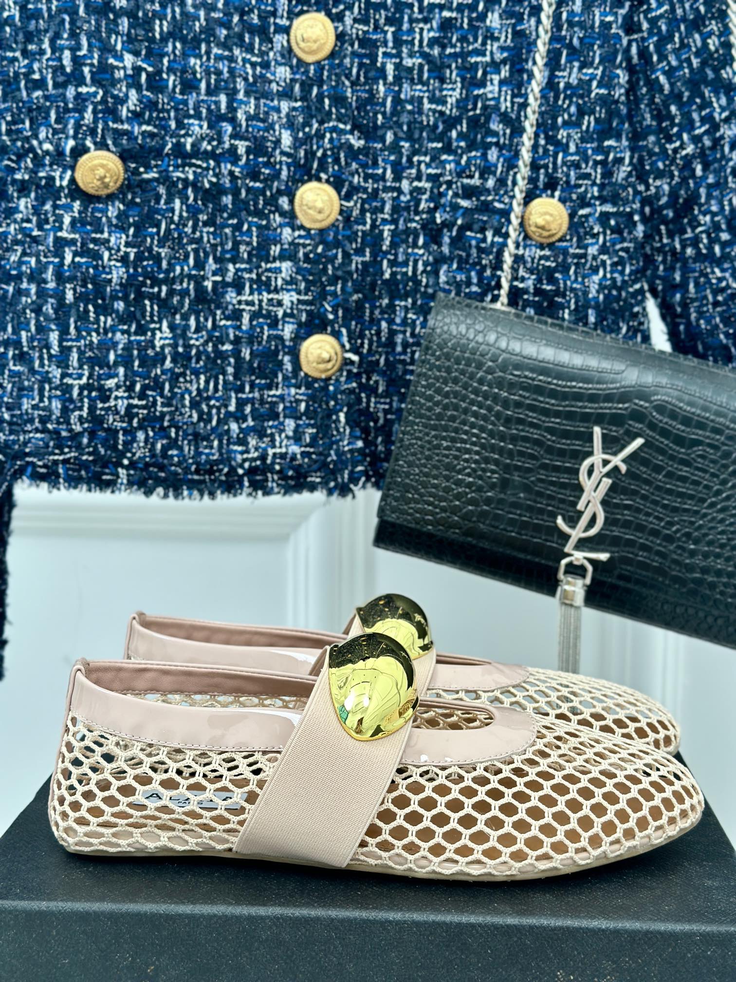 ALAIA MARY JANE SHOES IN BEIGE MESH WITH GOLD HARDWARE