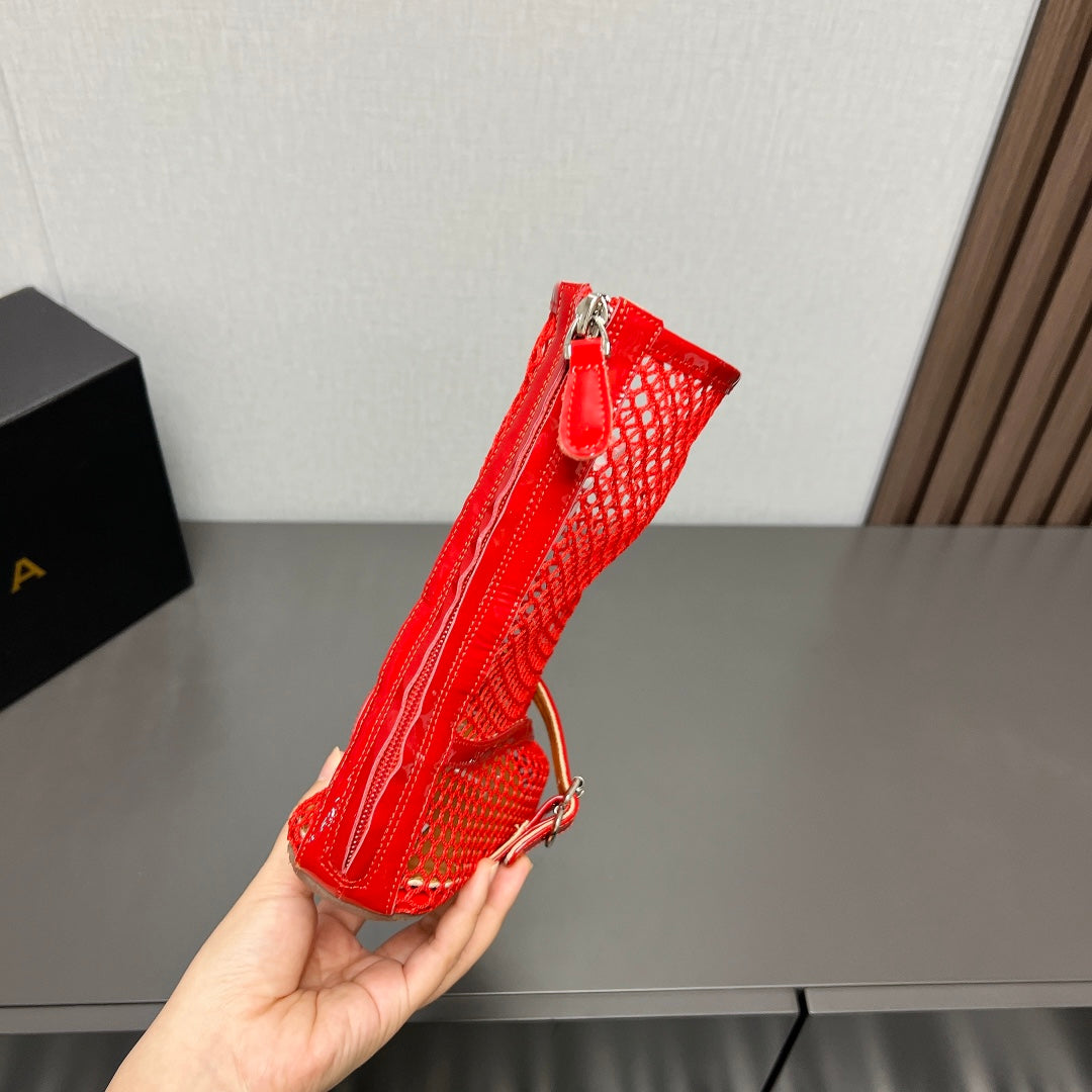 ALAIA SHORT BOOTS IN ORANGE RED MESH FISHNET