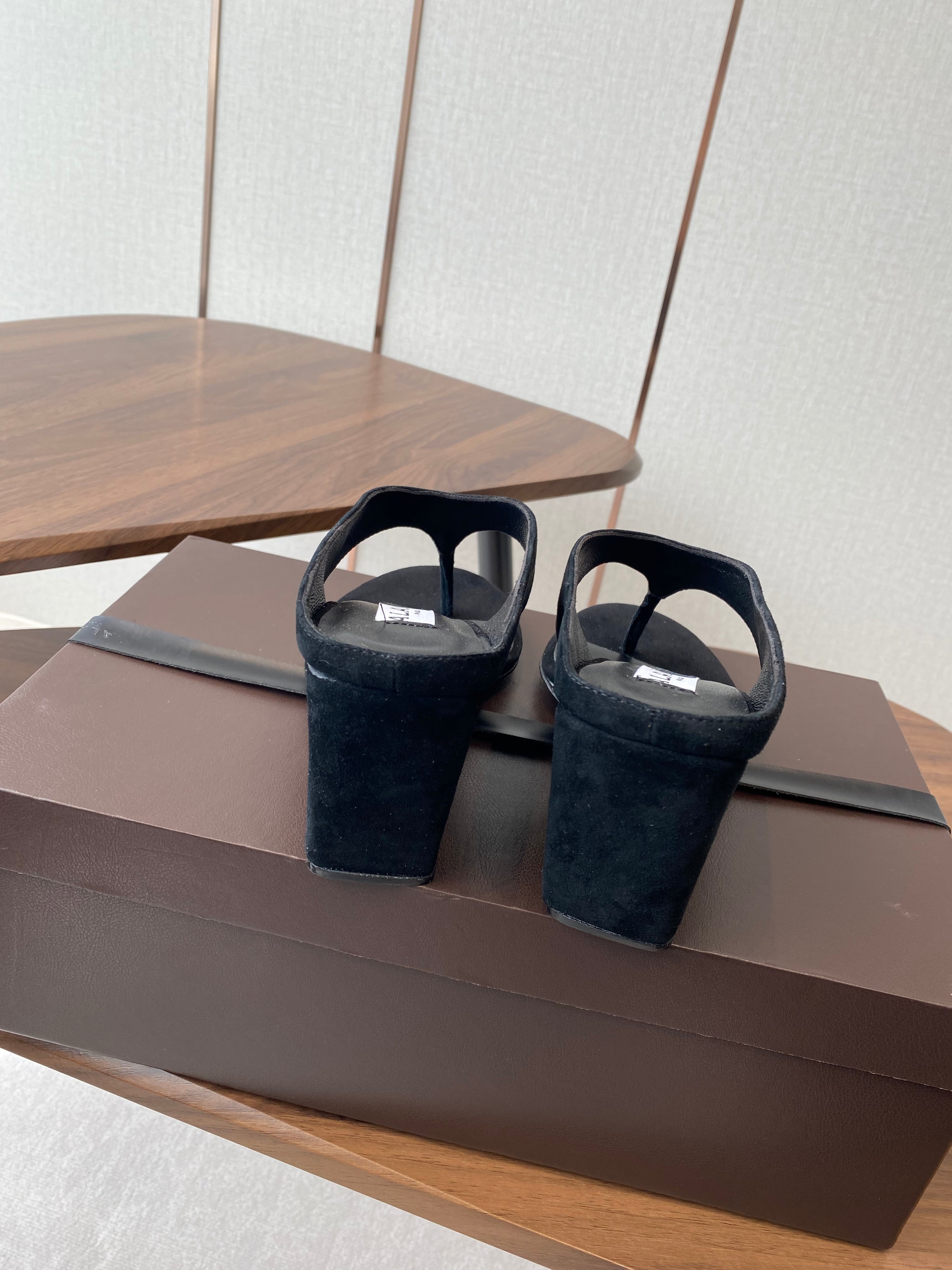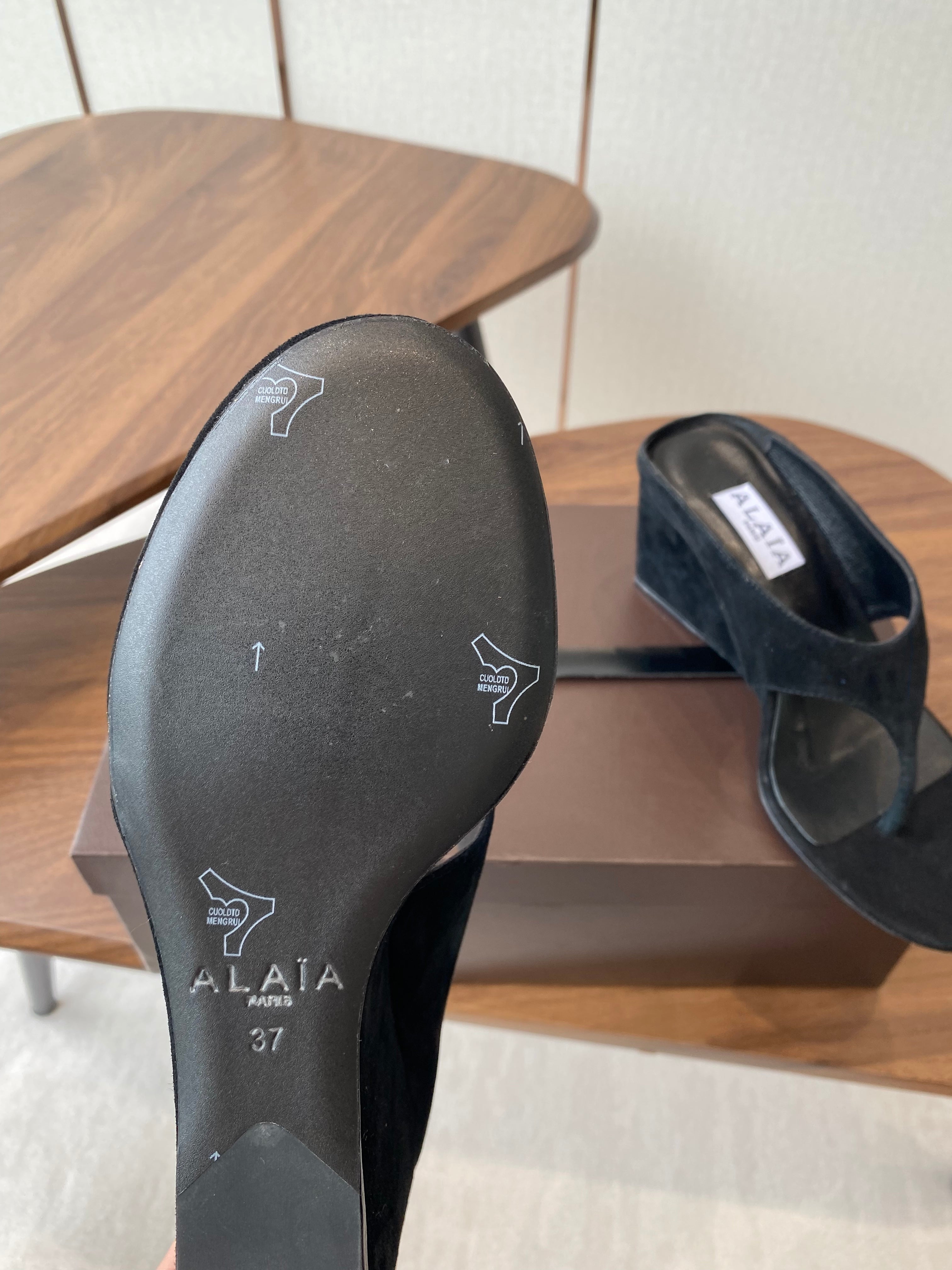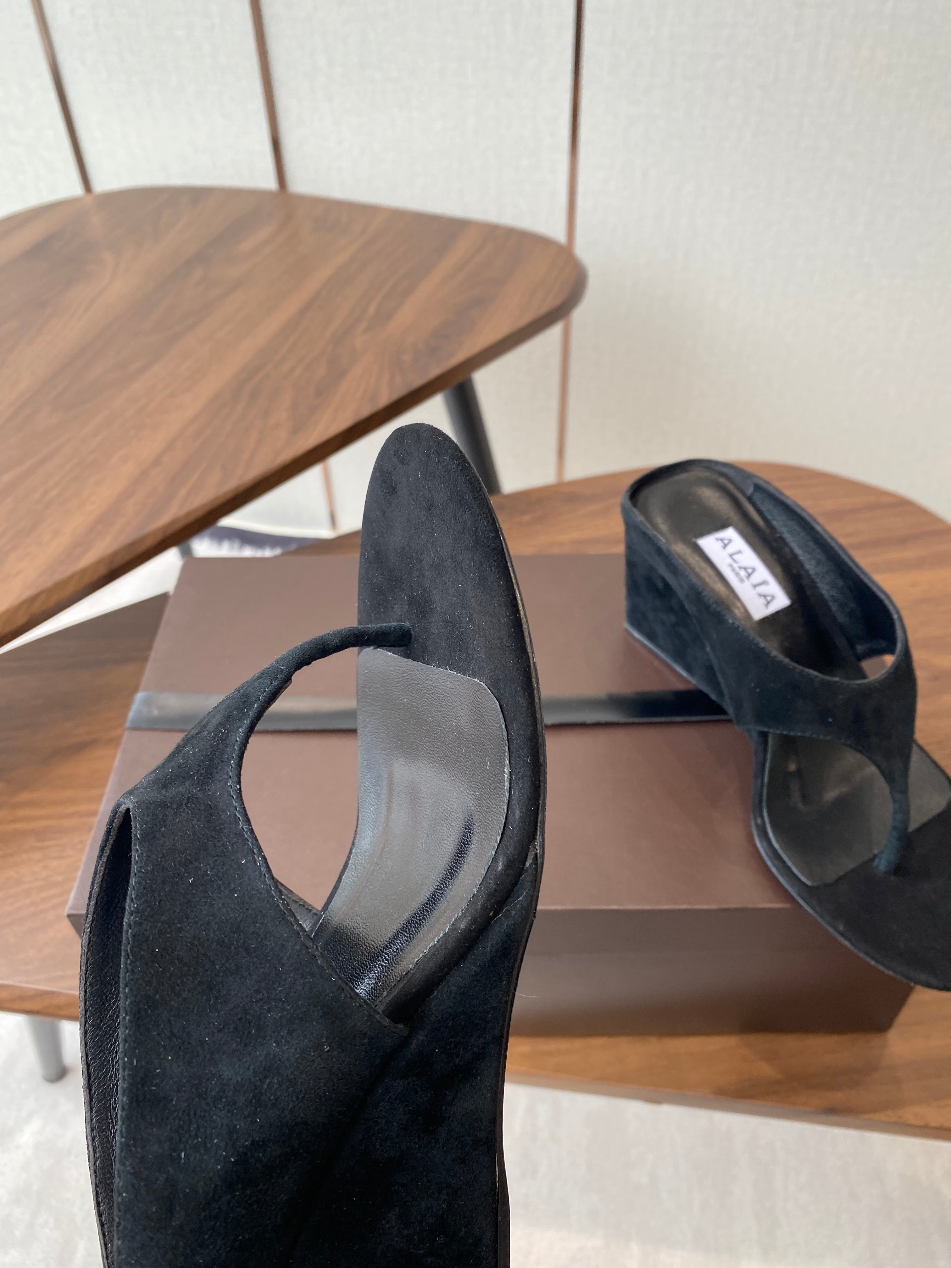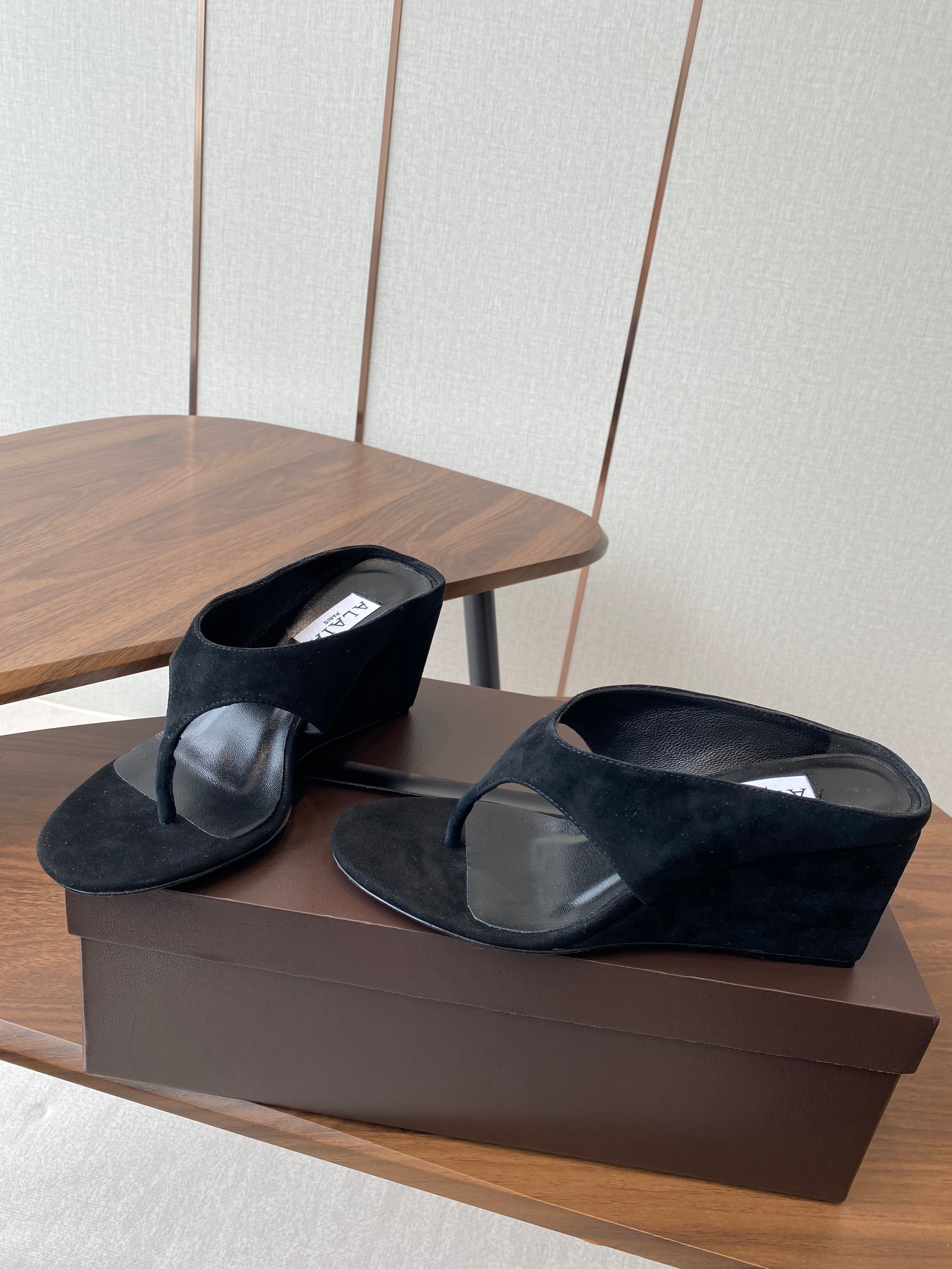ALAIA WEDGE THONG SANDALS 25S IN BLACK SUEDE