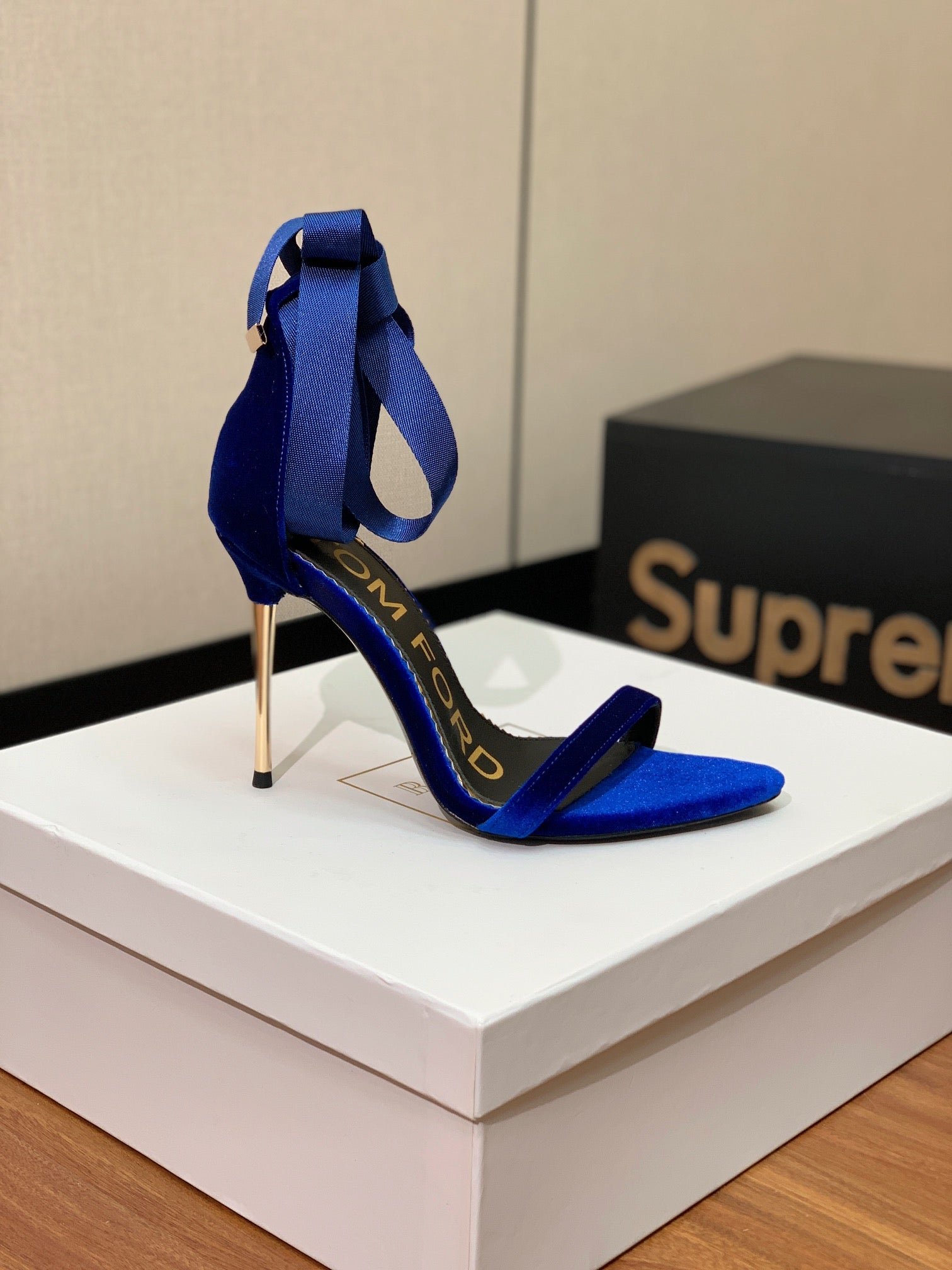 ANKLE SANDAL 10 CM IN NAVY BLUE VELVET AND SILK