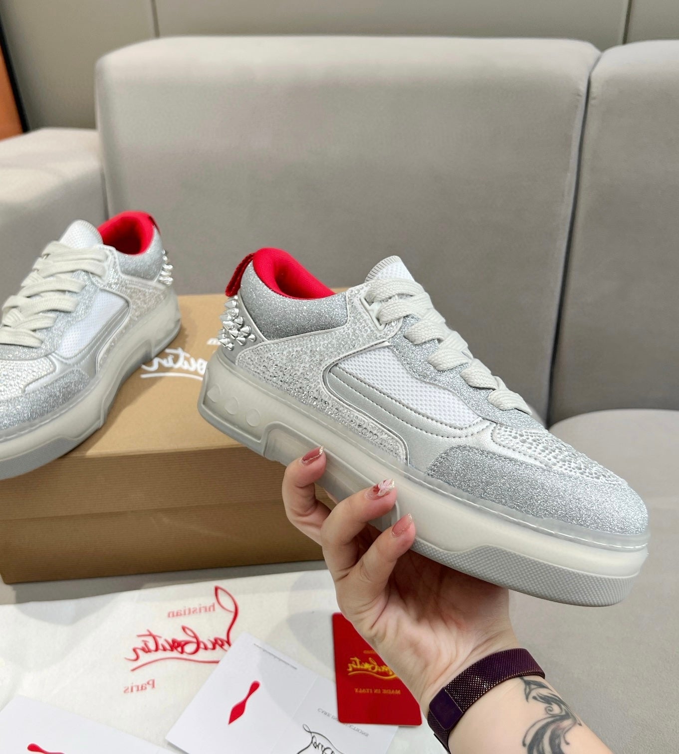 ASTROLOUBI SNEAKER IN SILVER CALFSKIN SPIKES RHINESTONE DETAILS