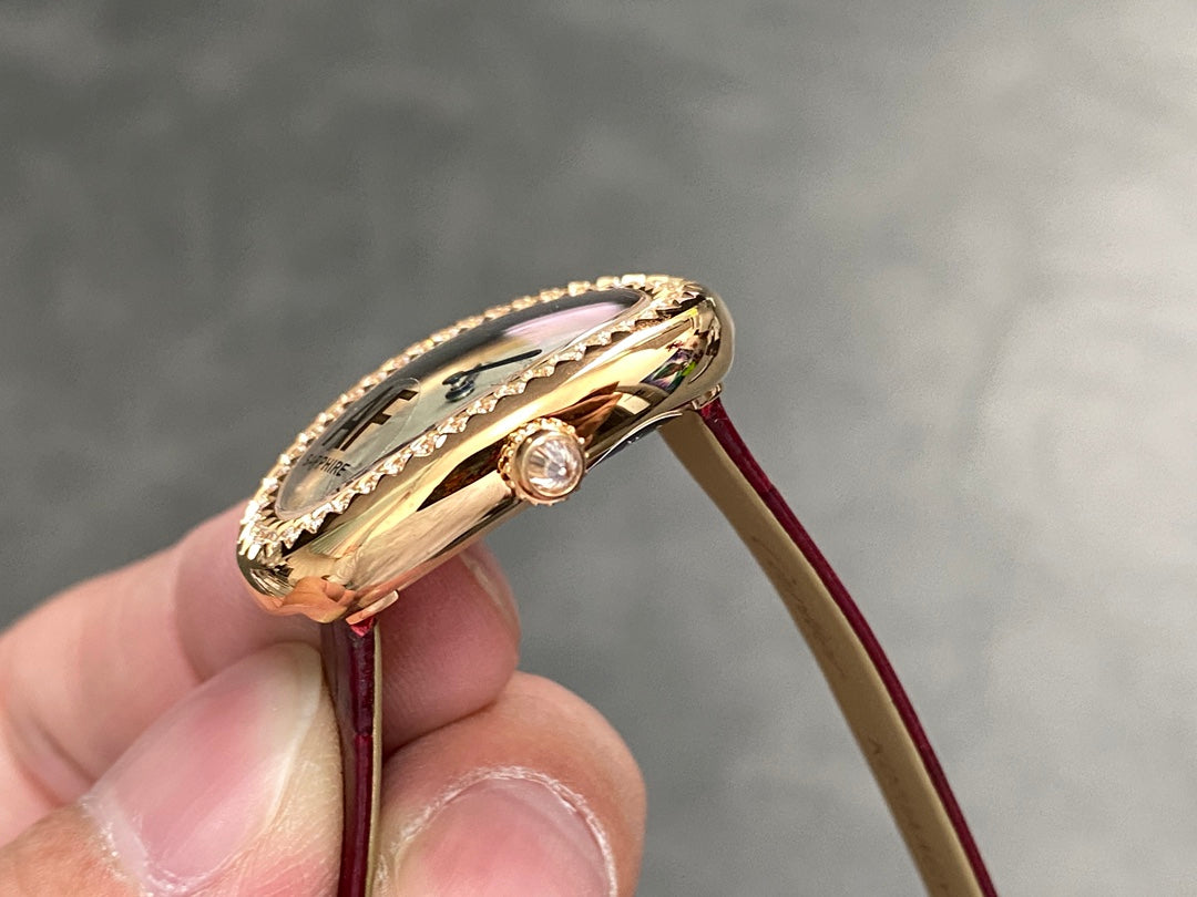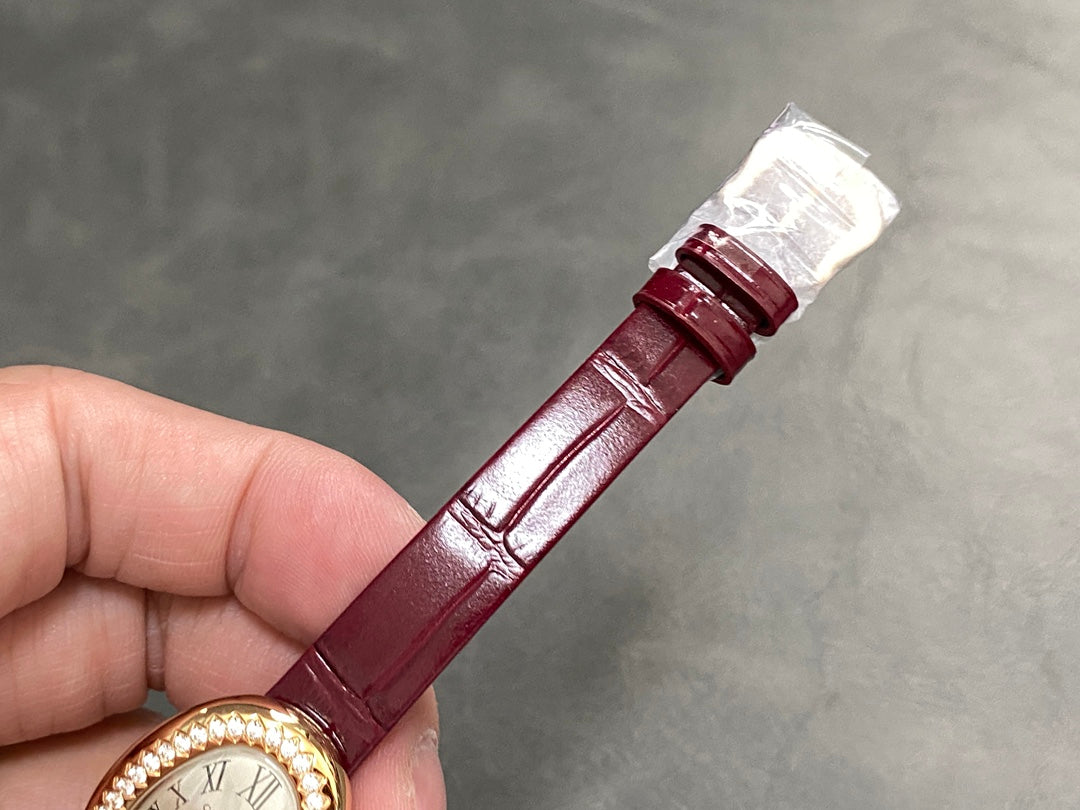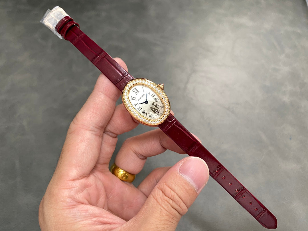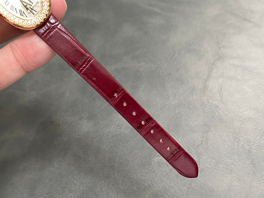 BAIGNOIRE MINI MODEL WATCH GOLD CASE WITH WINE RED LEATHER STRAP WITH CRYSTAL