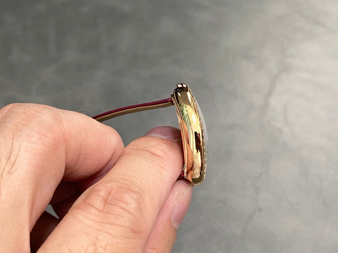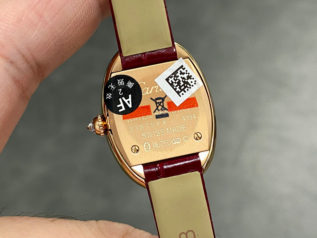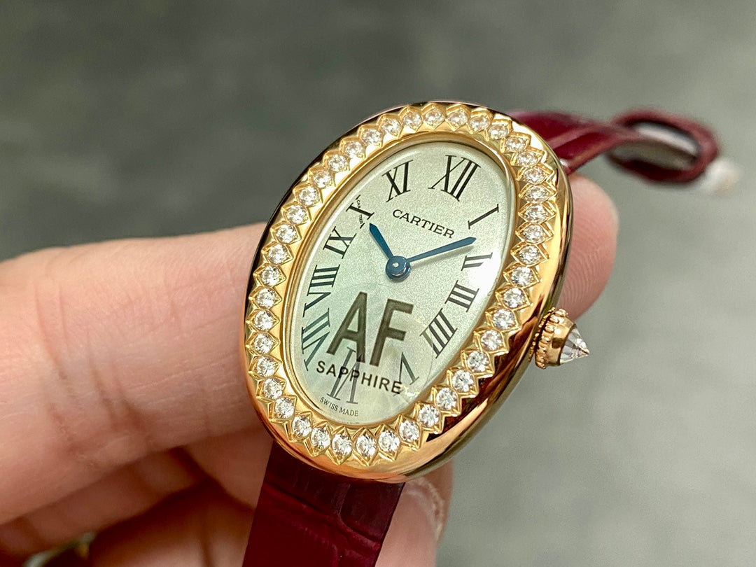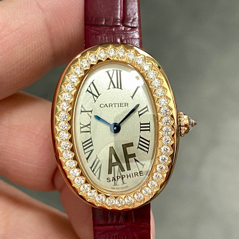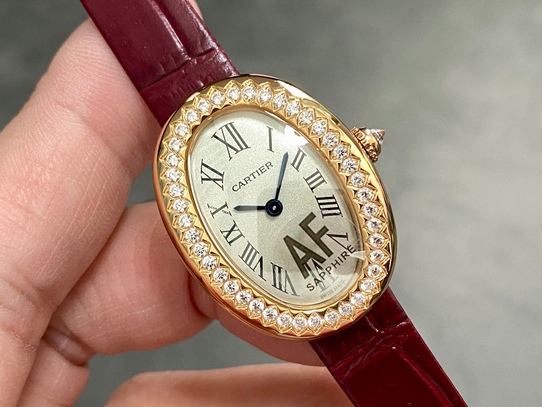BAIGNOIRE MINI MODEL WATCH GOLD CASE WITH WINE RED LEATHER STRAP WITH CRYSTAL