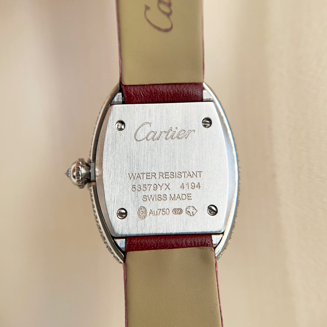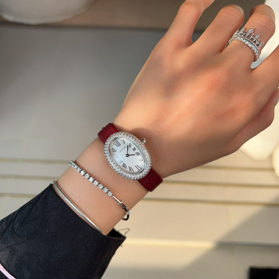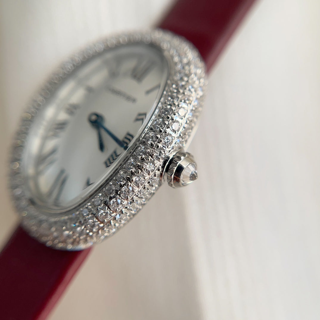 BAIGNOIRE WATCH SILVER CASE WITH CRYSTALS AND JAM RED LEATHER