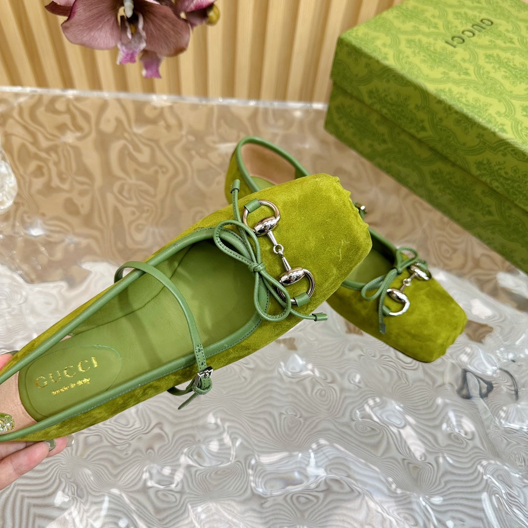 BALLET FLAT IN OLIVE GREEN SUEDE WITH SILVER HARDWARE