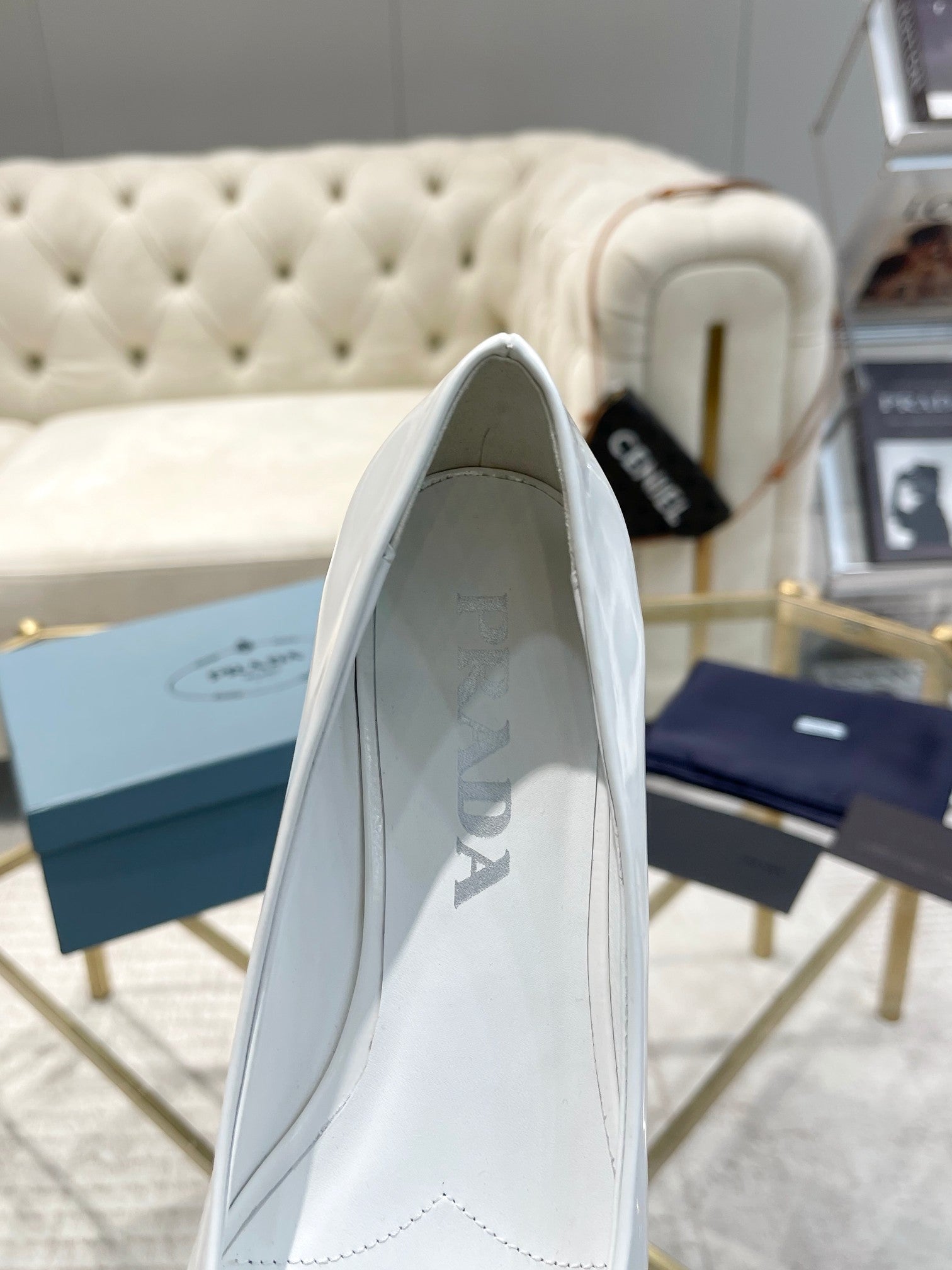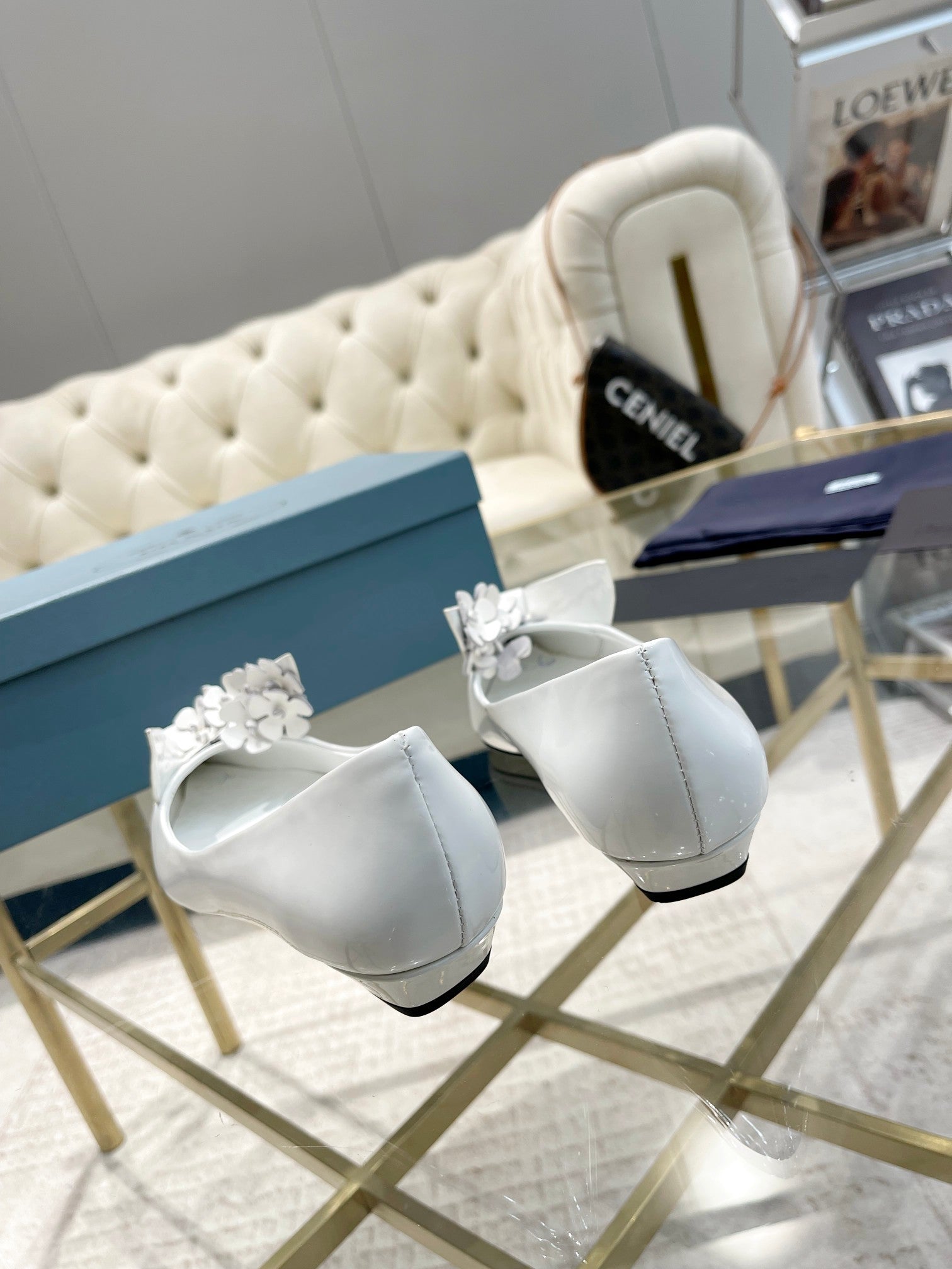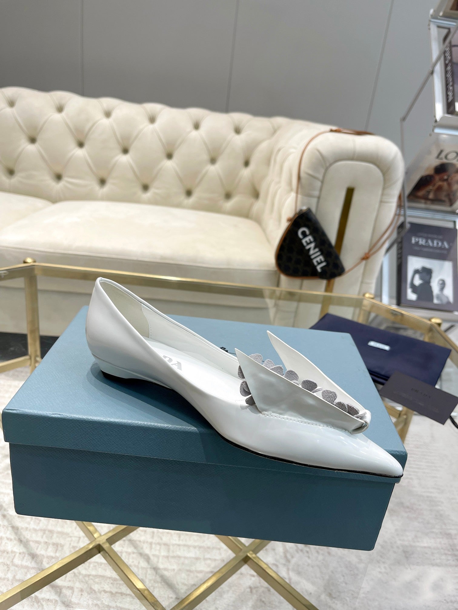 BALLET FLATS ATTACHED CREATIVE FLOWERS IN WHITE PATENT CALFSKIN