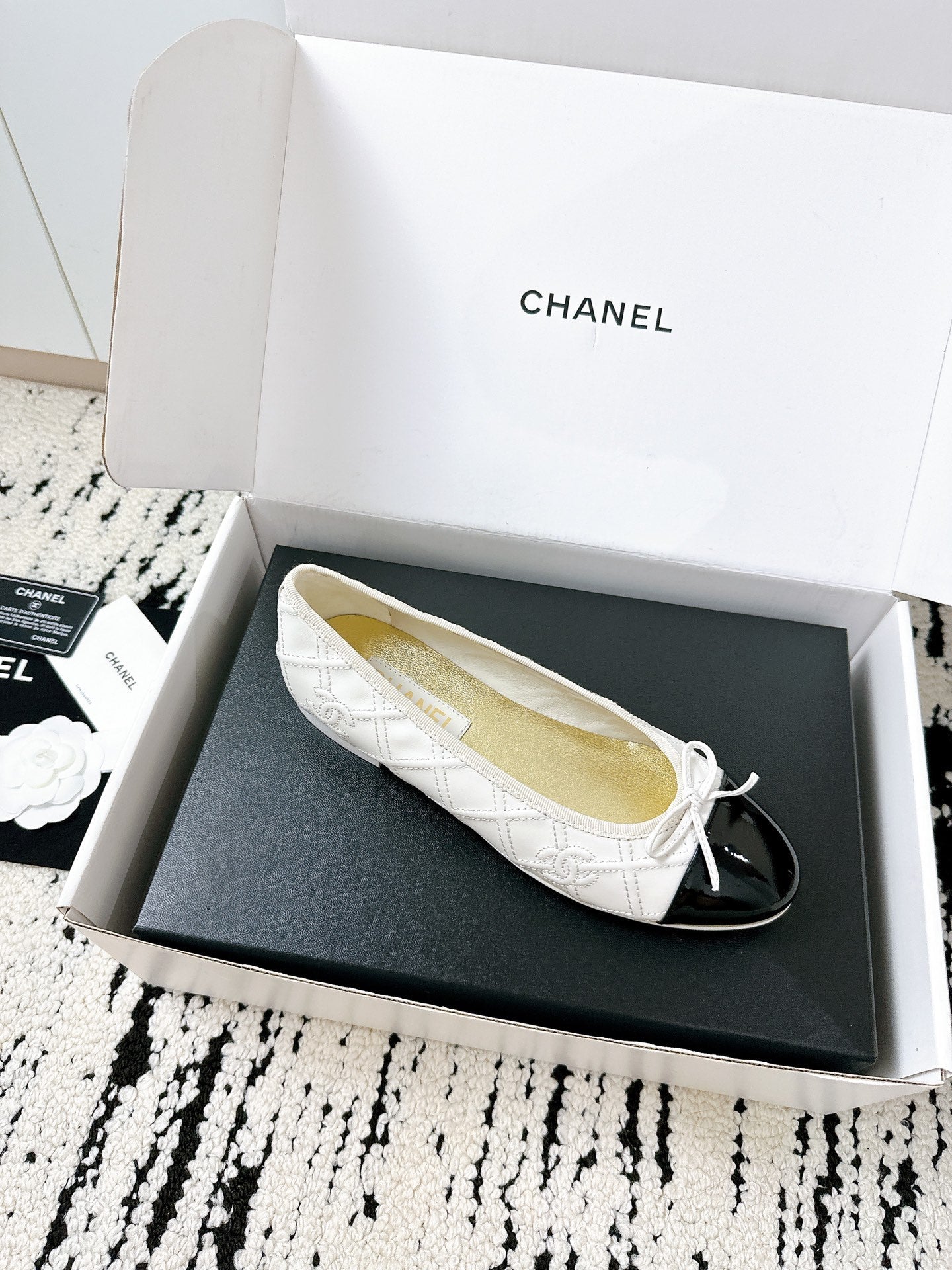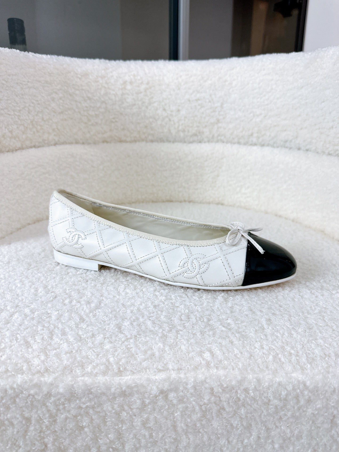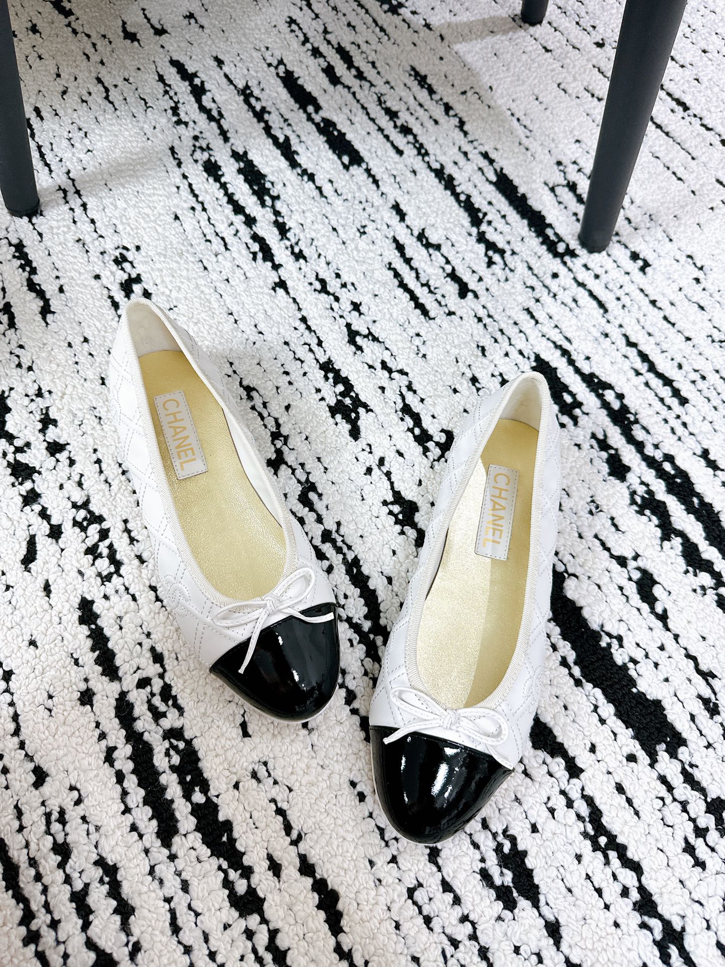 BALLET FLATS BOW IN WHITE CALFSKIN QUILTED AND BLACK GLOSSY