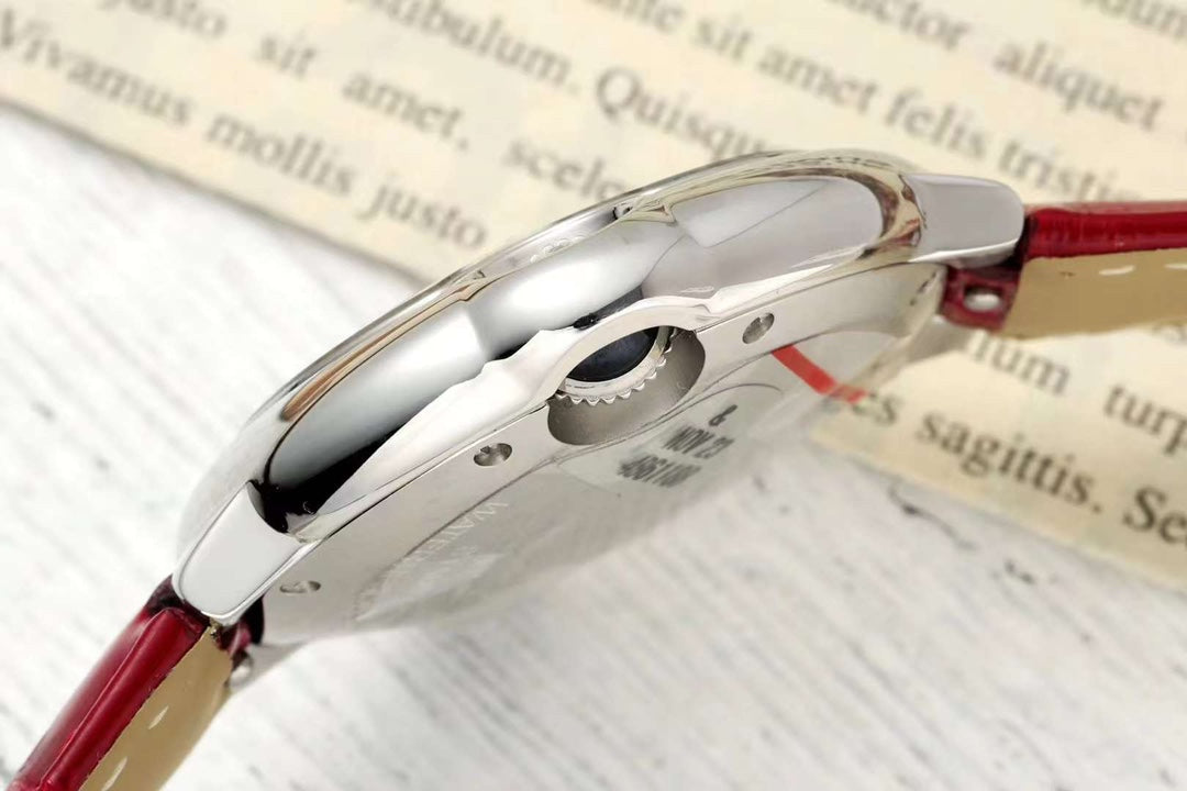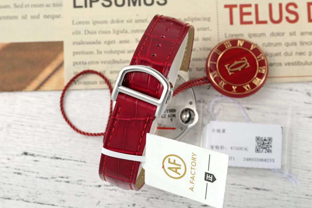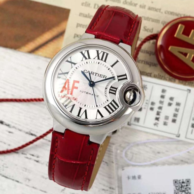 BALLON BLEU DE CARTIER 33 MM WATCH SILVER CASE WITH RUBY RED LEATHER STRAP