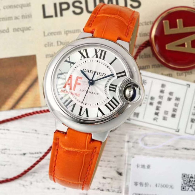 BALLON BLEU DE CARTIER 33 MM WATCH SILVER CASE WITH VIVID ORANGE LEATHER STRAP