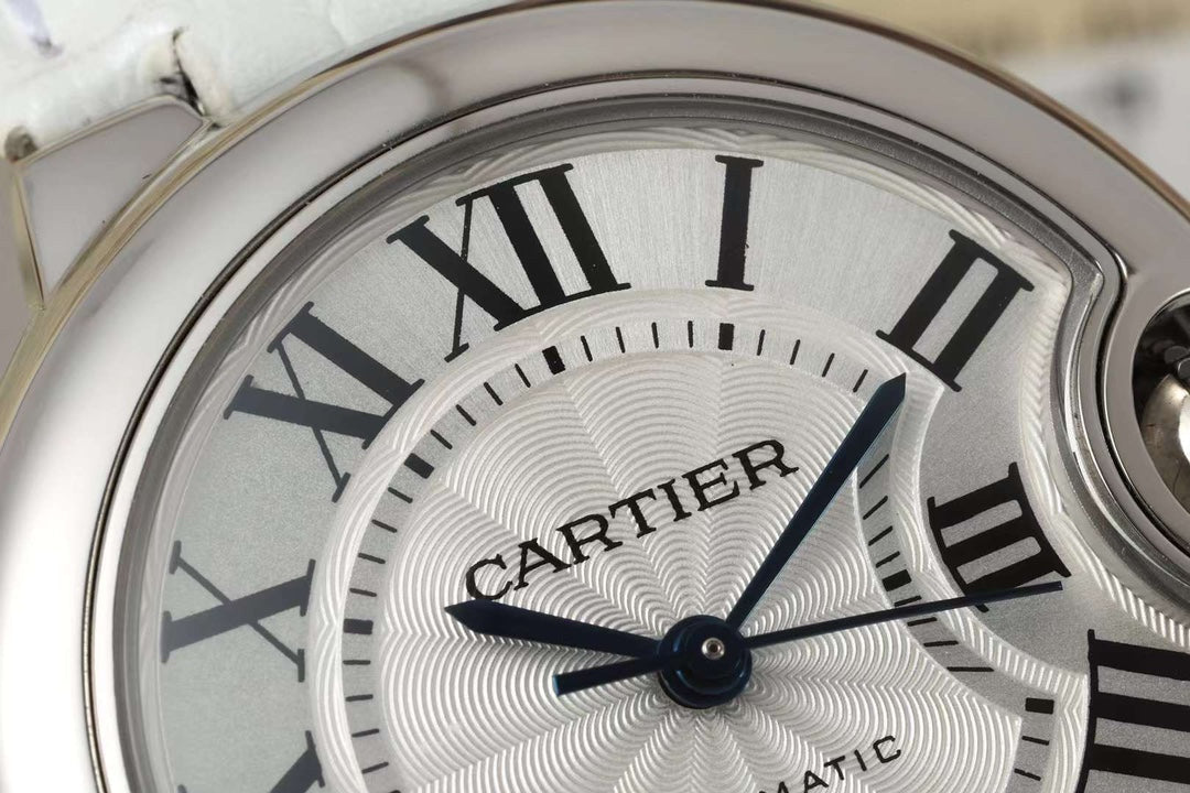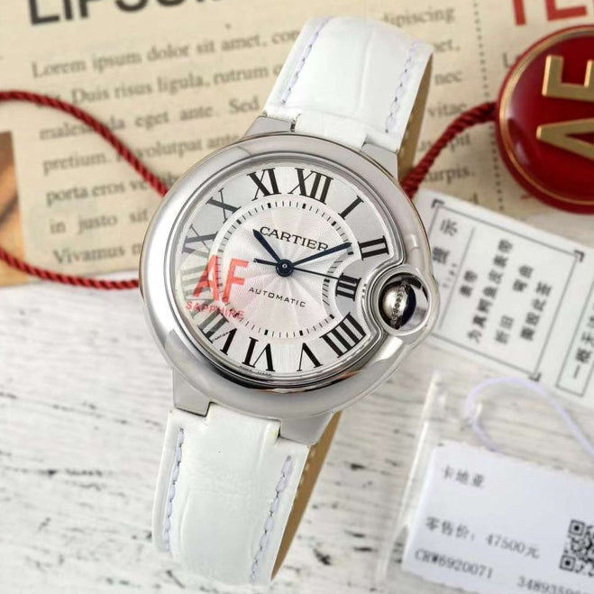 BALLON BLEU DE CARTIER 33 MM WATCH SILVER CASE WITH WHITE LEATHER STRAP