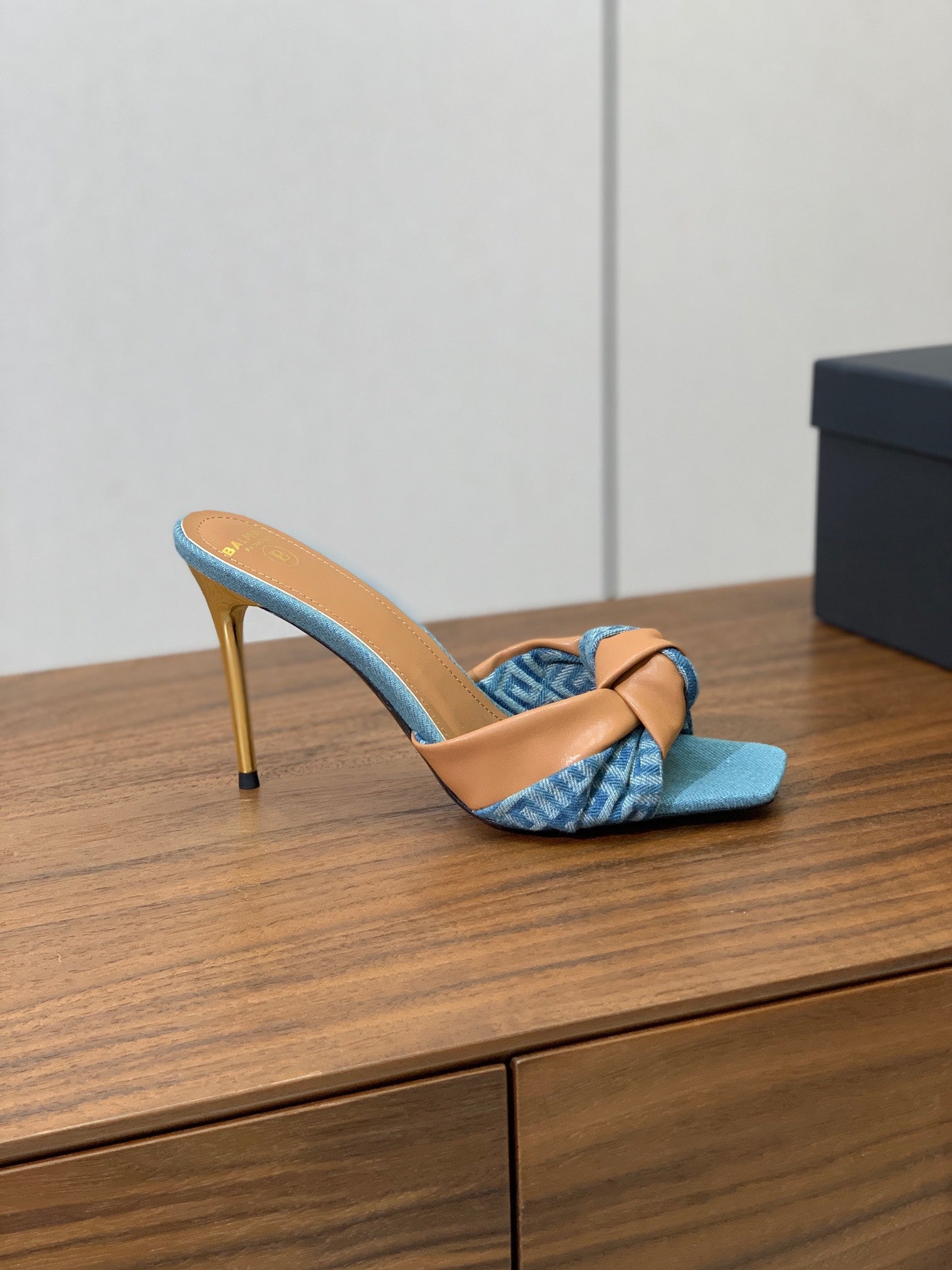 BALMAIN 25S HIGH HEEL MULES 95MM IN WARM CARAMEL DENIM AND CALFSKIN