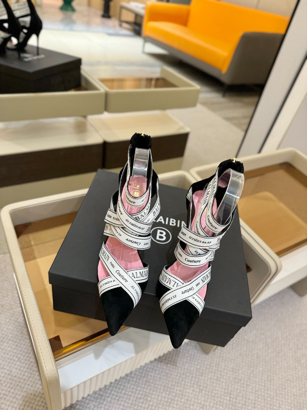 BALMAIN 25S HIGH HEELS LOGO RIBBON 95MM IN BLACK AND WHITE SUEDE