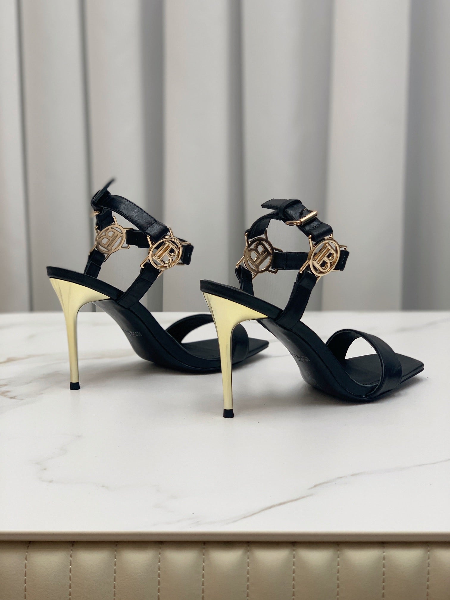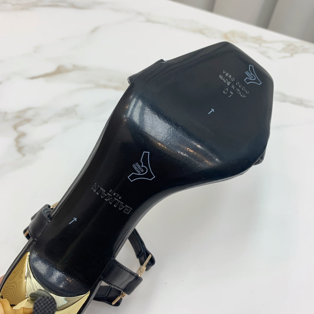 BALMAIN 25S HIGH HEELS WITH B METAL DETAIL 95MM IN BLACK CALFSKIN
