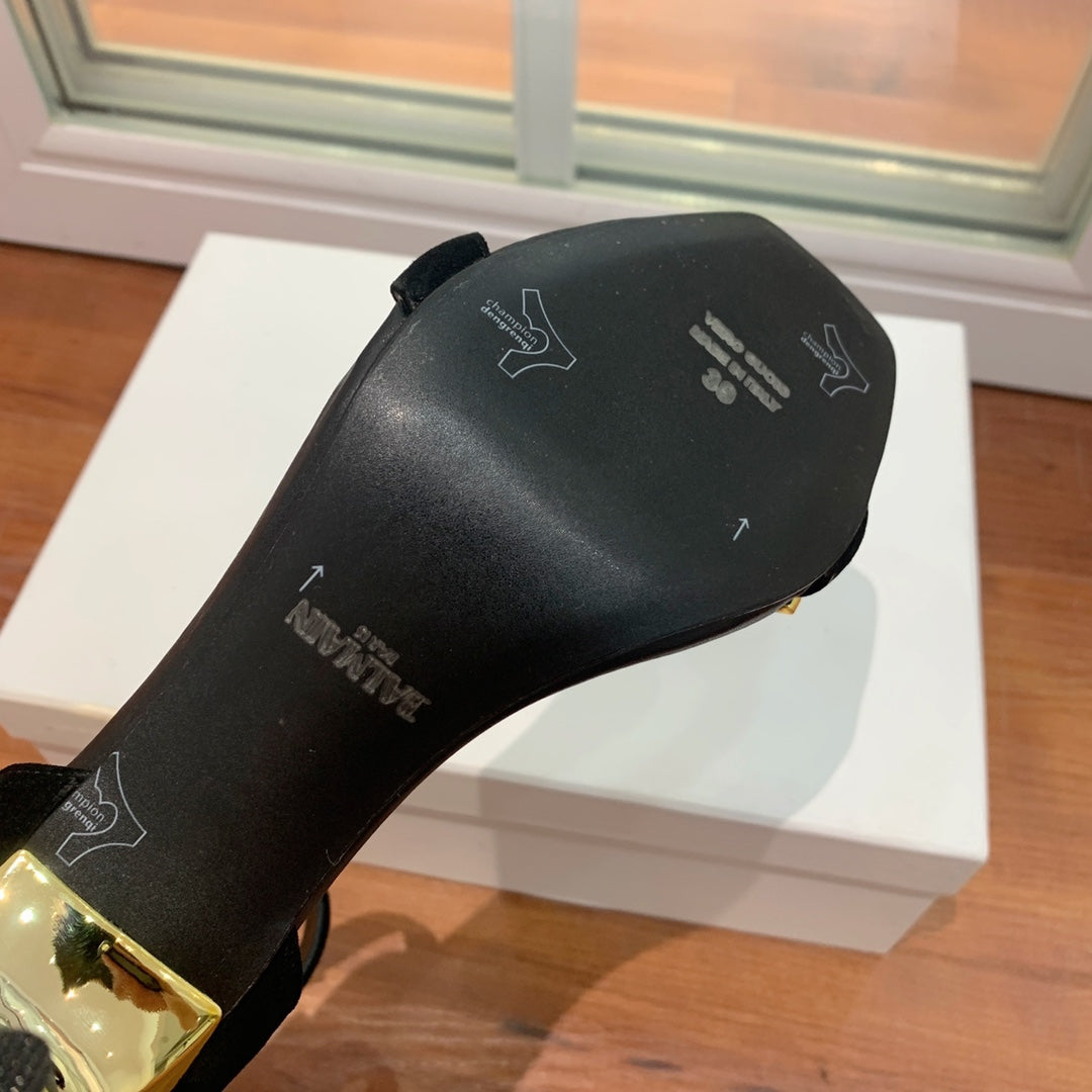 BALMAIN 25S METAL STRAP HIGH HEELS 95MM IN BLACK SUEDE GOLD HARDWARE