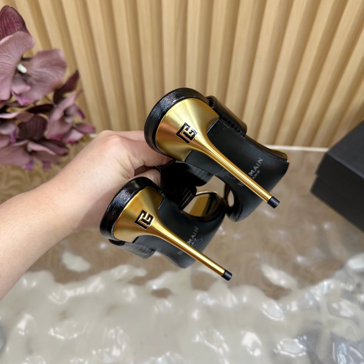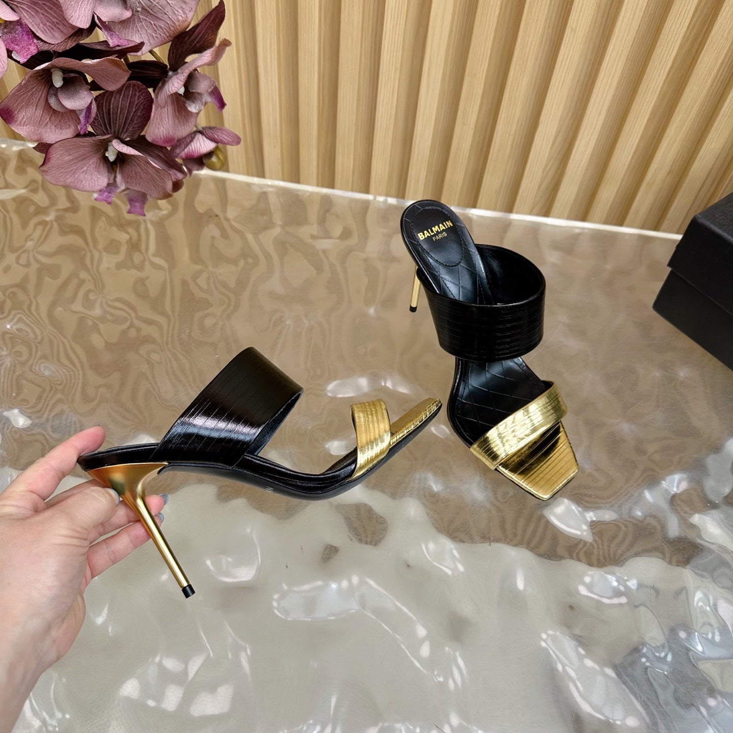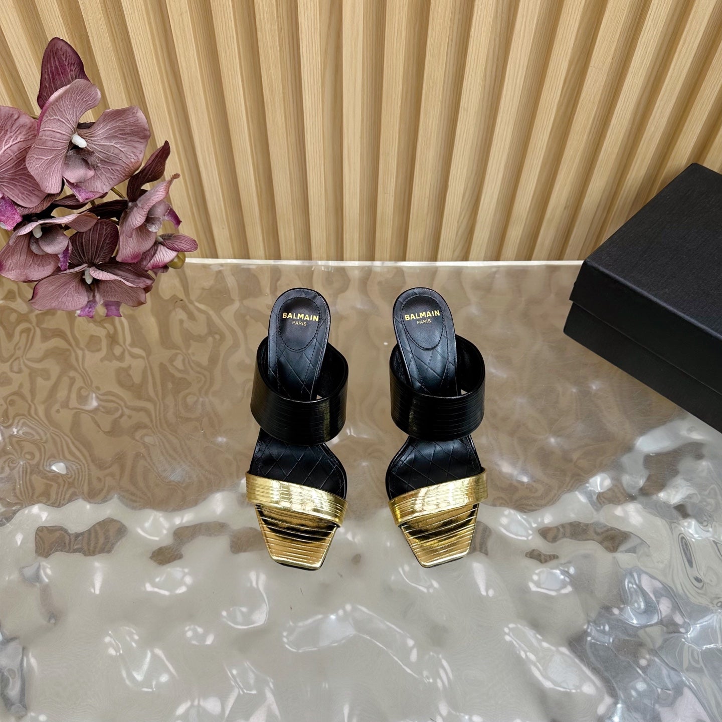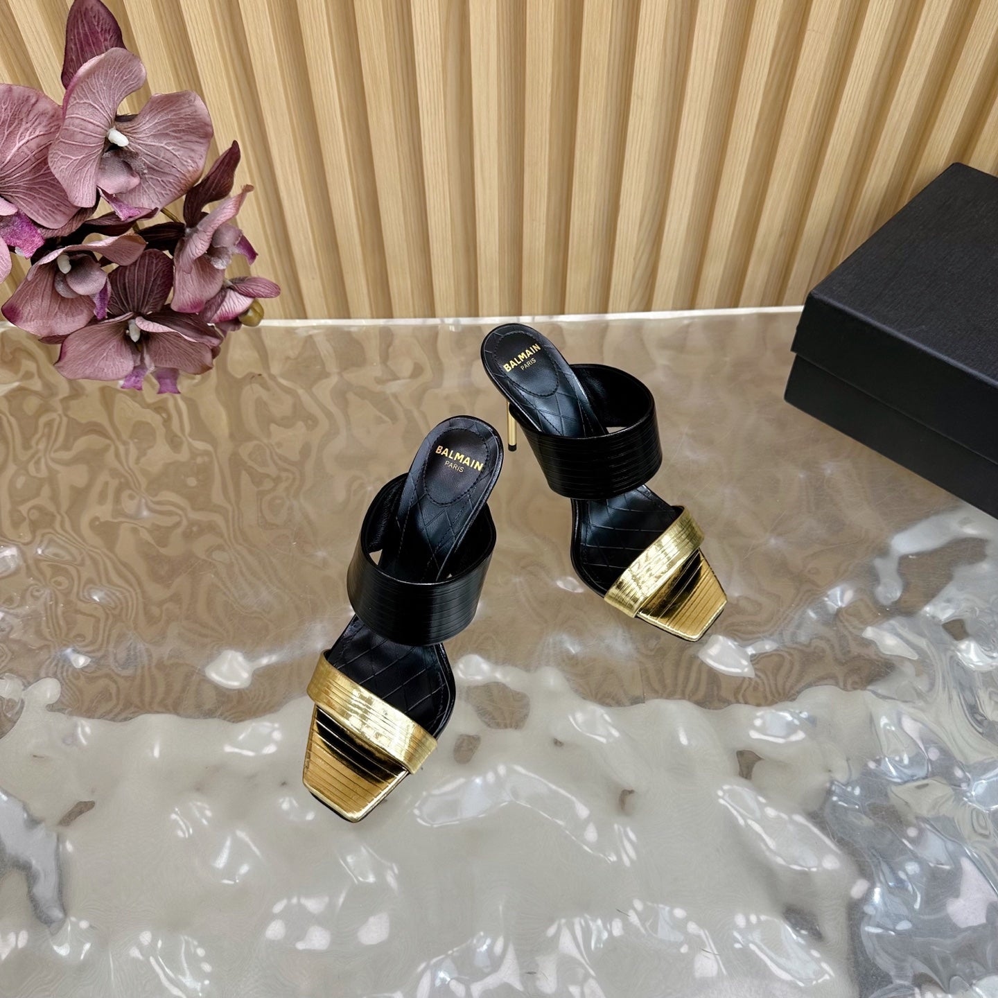 BALMAIN 25S MULES IN STRIPED LEATHER 95MM IN BLACK AND GOLD CALFSKIN