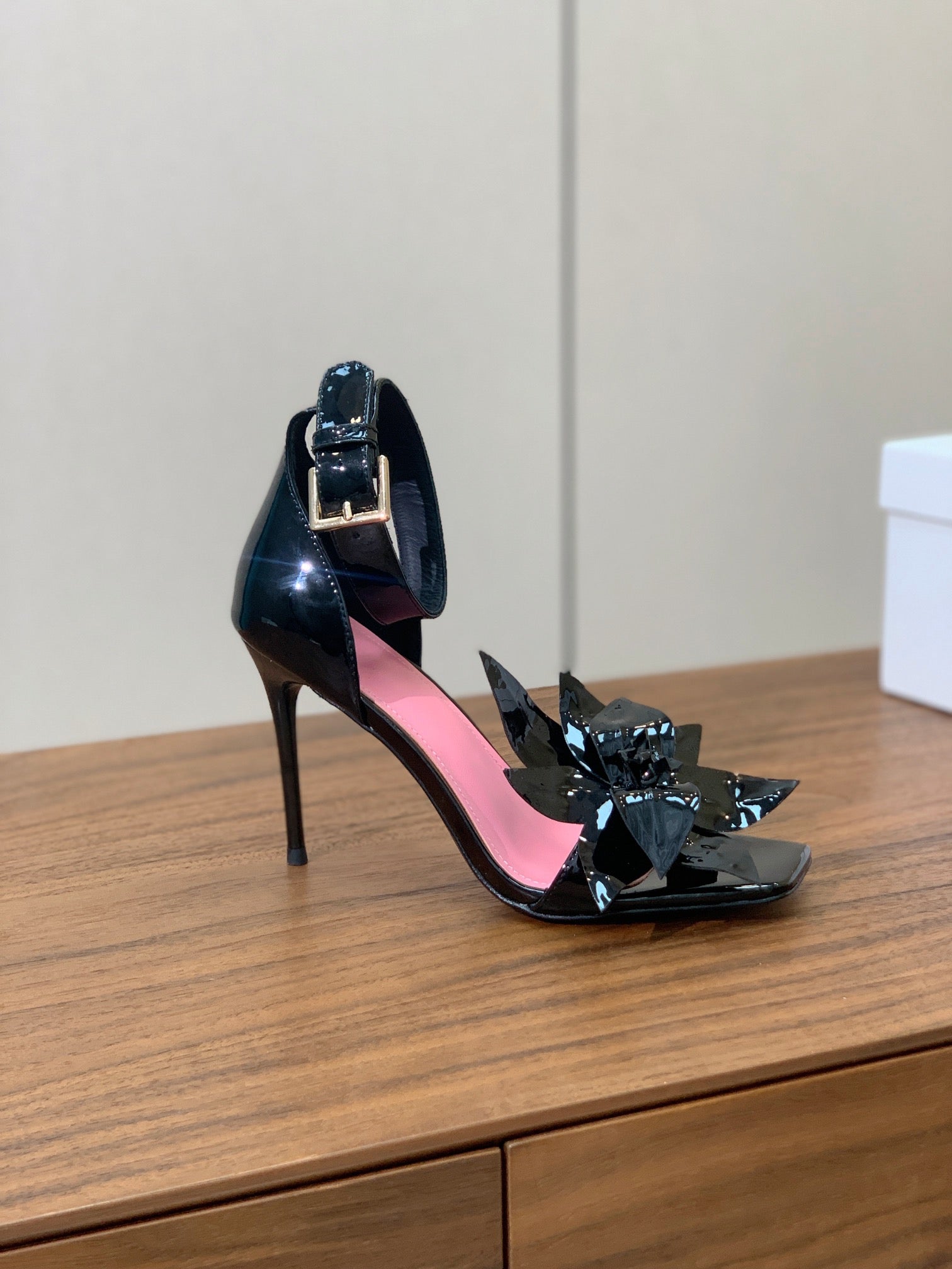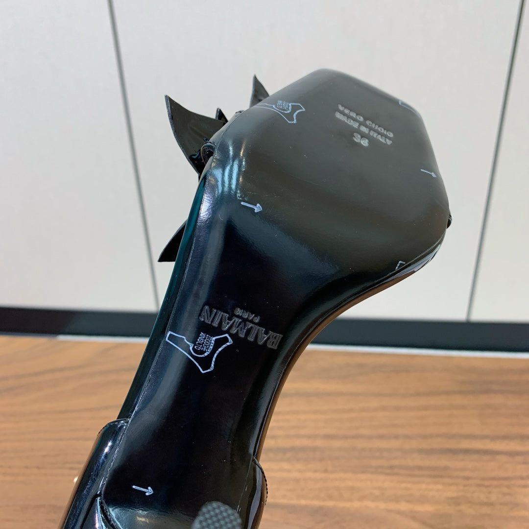 BALMAIN 25S RUBY BLACK HEELED SANDALS 95MM IN PATENT CALFSKIN