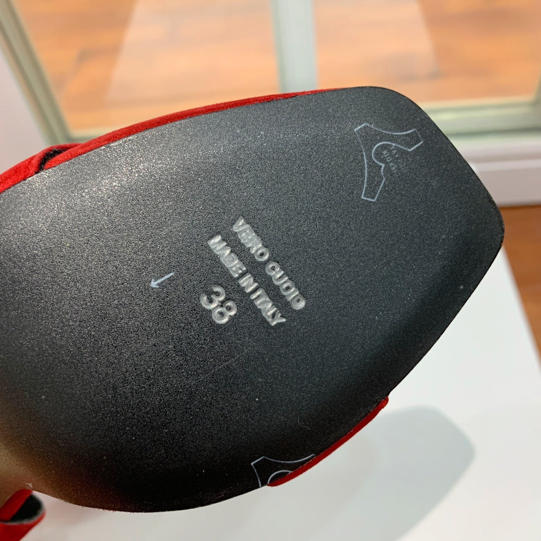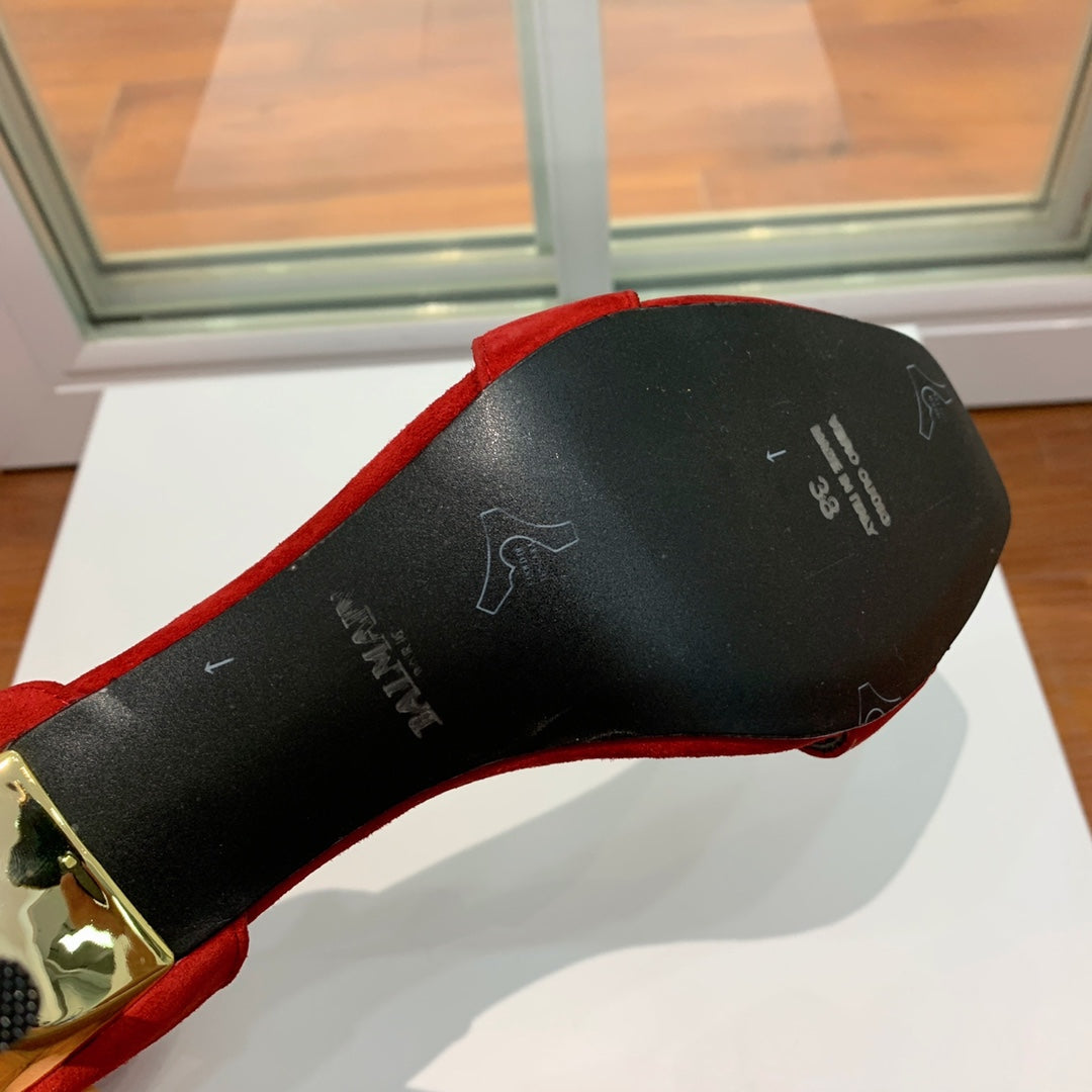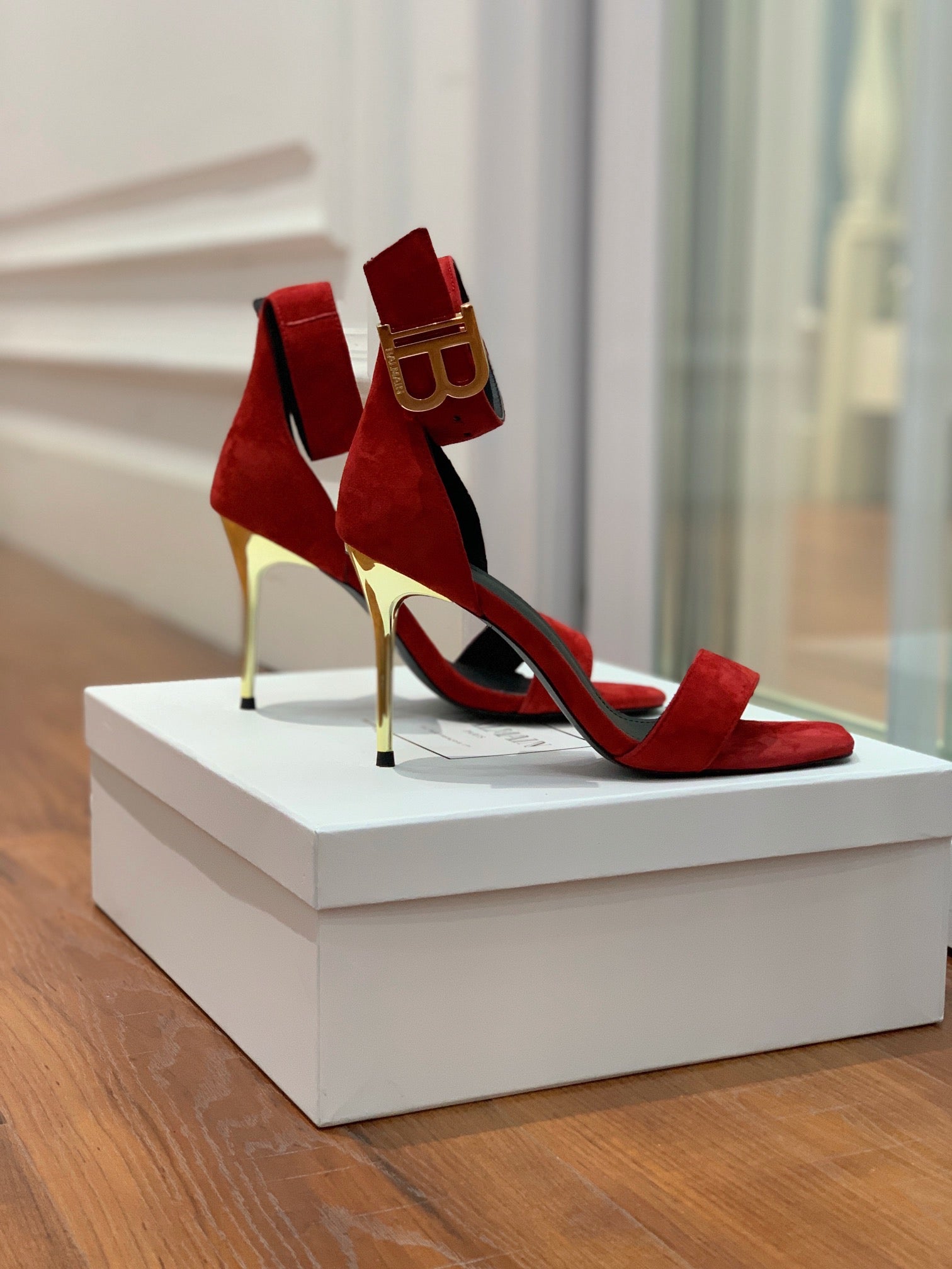 BALMAIN 25S THIN STRAP HIGH HEELS 105MM IN DARK RED SUEDE GOLD HARDWARE