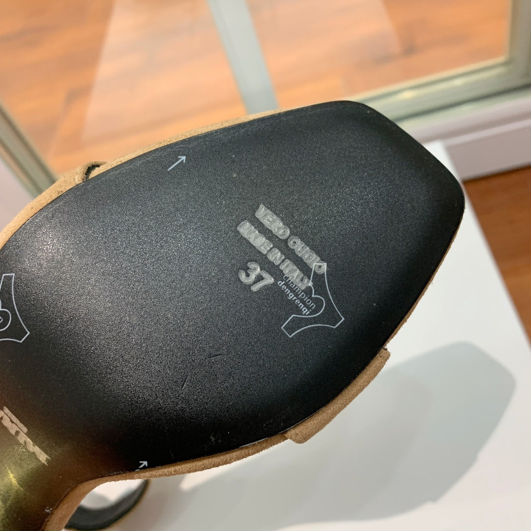 BALMAIN 25S THIN STRAP HIGH HEELS 105MM IN LIGHT MOCHA SUEDE GOLD HARDWARE