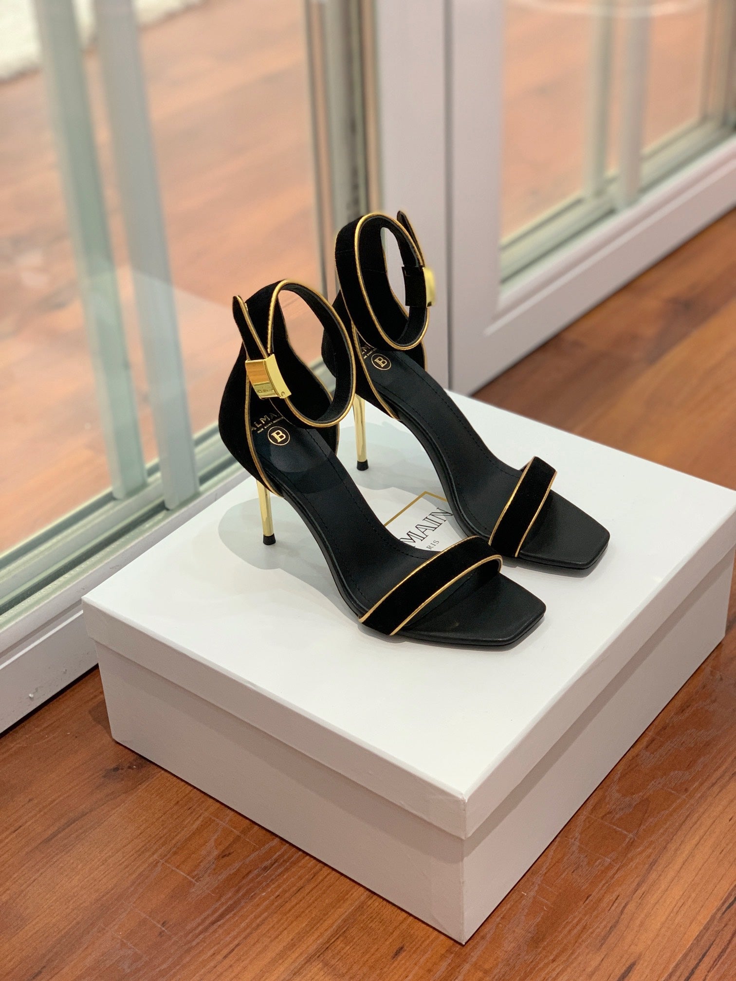 BALMAIN 25S UMA HEELED SANDALS 105MM IN BLACK SUEDE GOLD HARDWARE