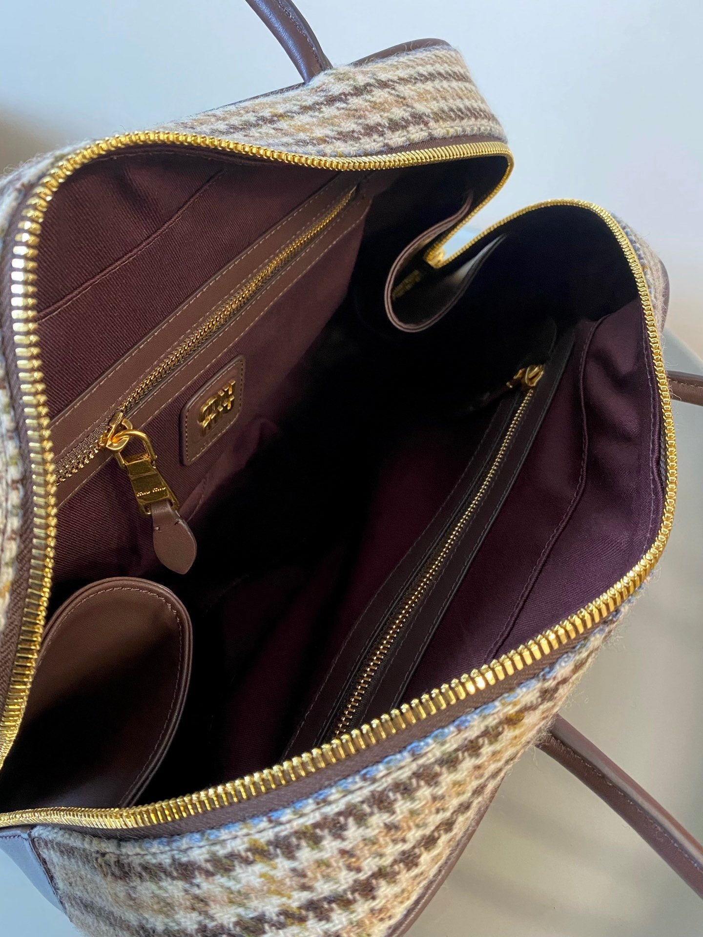 BEAU TOP HANDLE BAG 34 IN BEIGE TARTAN AND COCOA BROWN LEATHER TRIM