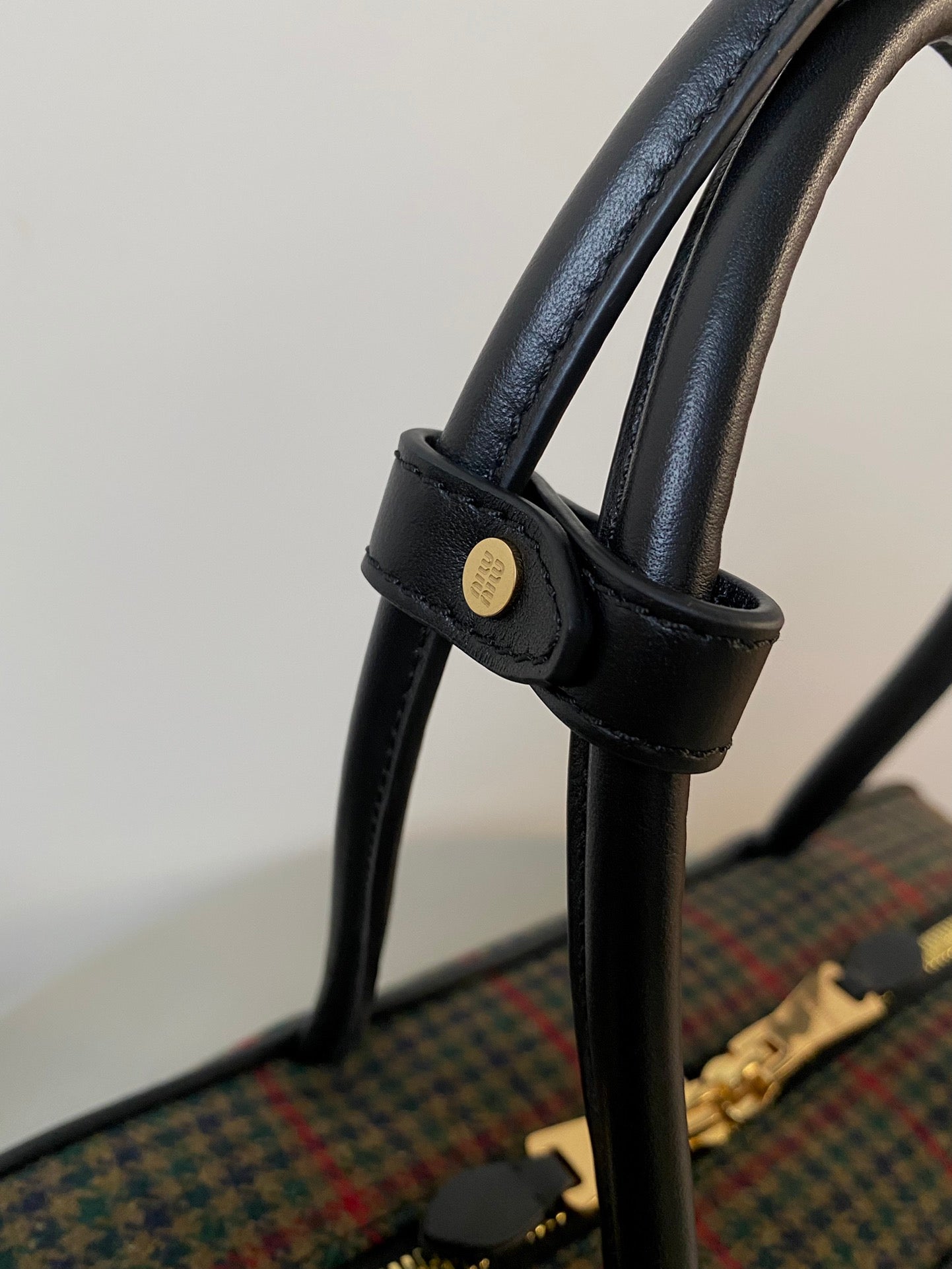 BEAU TOP HANDLE BAG 34 IN LODEN GREEN TARTAN AND BLACK LEATHER TRIM