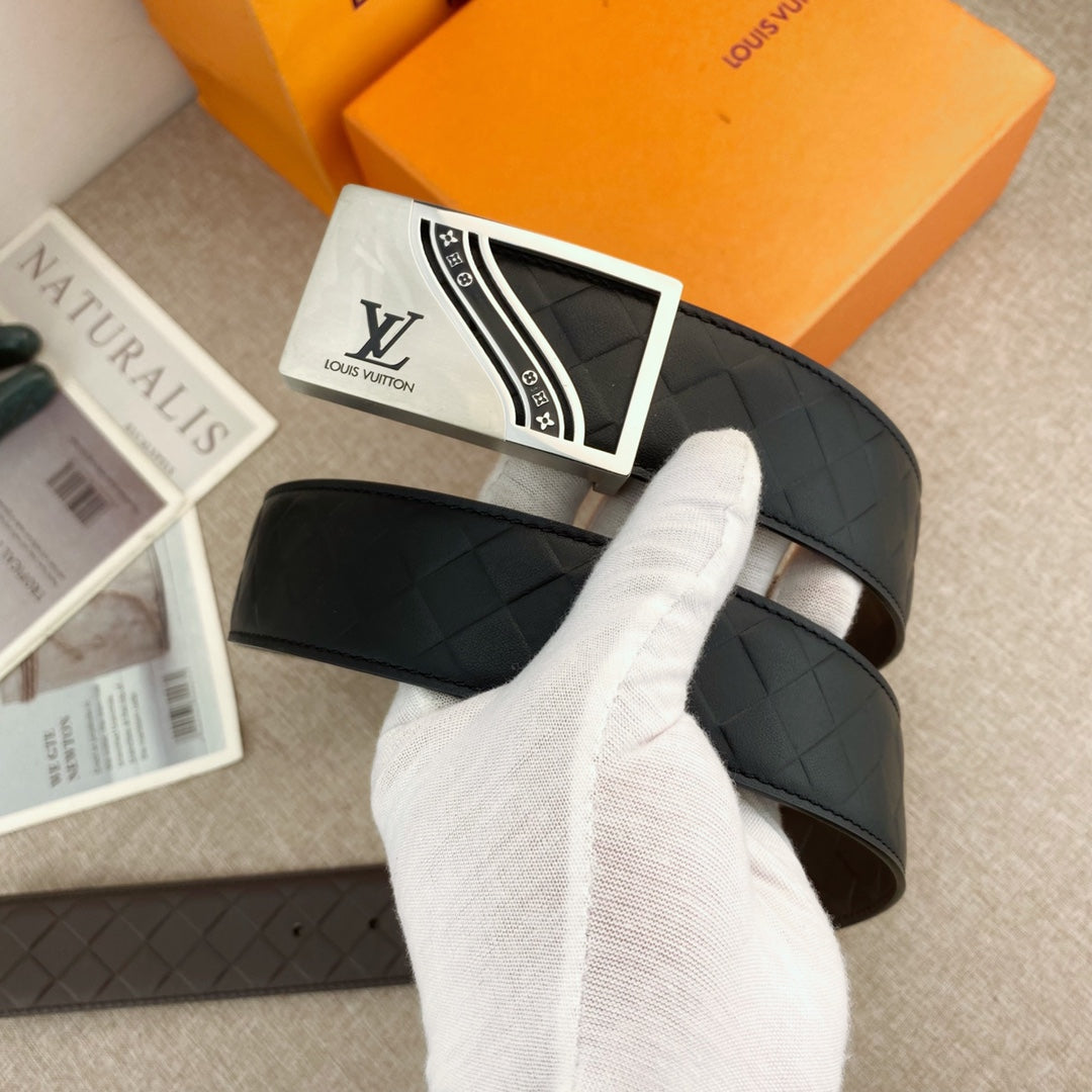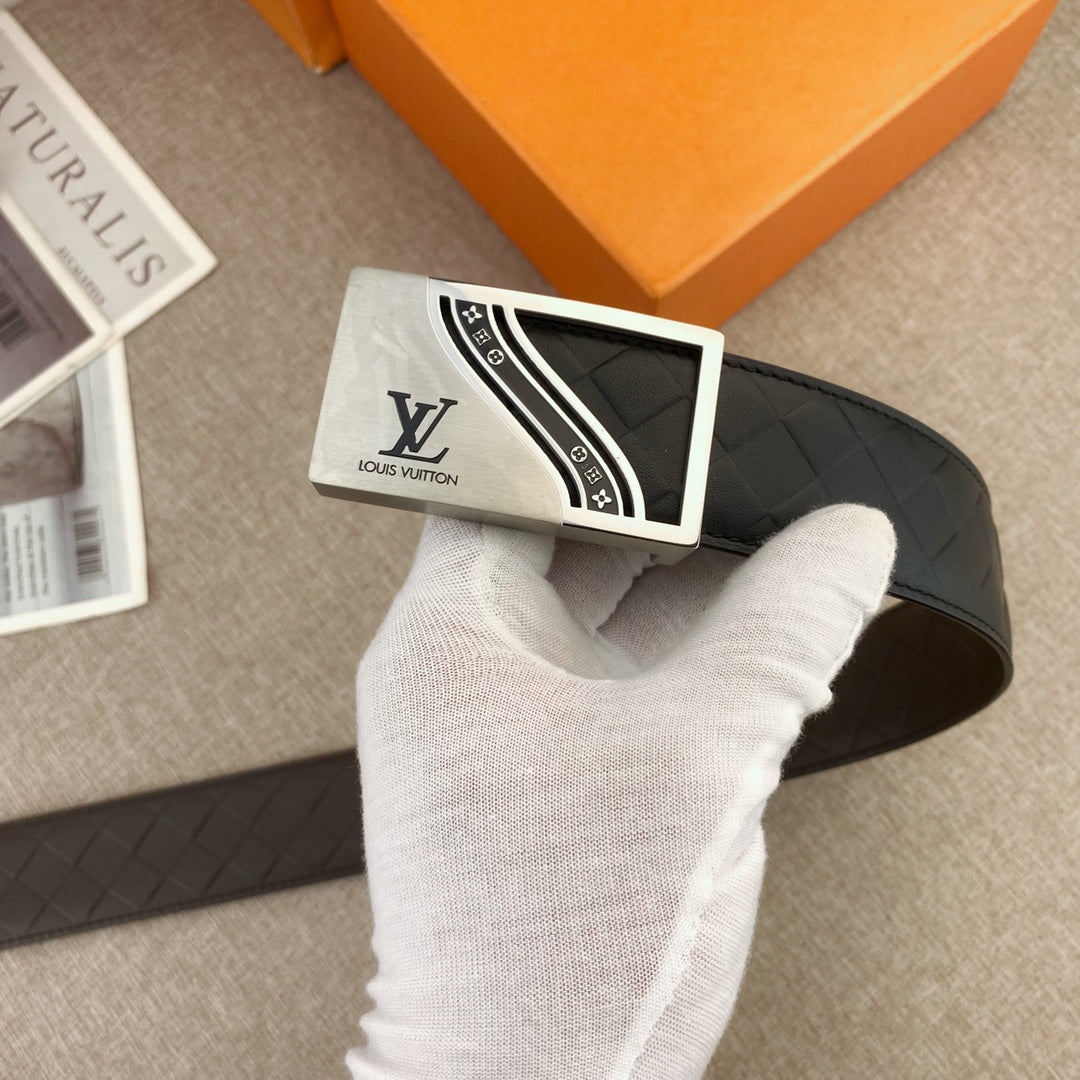 BELT 38MM IN BLACK CALFSKIN EMBOSSED CHECKERED CALFSKIN SILVER BUCKLE WITH BLACK RAISED LOGO