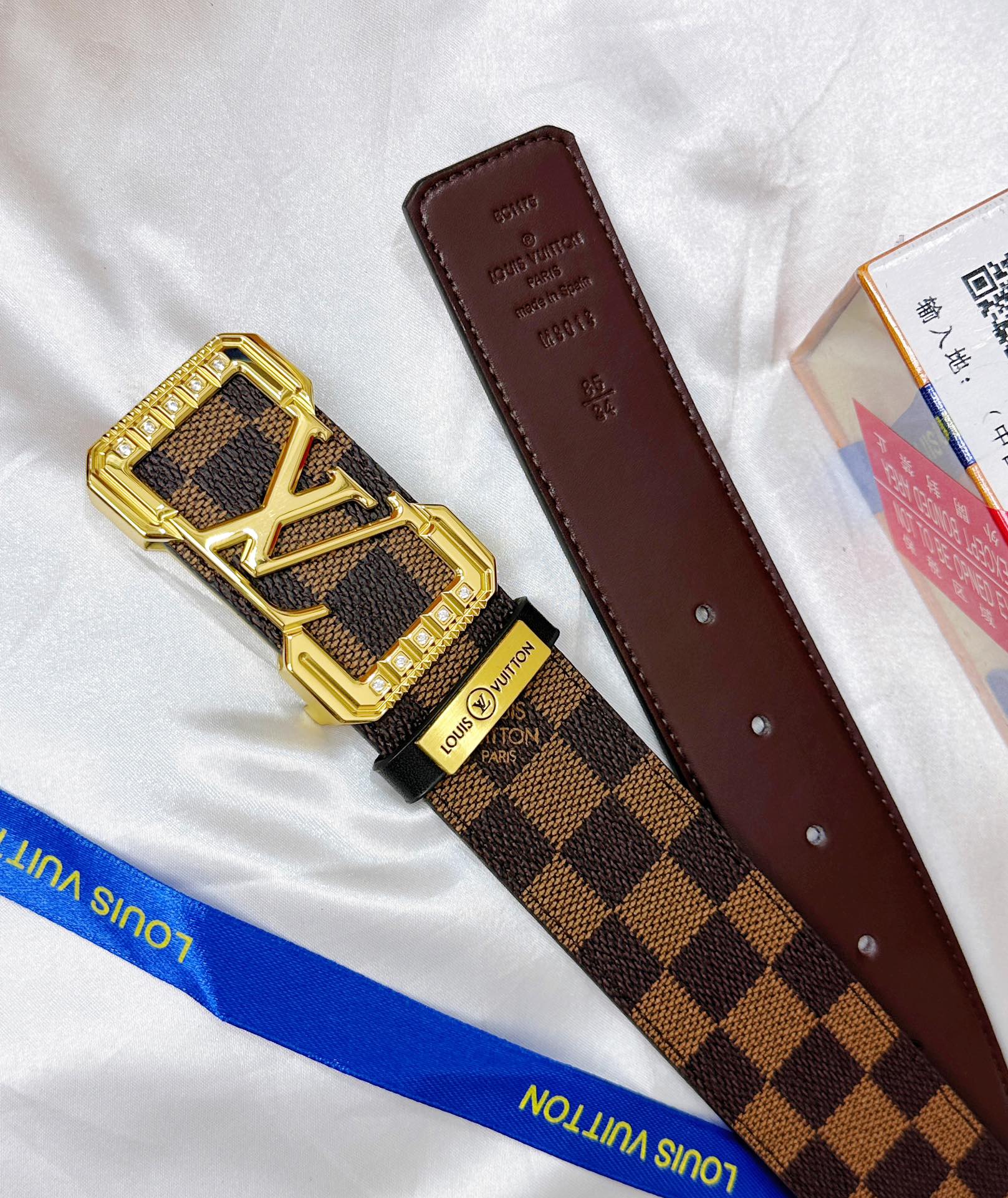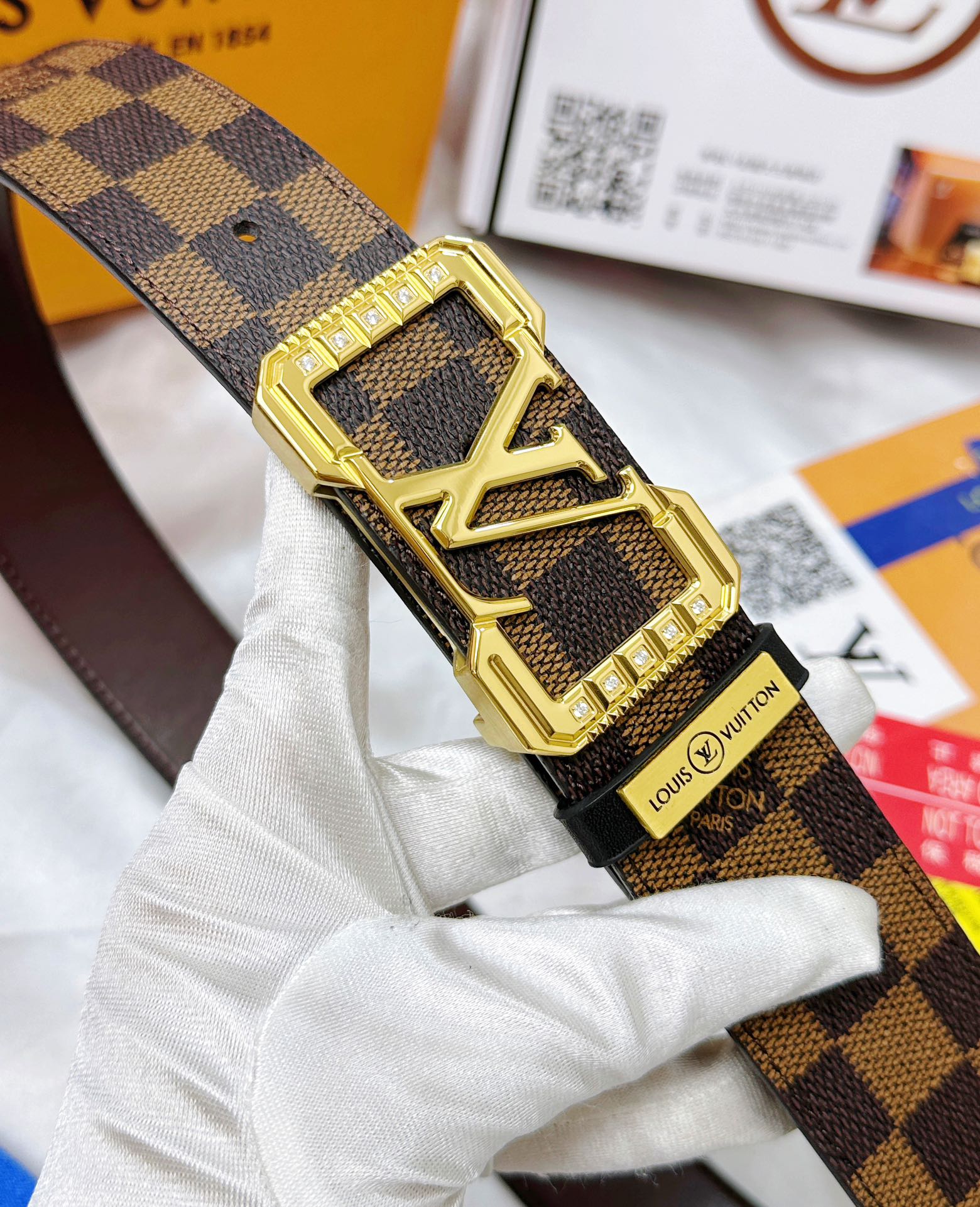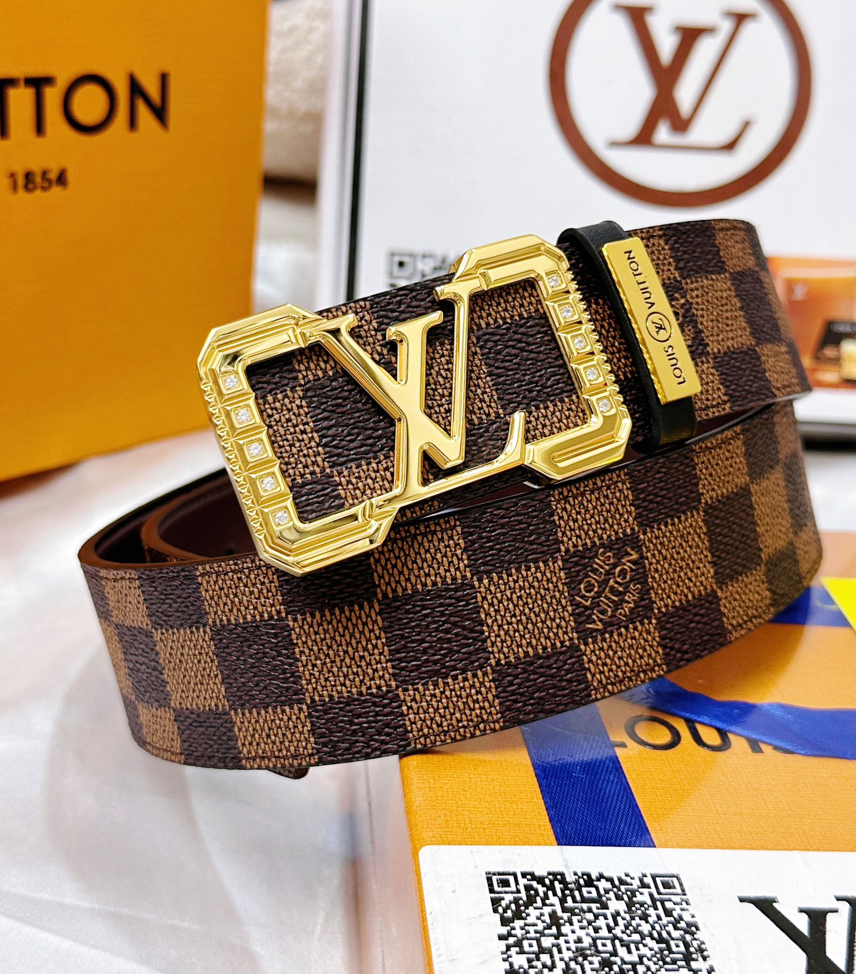 BELT 38MM REVERSIBLE IN BROWN CHECKERED PATTERN WITH GOLD PAVE BUCKLE