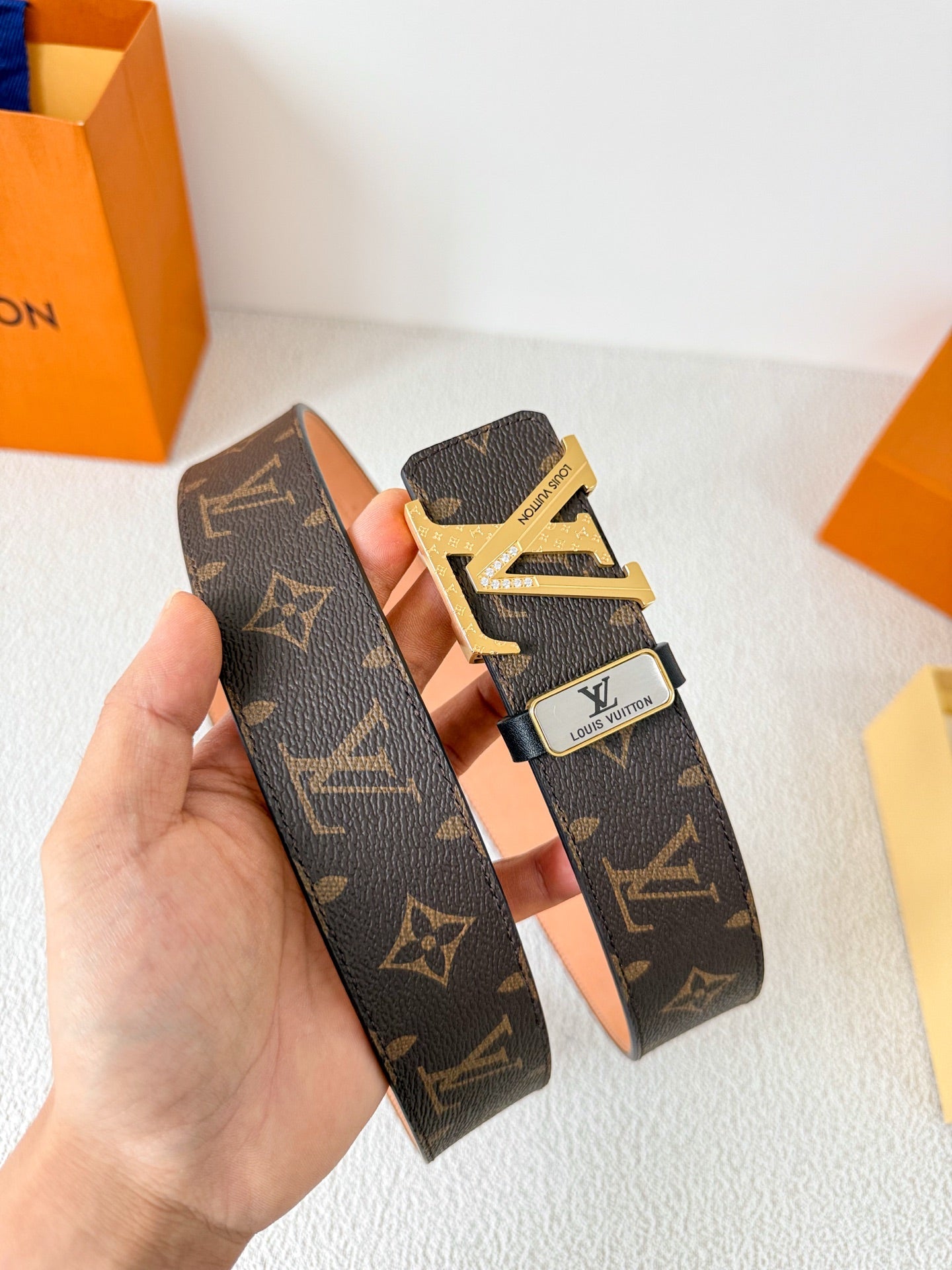 BELT 38MM REVERSIBLE IN BROWN MONOGRAM CALFSKIN WITH GOLD DIAMOND EMBELLISHED BUCKLE