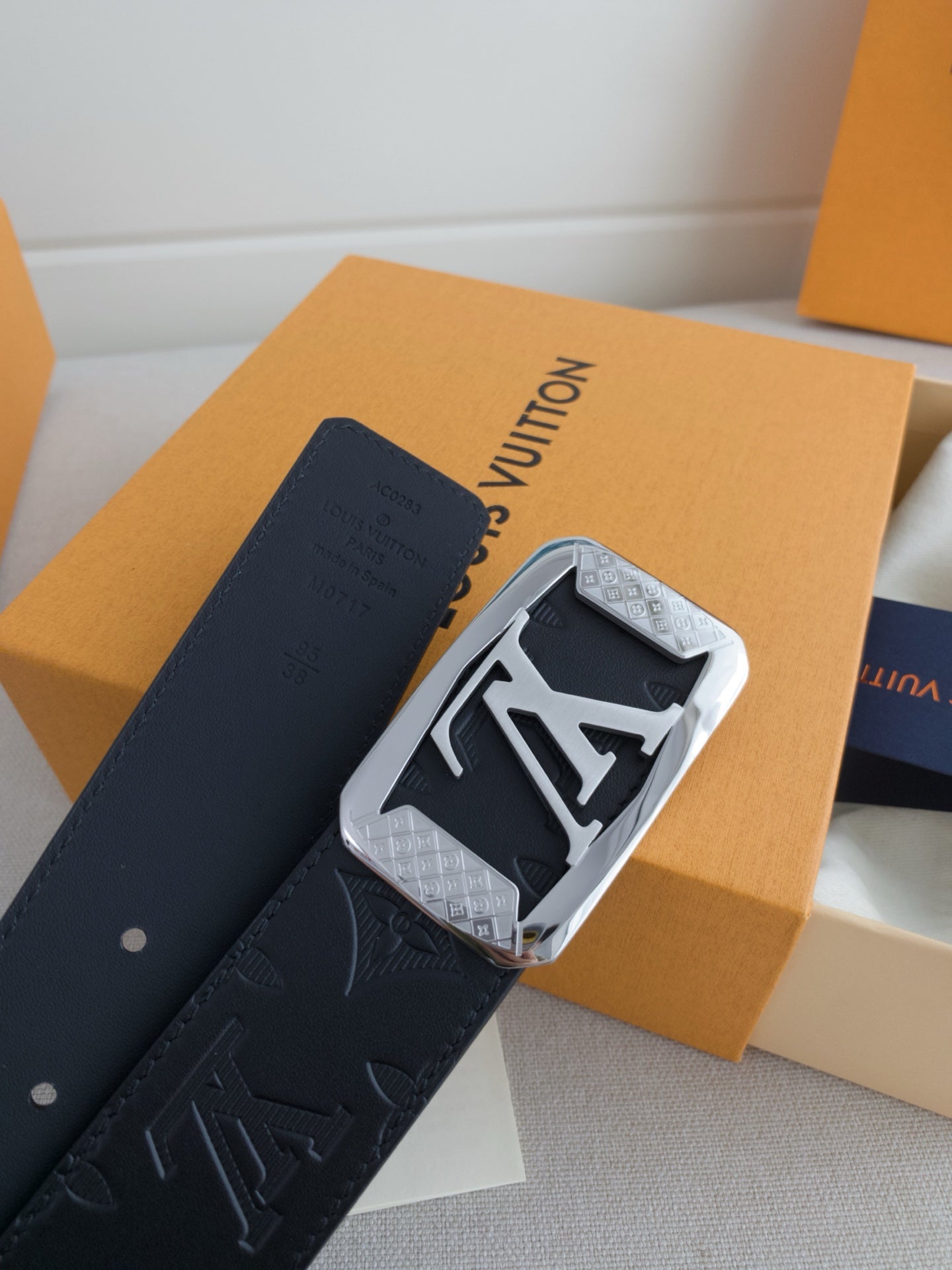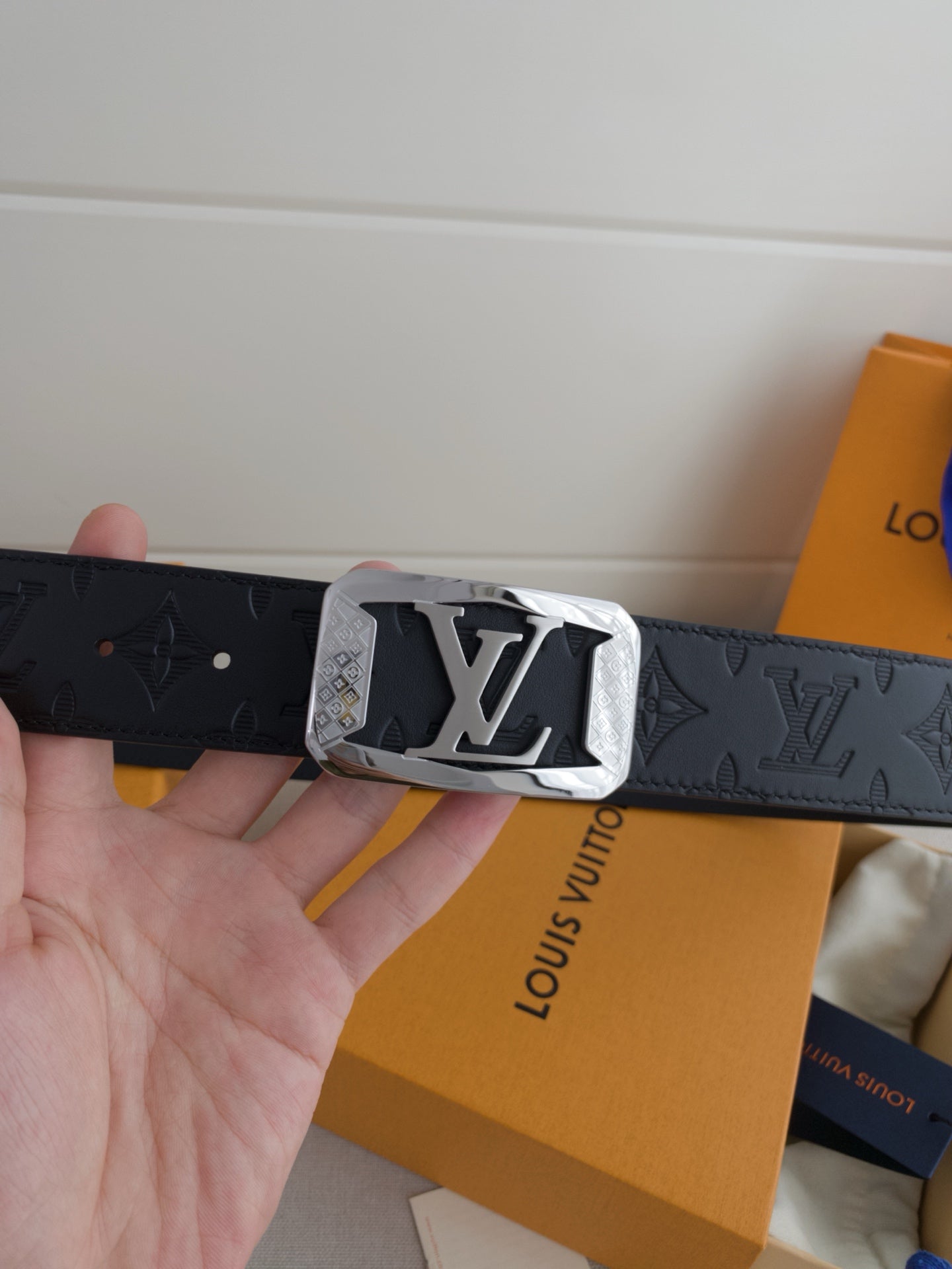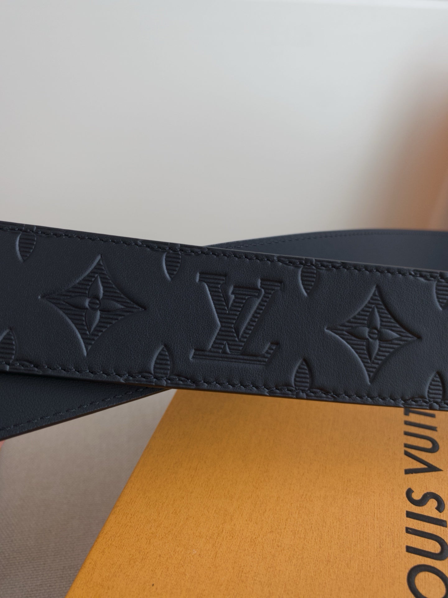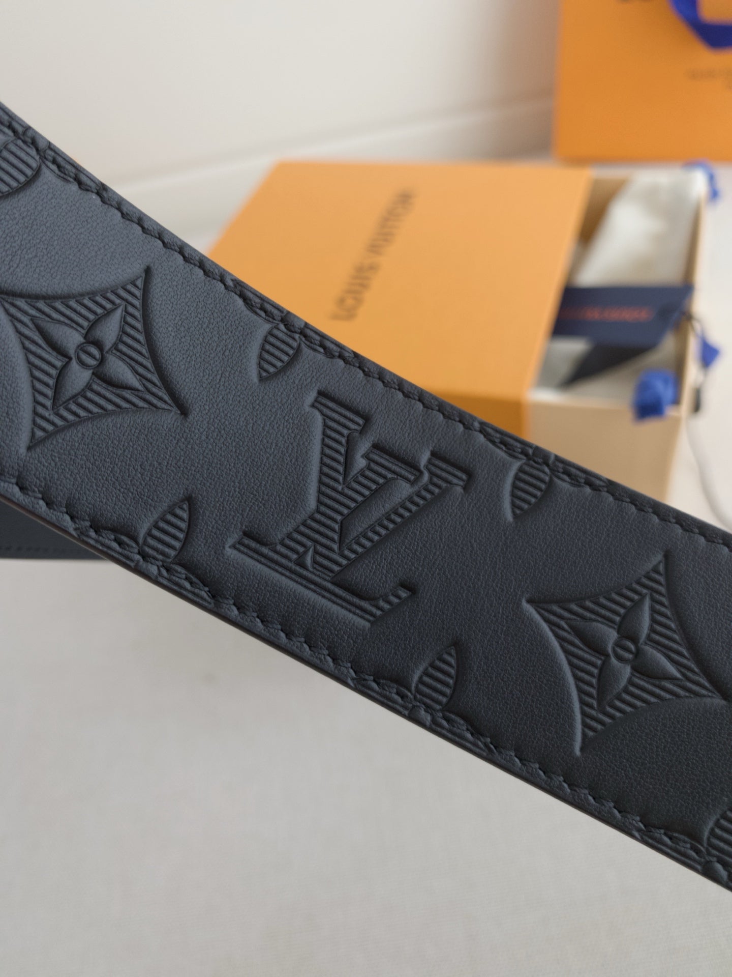 BELT 40MM REVERSIBLE IN BLACK TAURILLON CALFSKIN WITH GREY LOGO AND SILVER LV BUCKLE