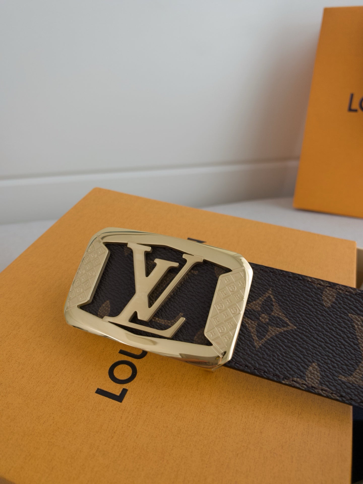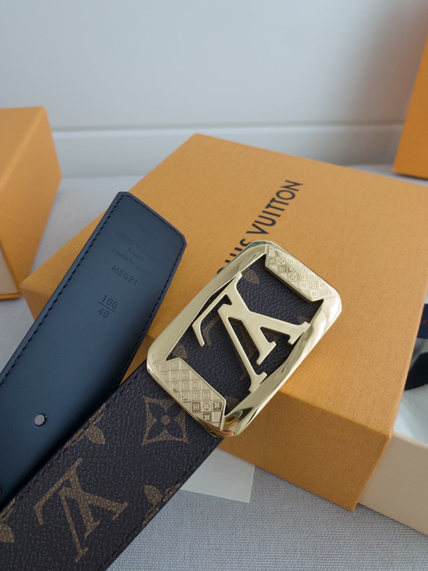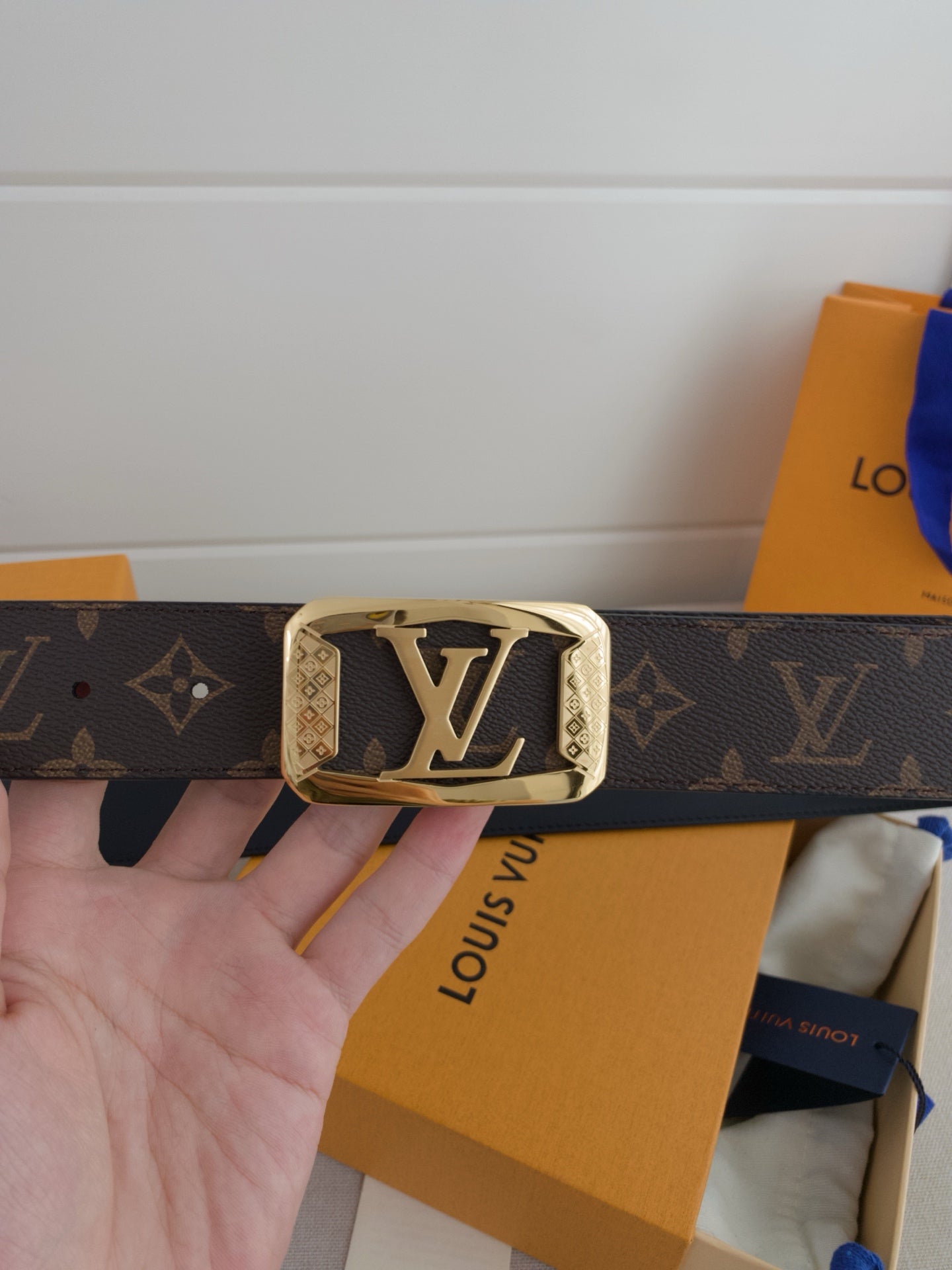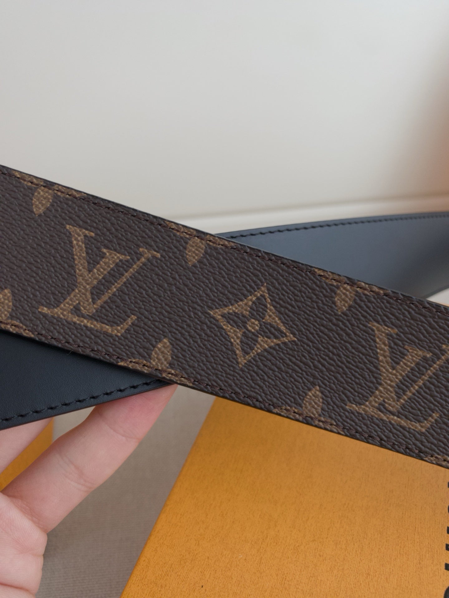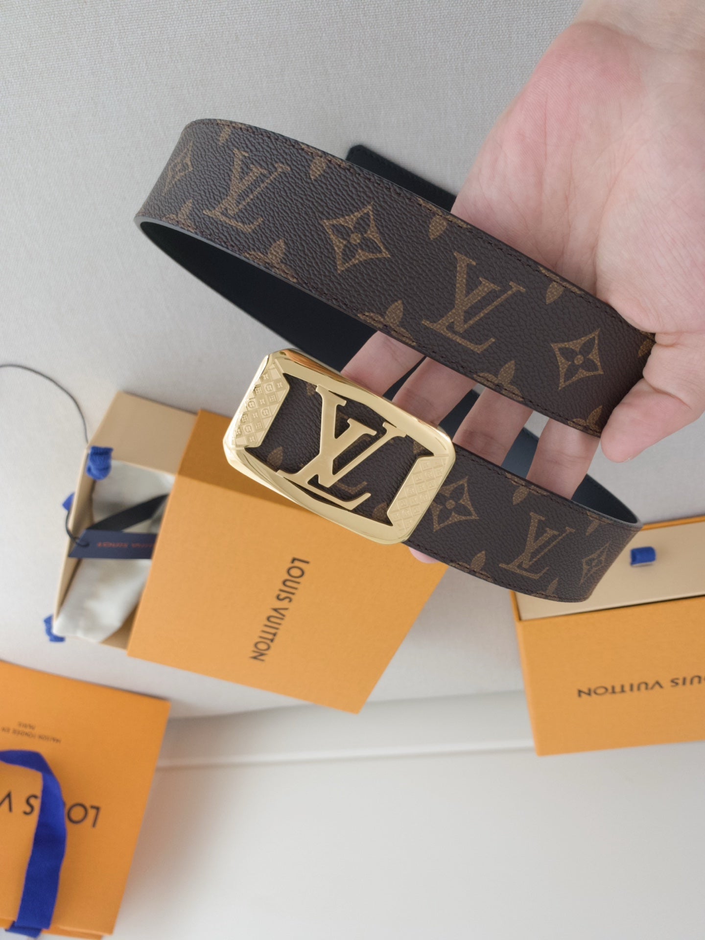 BELT 40MM REVERSIBLE IN BROWN AND BLACK TAURILLON CALFSKIN WITH LOGO PRINT AND GOLD LV BUCKLE