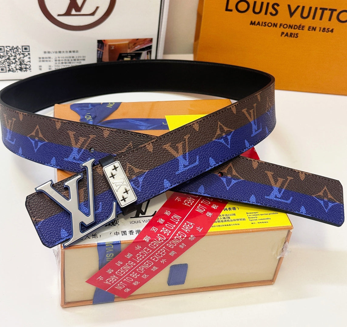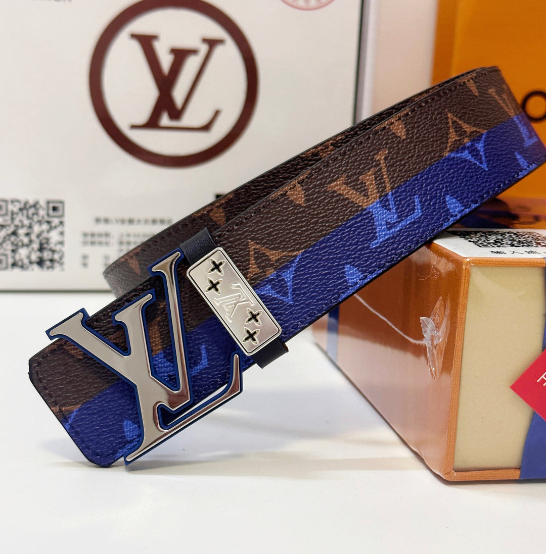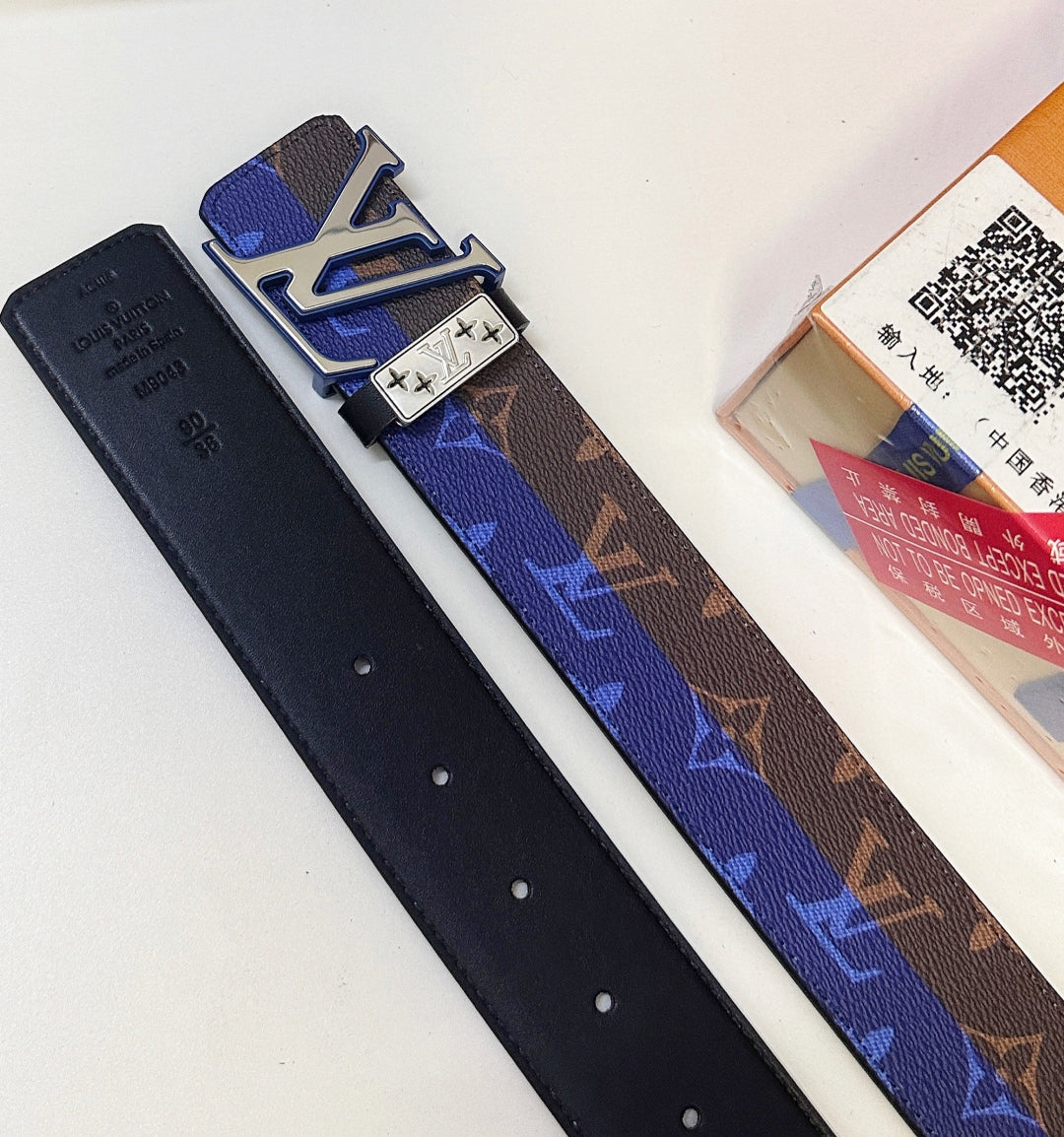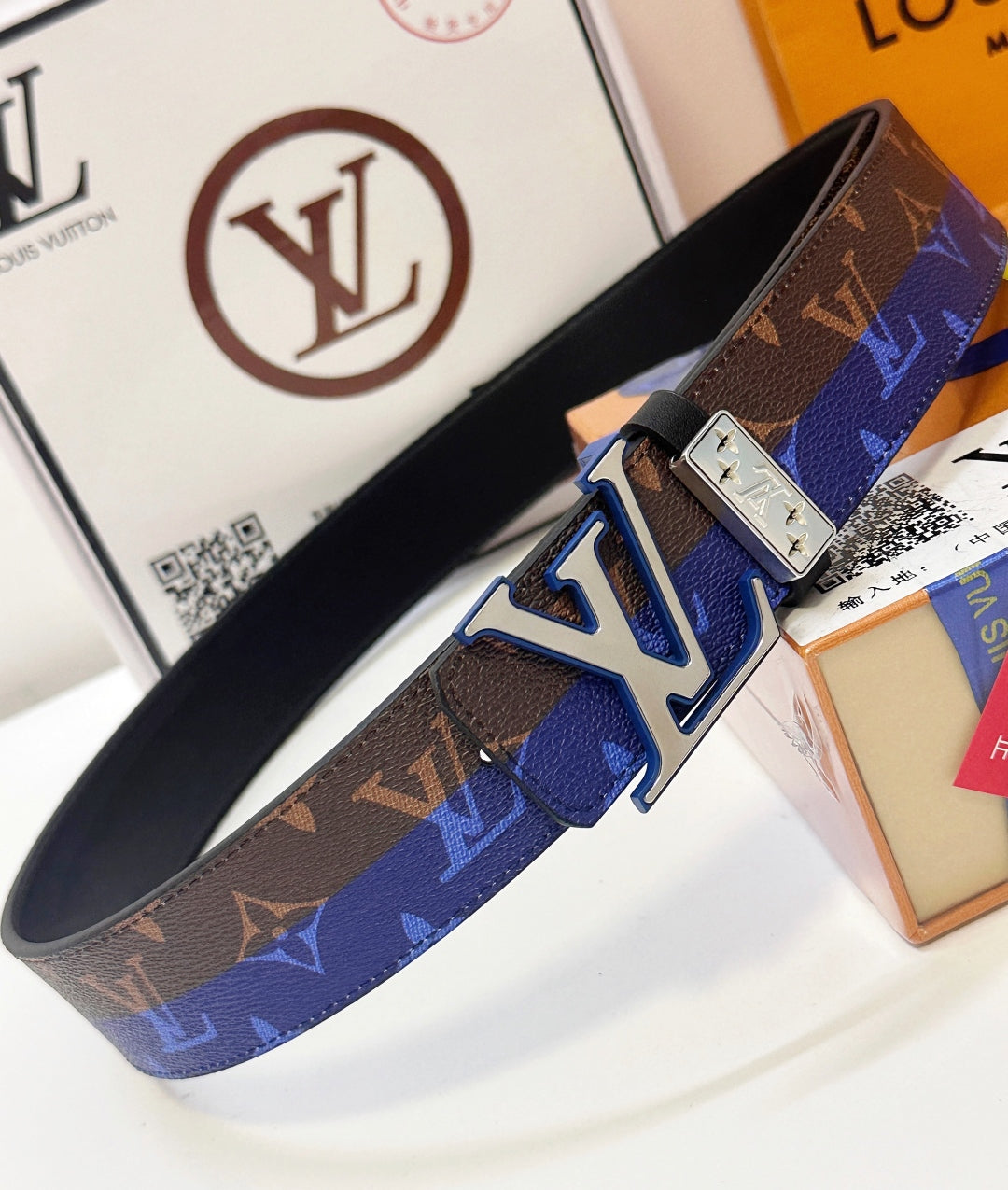 BELT 40MM REVERSIBLE IN BROWN AND BLUE CALFSKIN PRINTED MONOGRAM SILVER BUCKLE