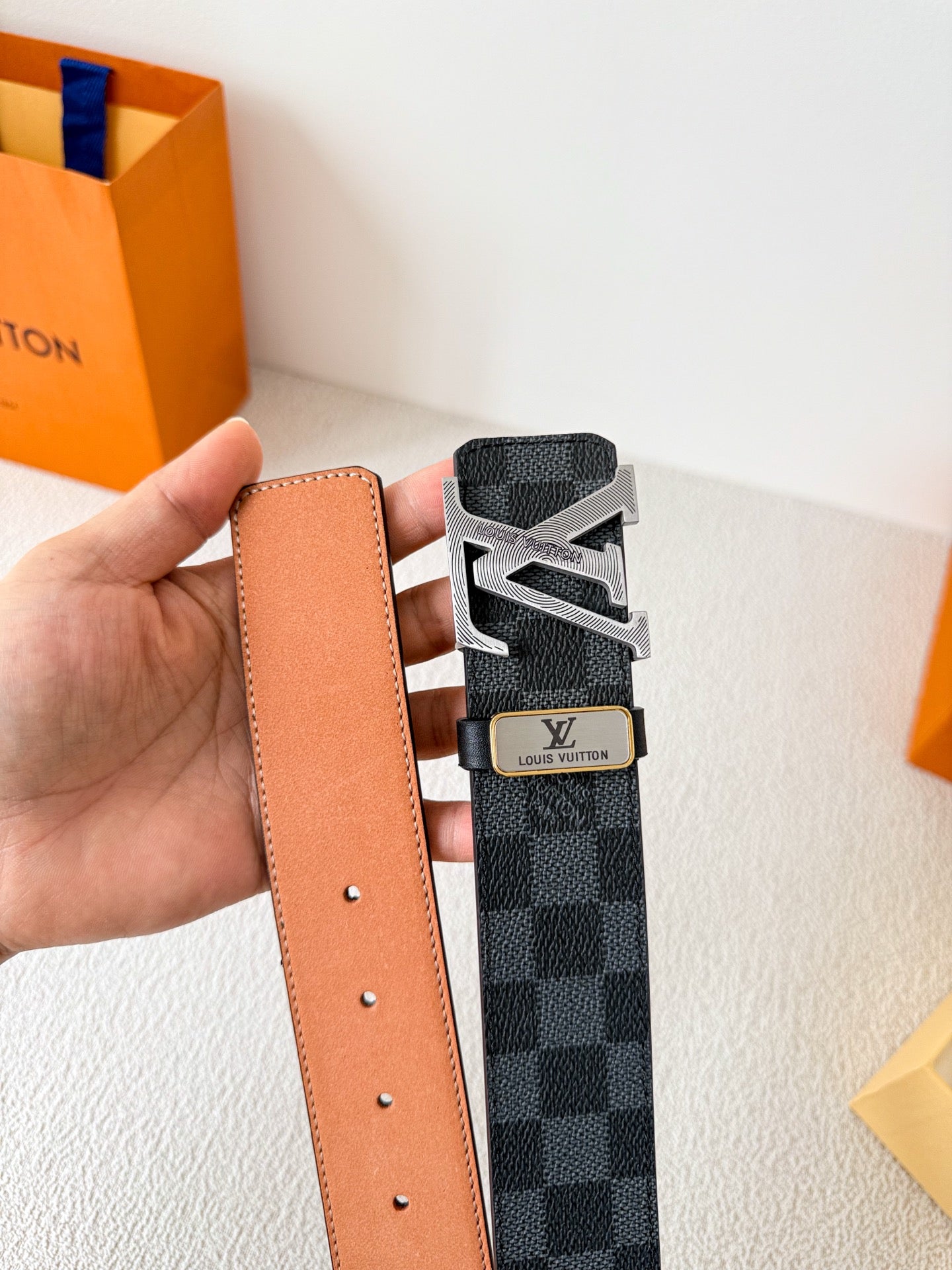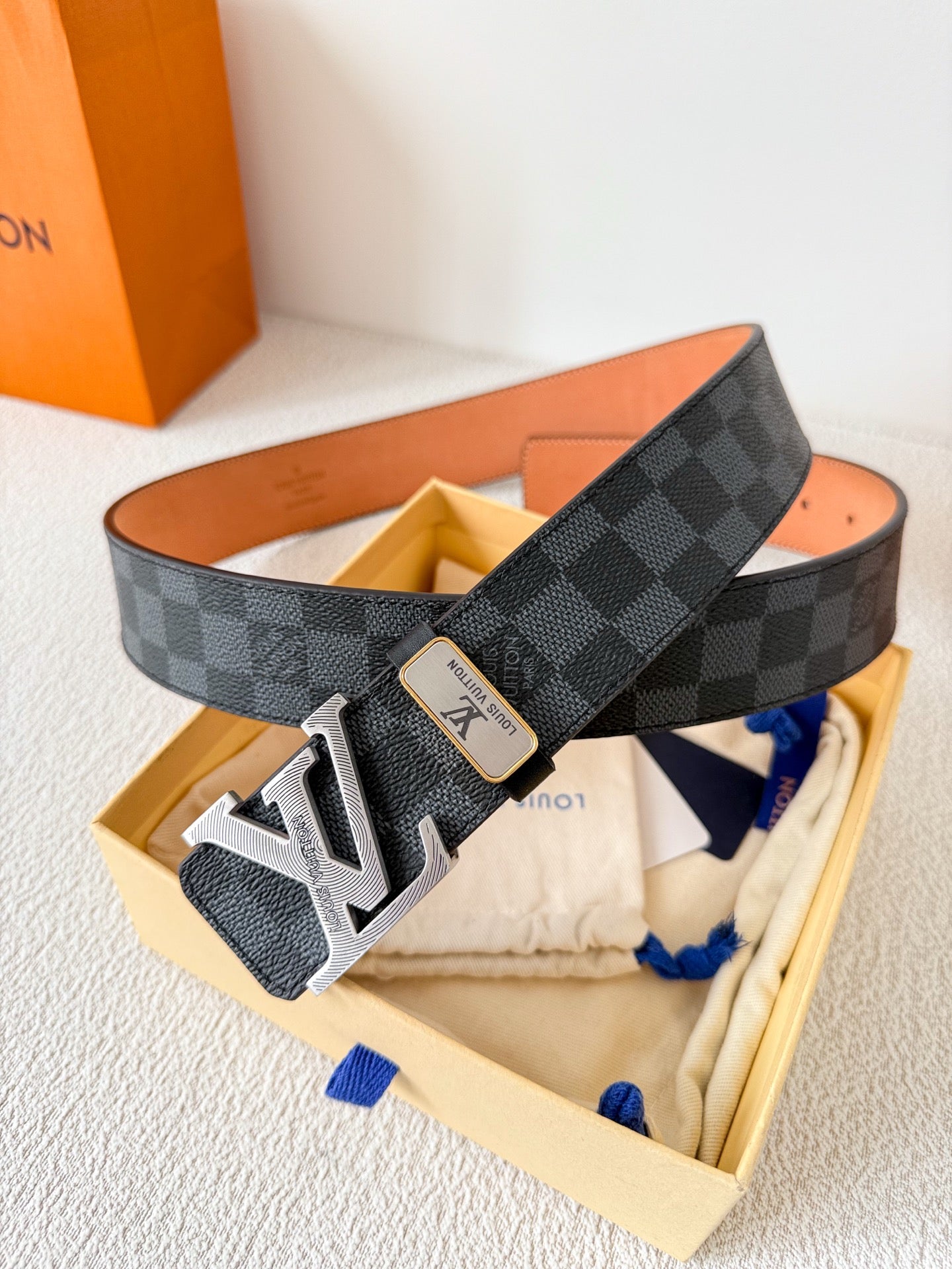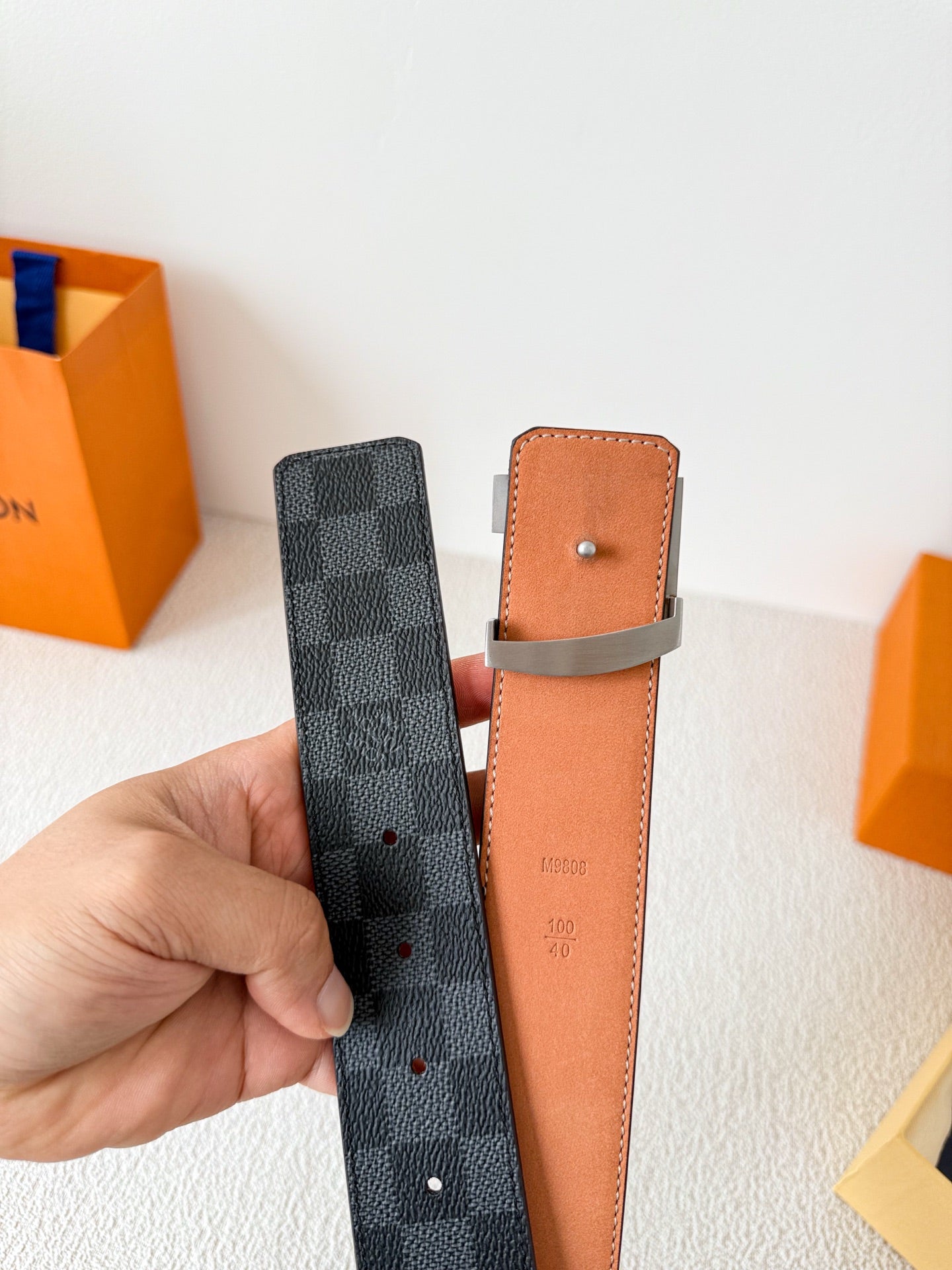 BELT SQUARE BUCKLE 38MM REVERSIBLE IN BLACK AND GREY CHECKERED CALFSKIN SILVER PLATED BUCKLE