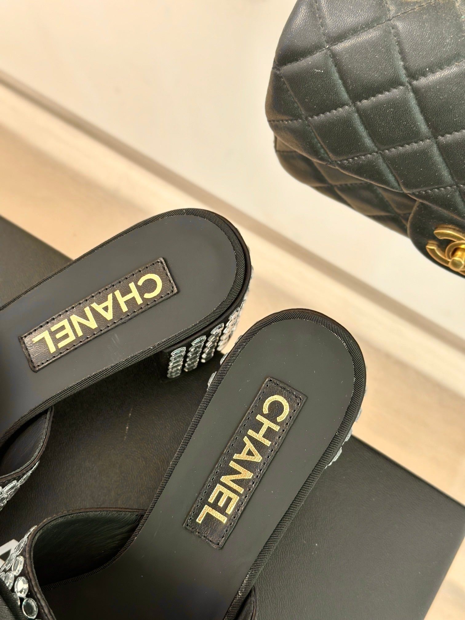 BLOCK HEEL MULE WITH WHITE RHINESTONES IN BLACK LAMBSKIN