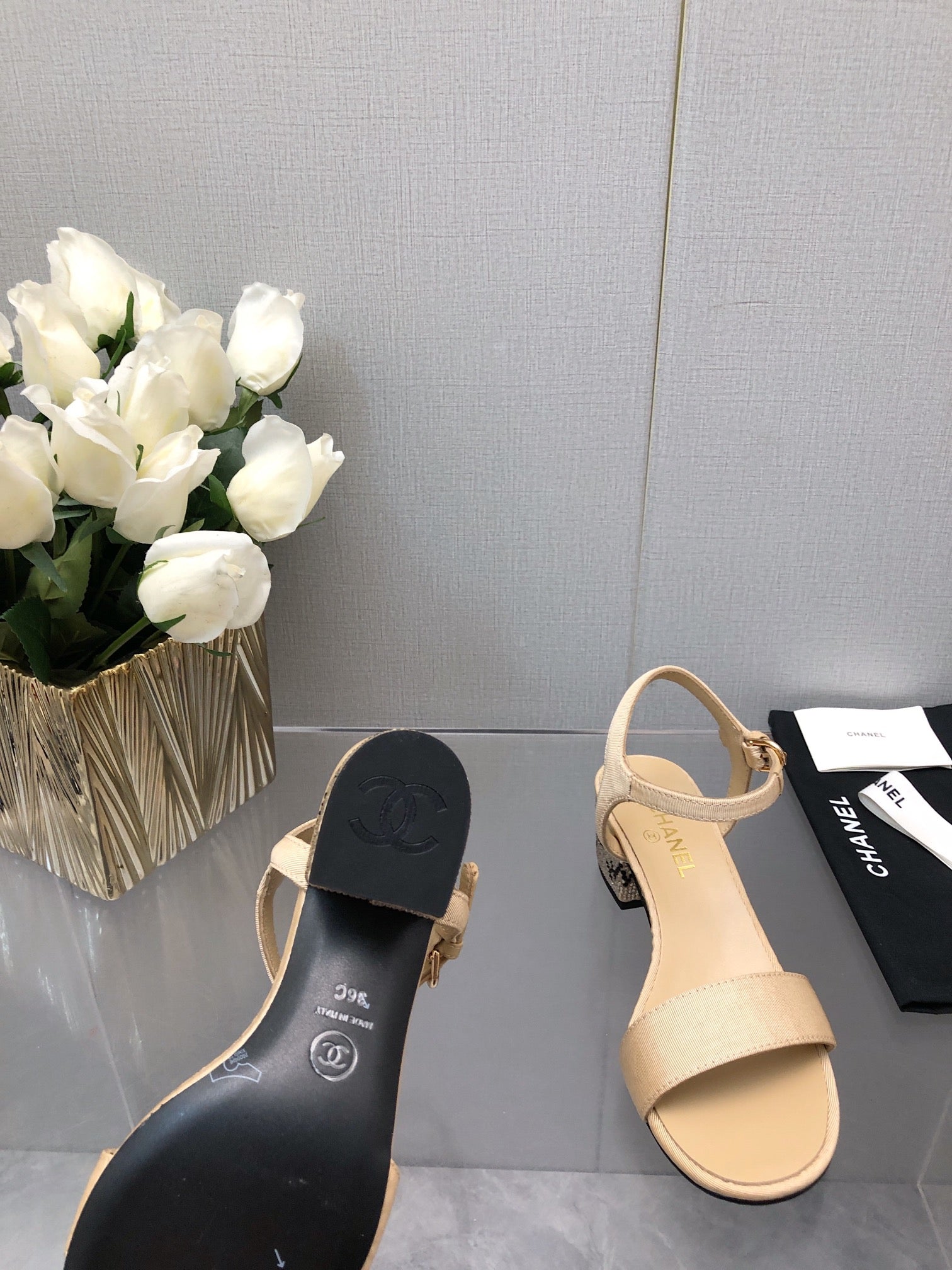 BLOCK HEEL WITH CRYSTAL 5 CM SANDAL IN SAND BROWN FABRIC