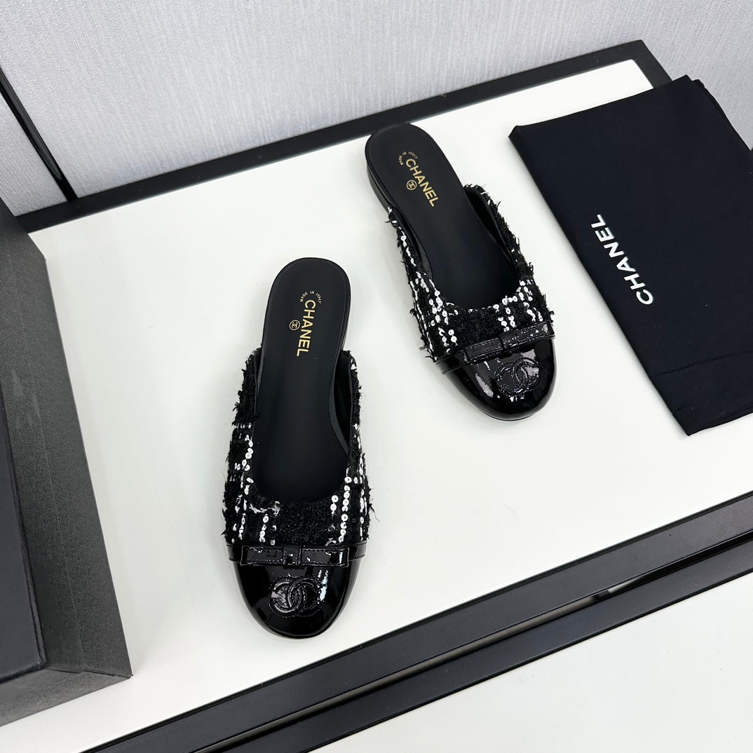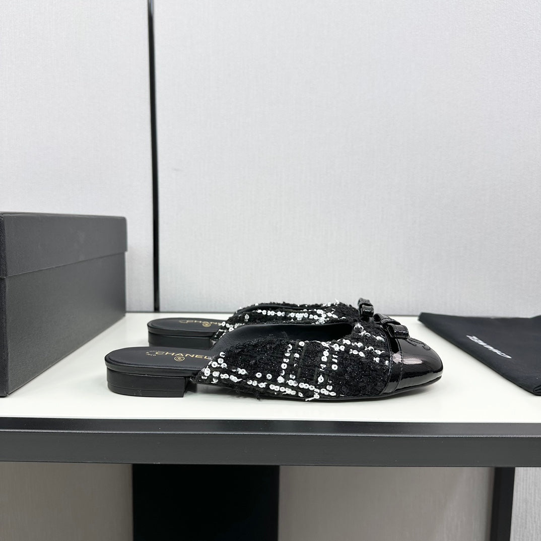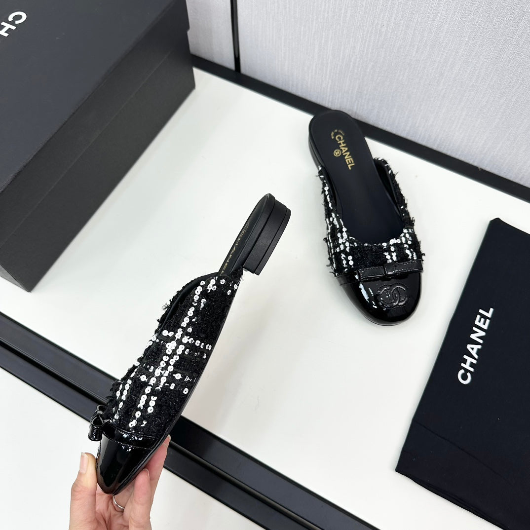 BOW MULE IN BLACK MIX WHITE FUR AND CALFSKIN