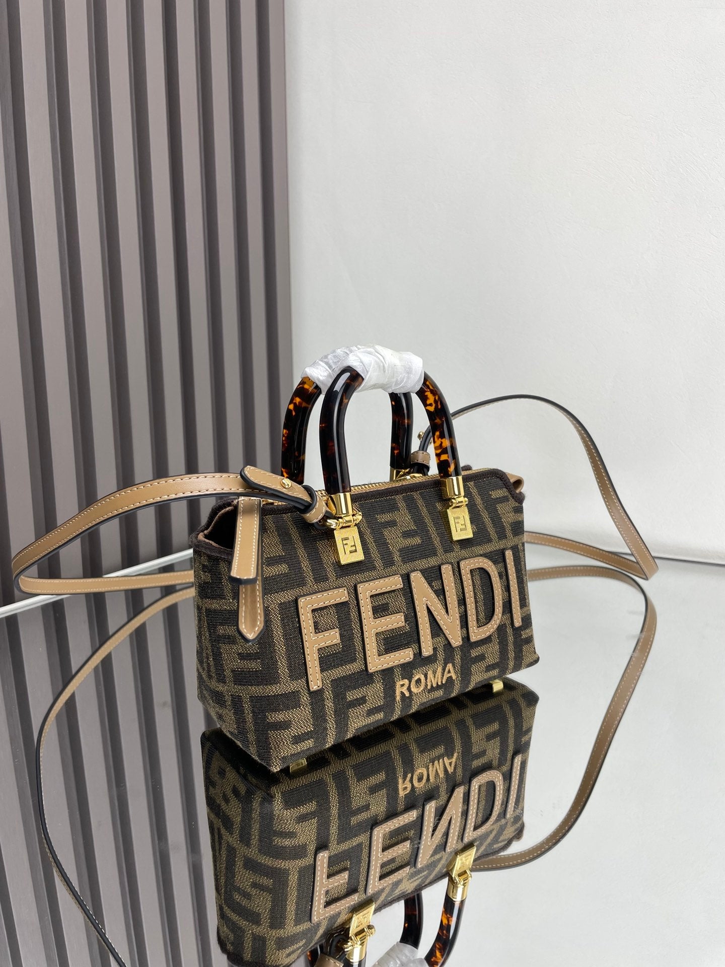 BY THE WAY MINI 18 IN SOYA BEAN JACQUARD FABRIC AND BROWN CALFSKIN TRIM