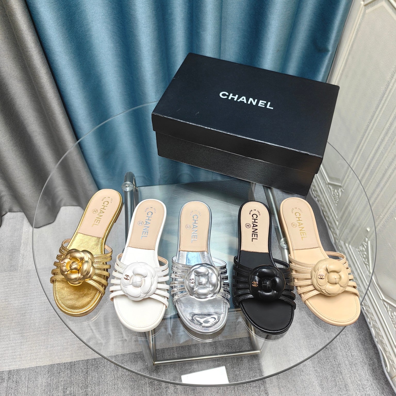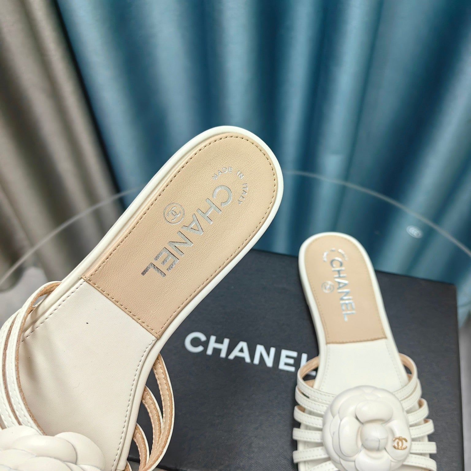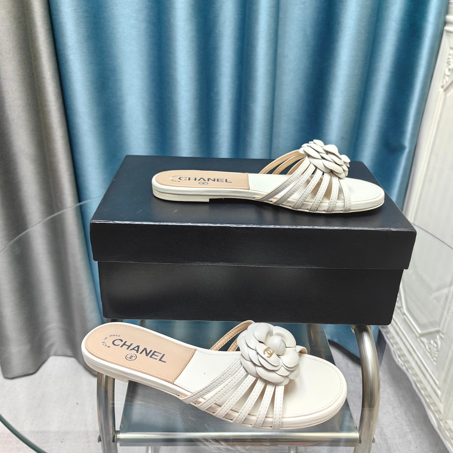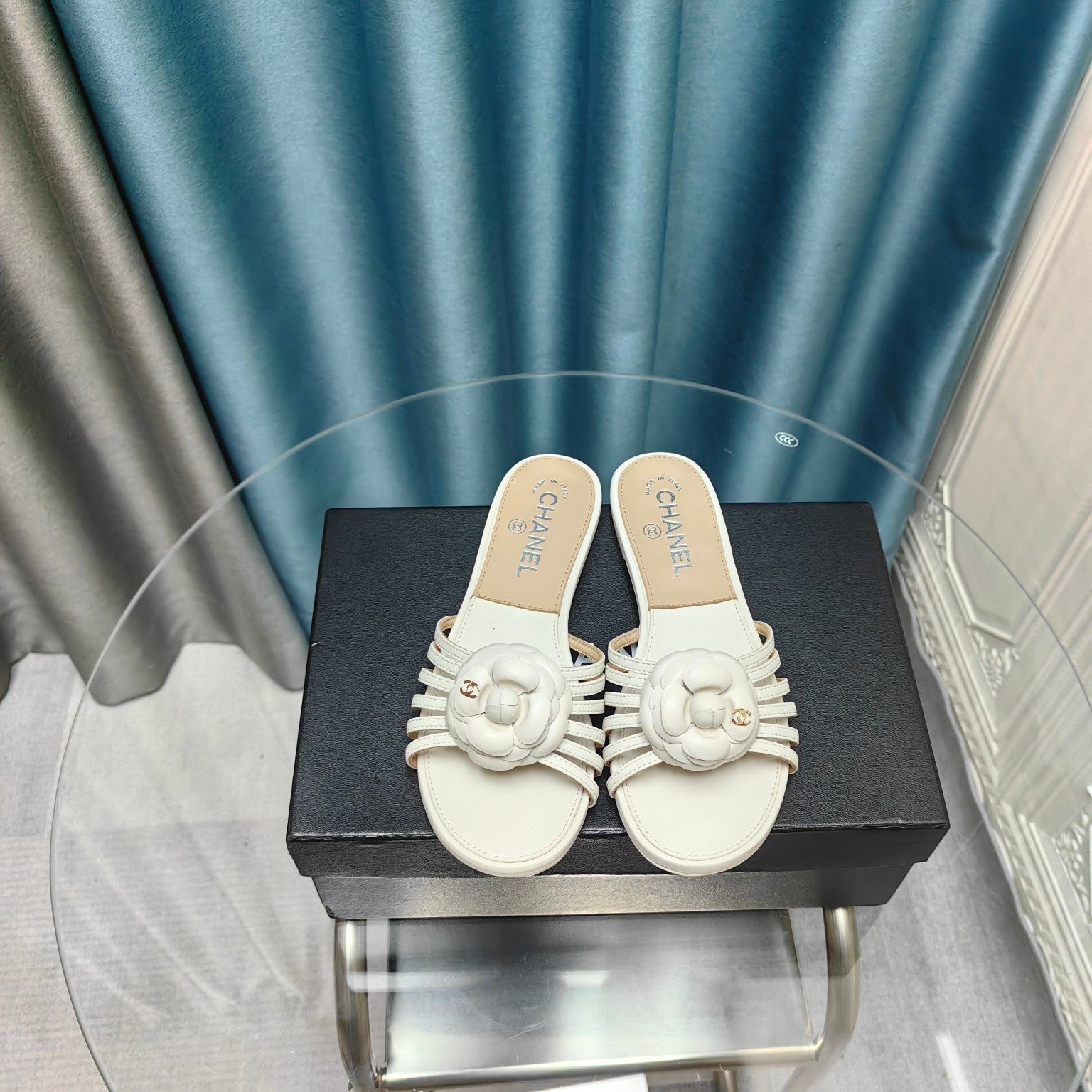 Camellia Slide Slippers White Lambskin