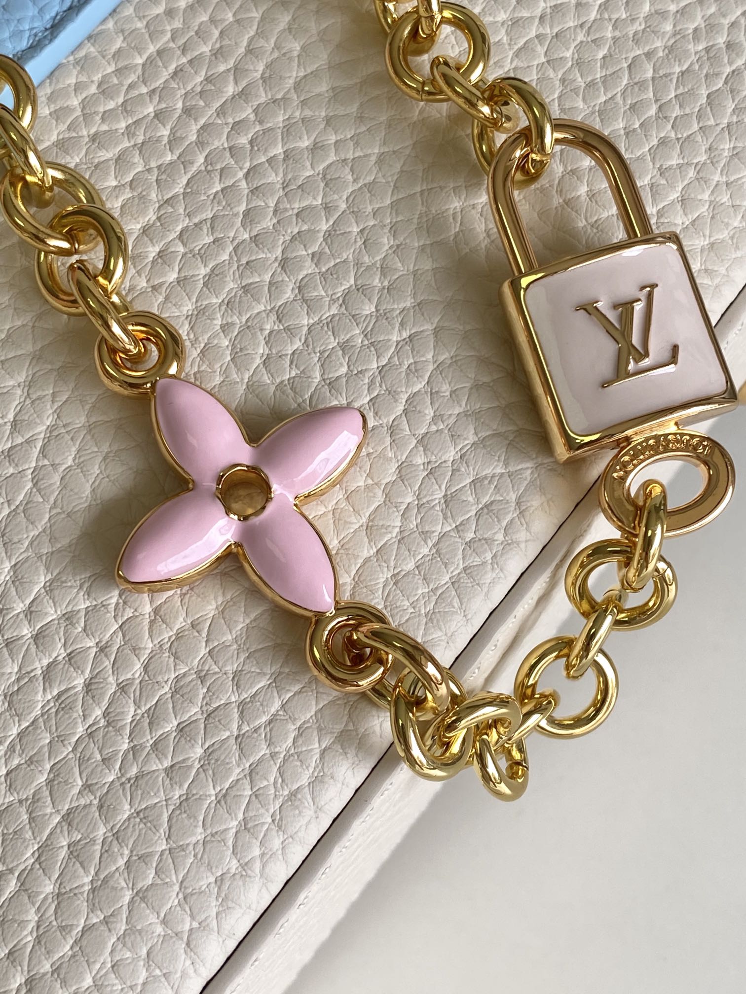 CAPUCINES NANO 16 IN PEARL WHITE MIX SKY BLUE TAURILLON GOLD HARDWARE