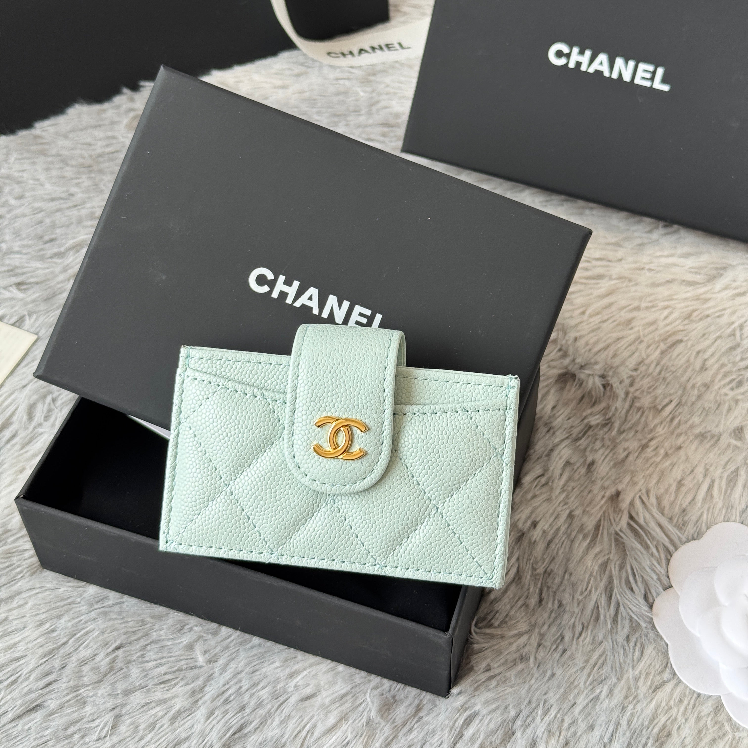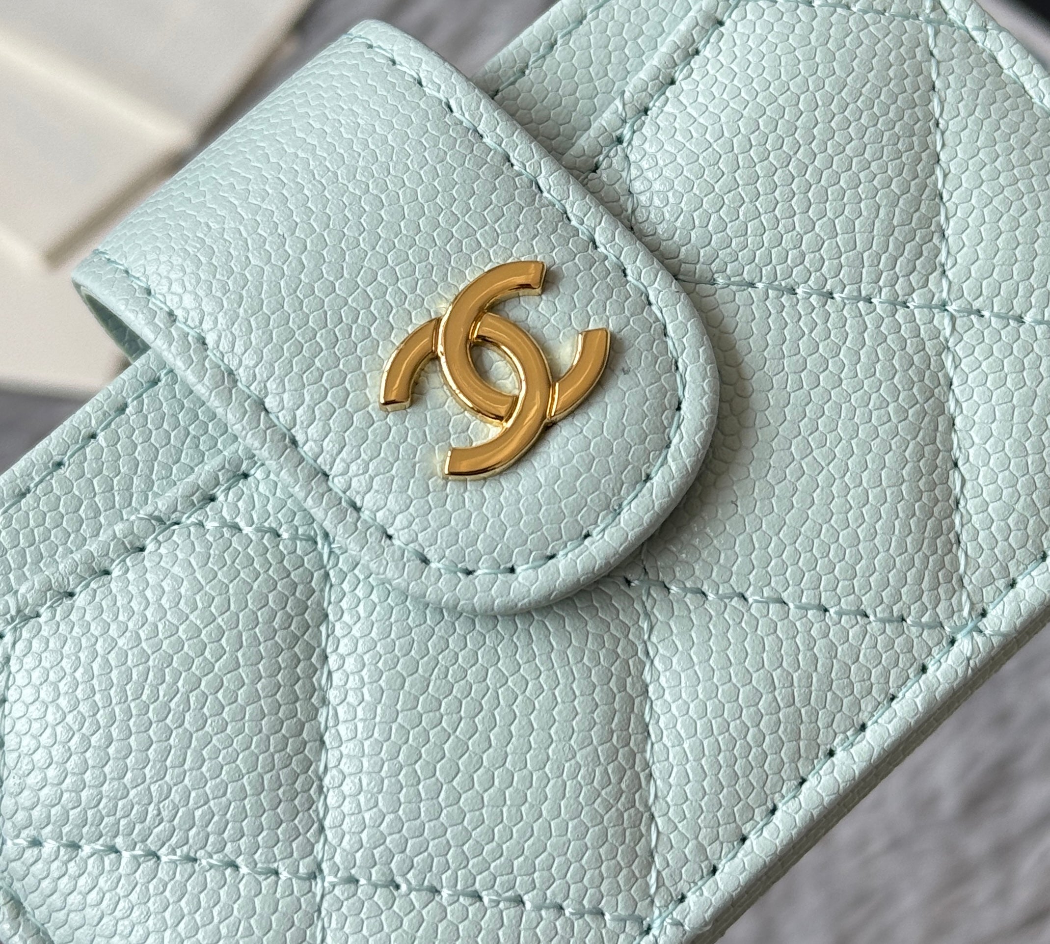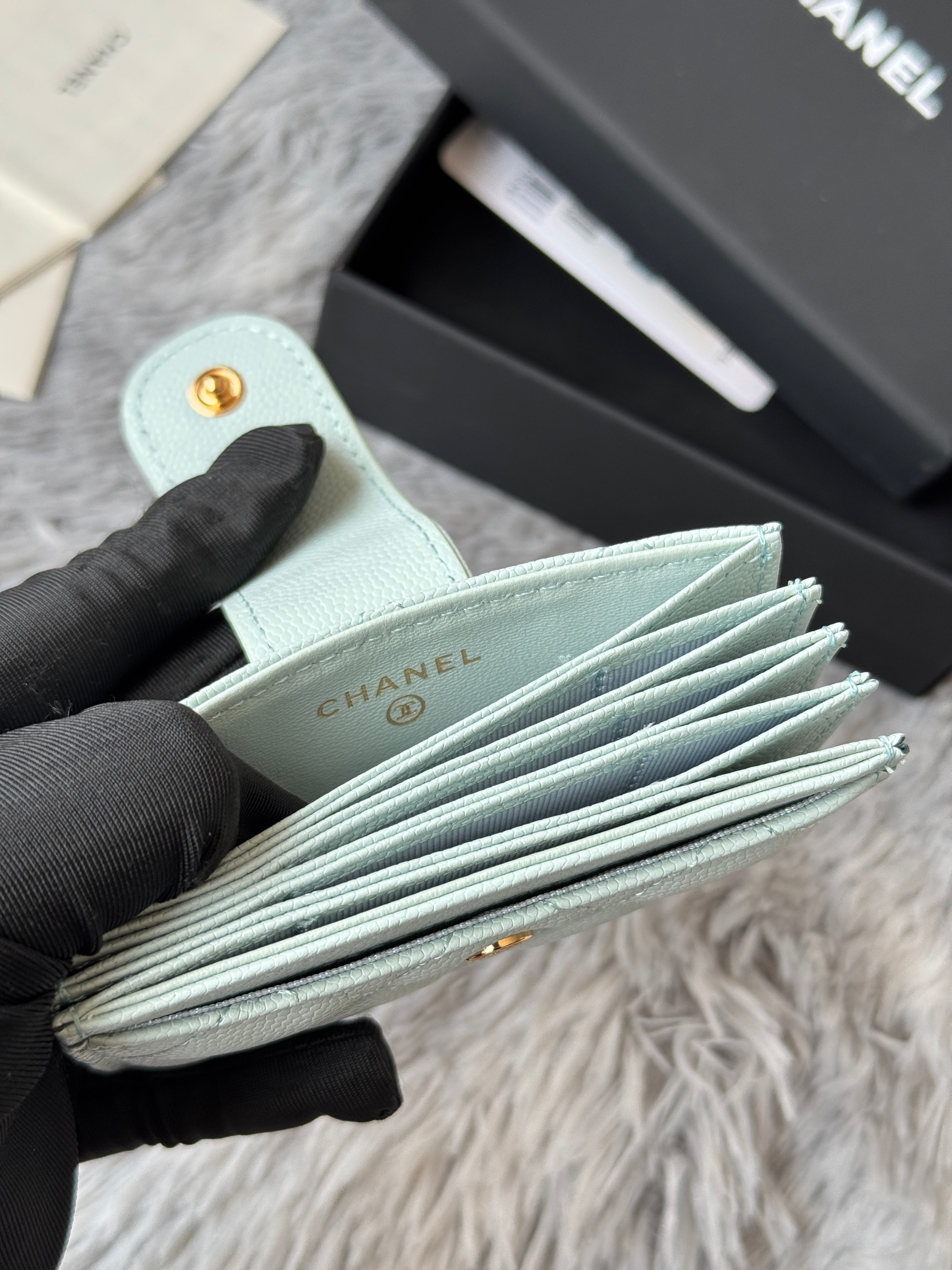 CARD HOLDER 10 CIRCLE CLASP IN BABY GREEN CAVIAR LEATHER GOLD-TONE METALLIC