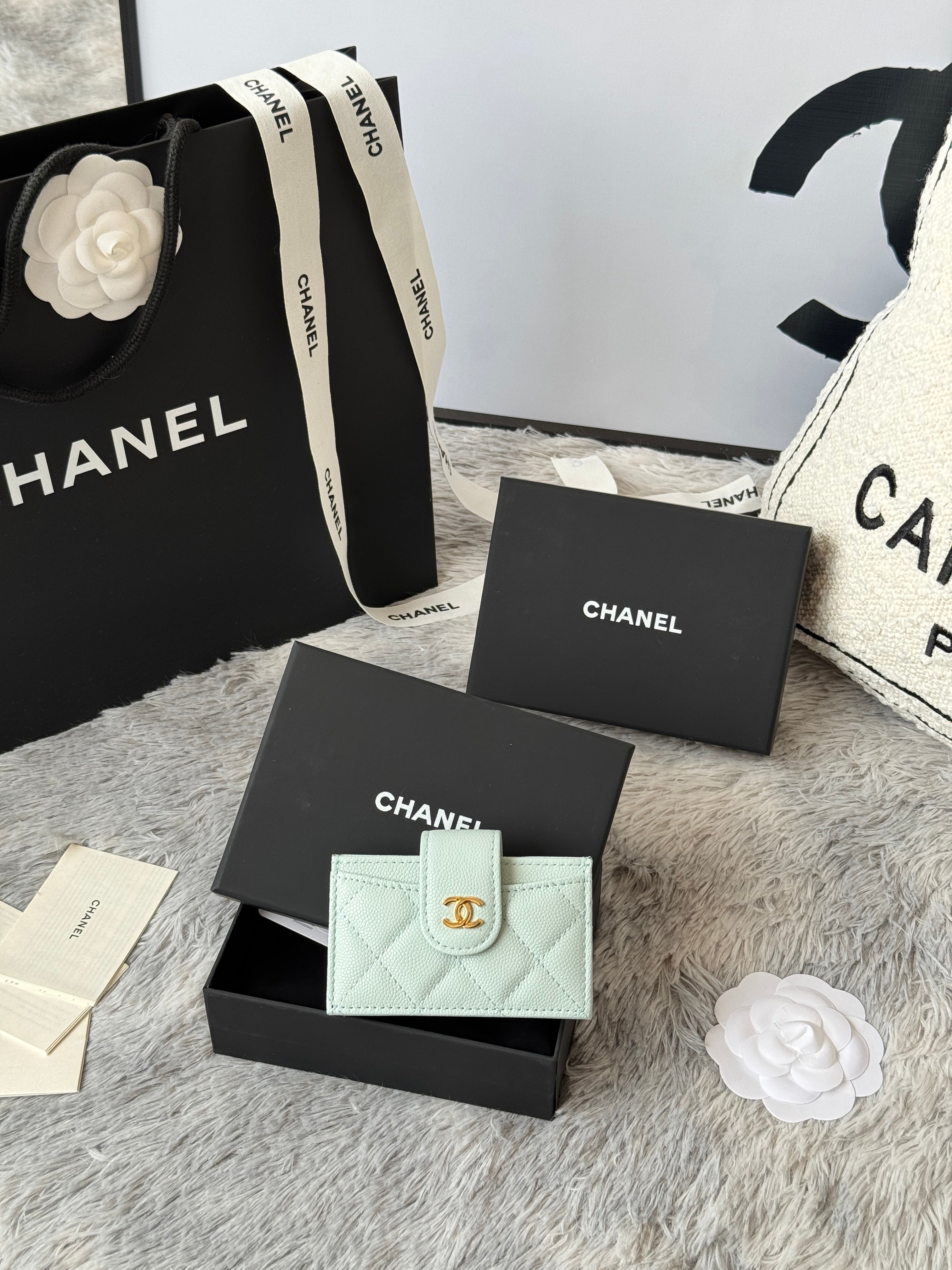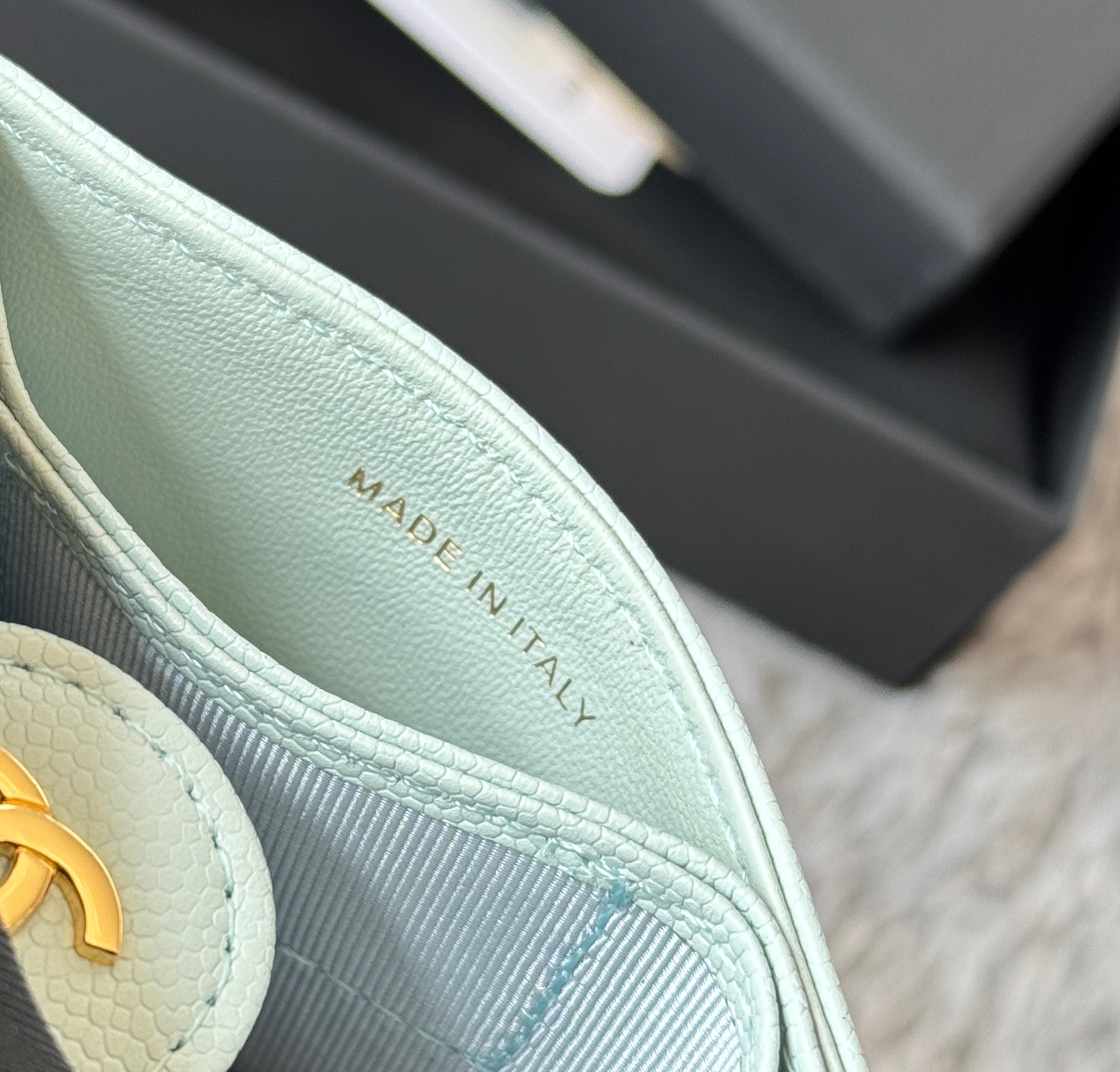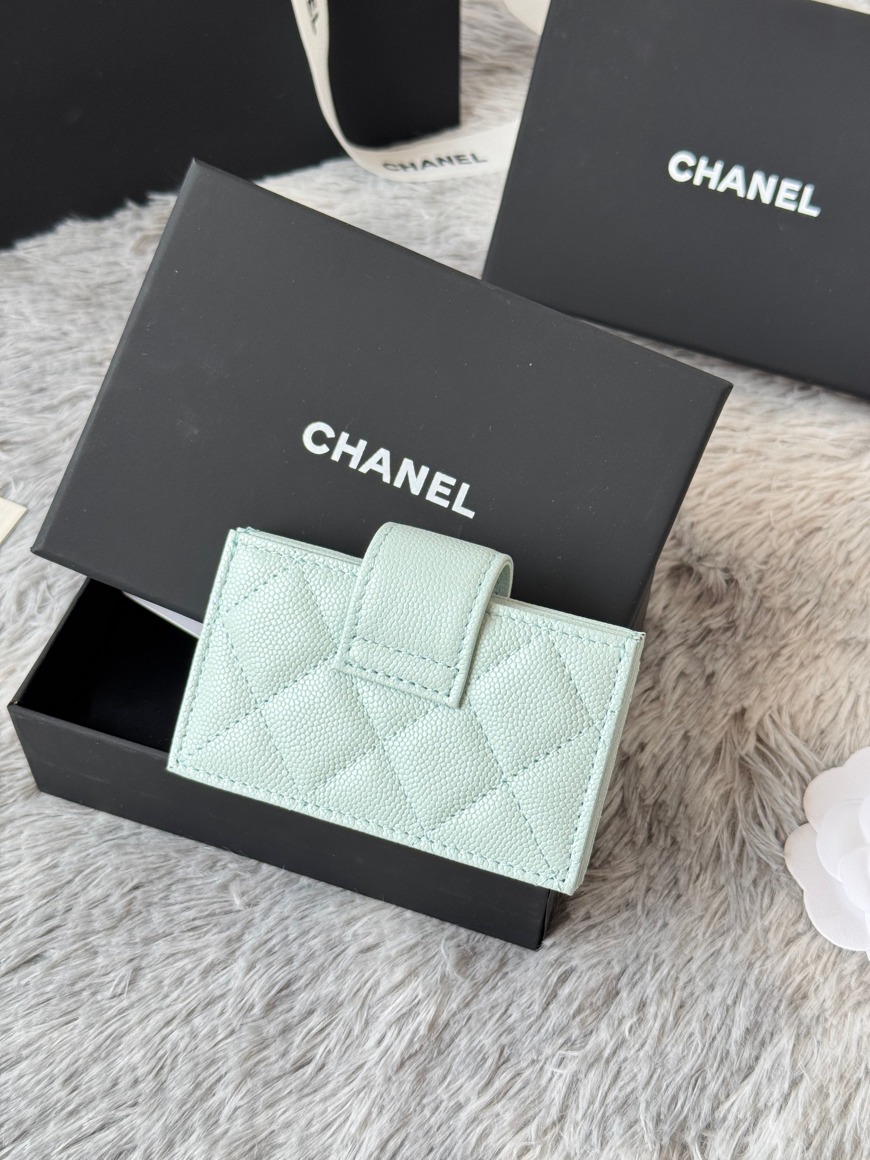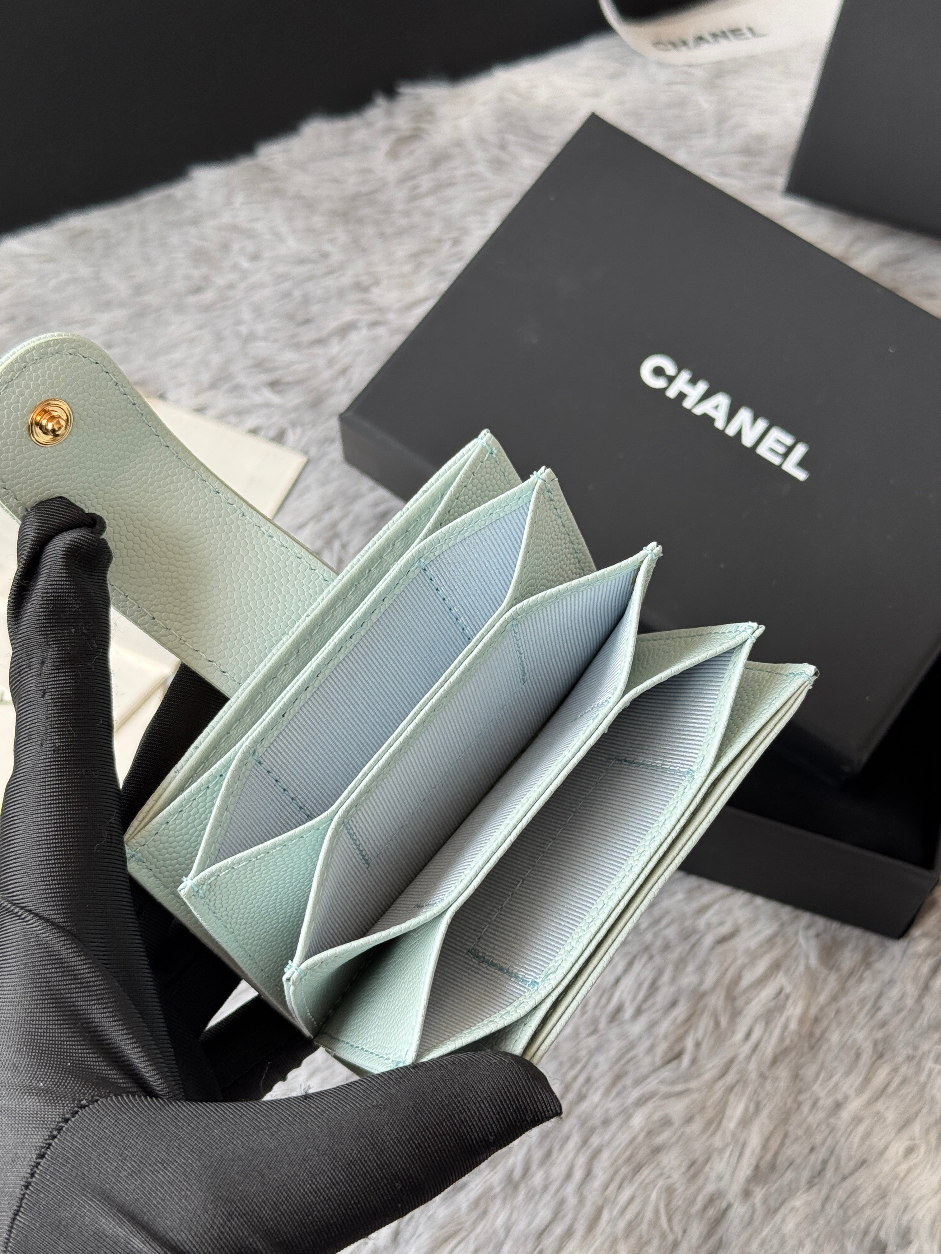CARD HOLDER 10 CIRCLE CLASP IN BABY GREEN CAVIAR LEATHER GOLD-TONE METALLIC