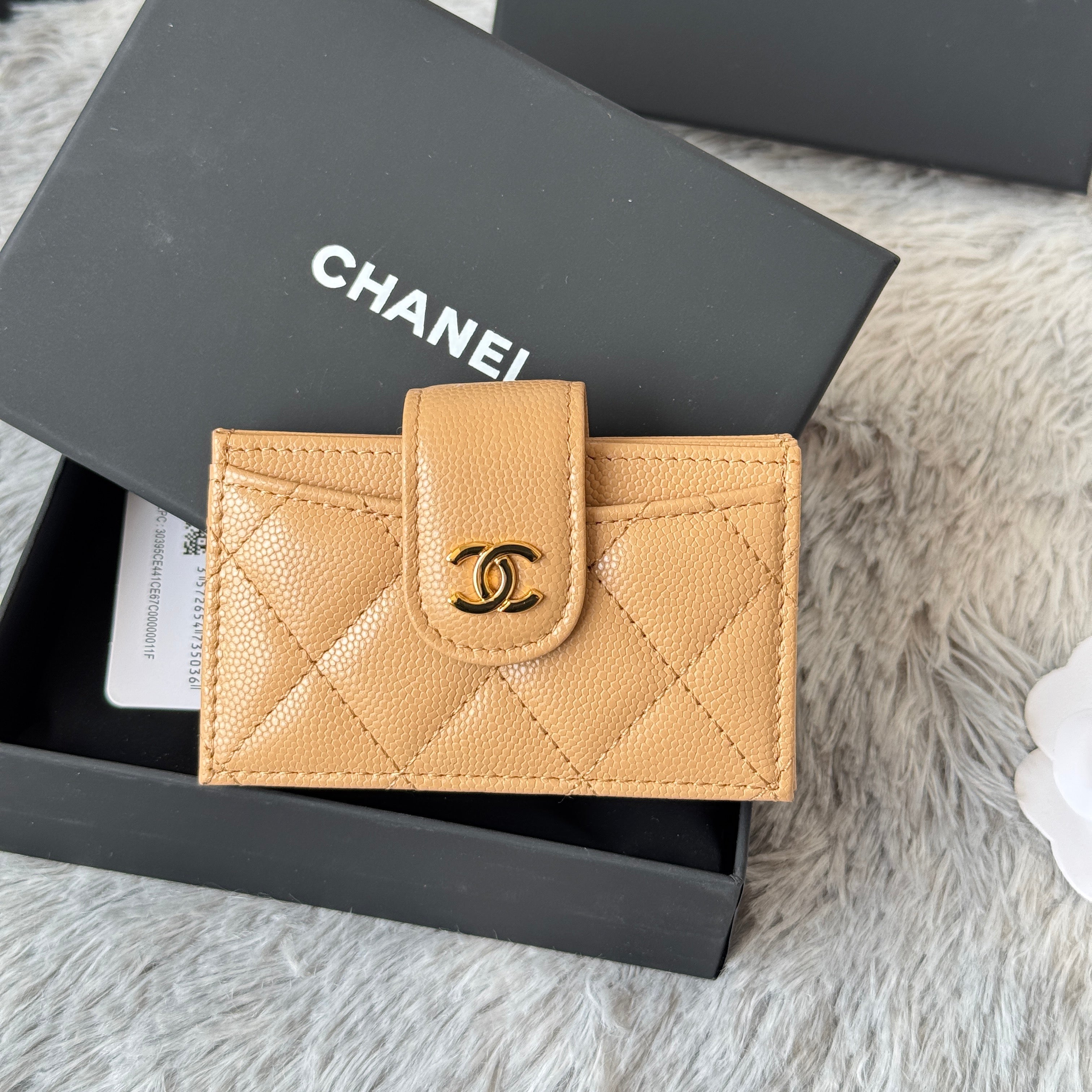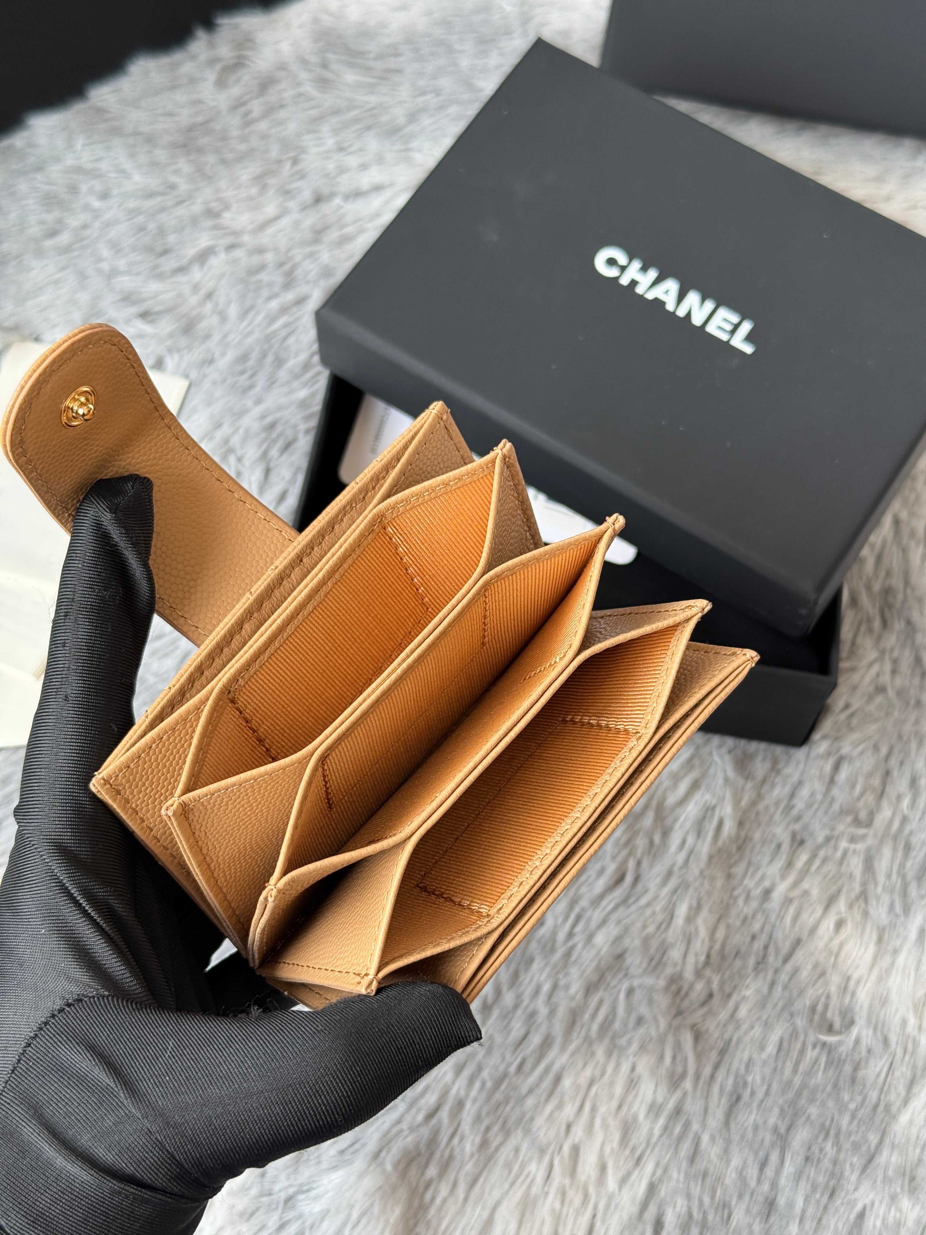 CARD HOLDER 10 CIRCLE CLASP IN LIGHT BROWN CAVIAR LEATHER GOLD-TONE METALLIC