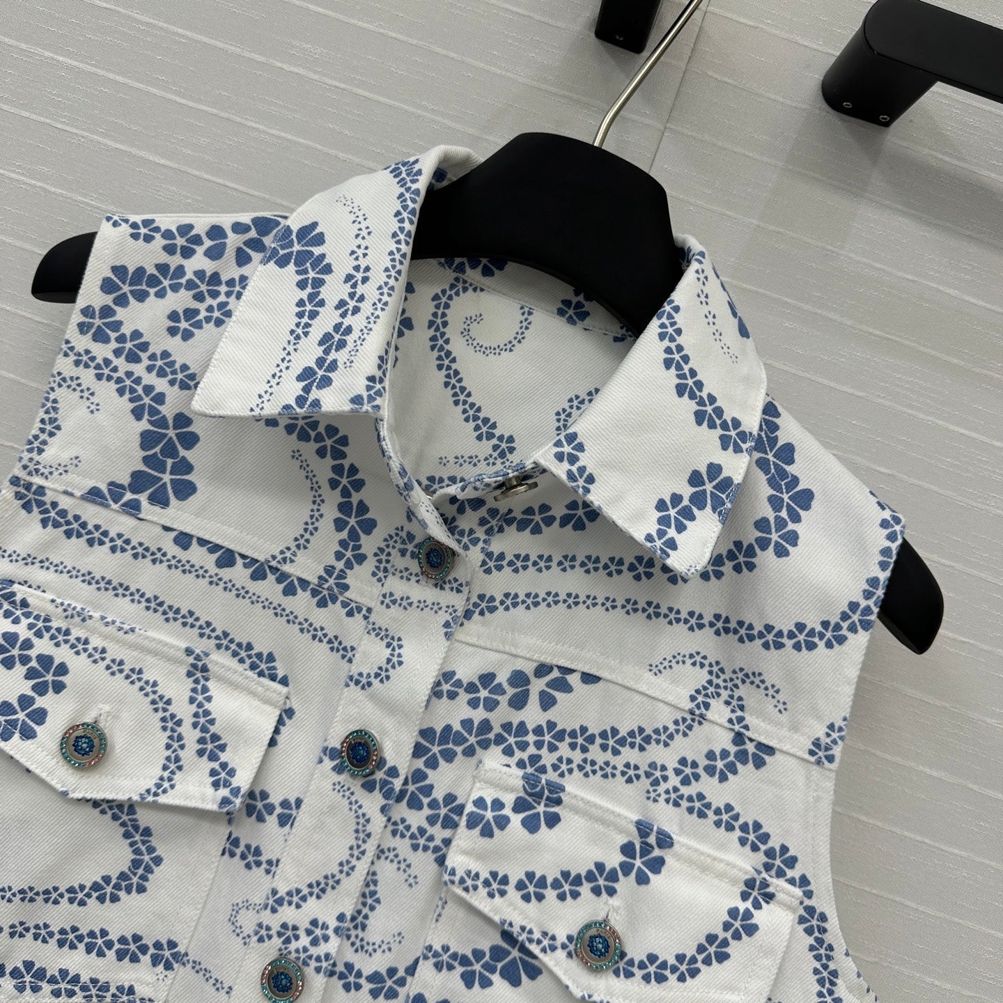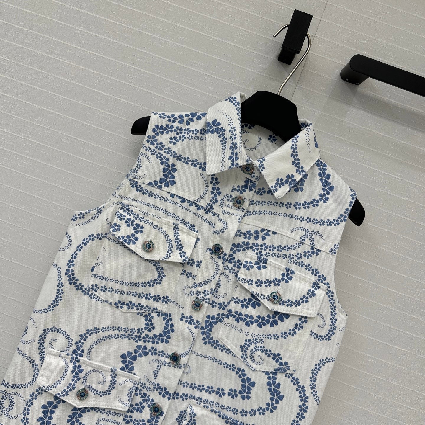 CC 25 Printed Denim Vest Jacket Blue White Cotton