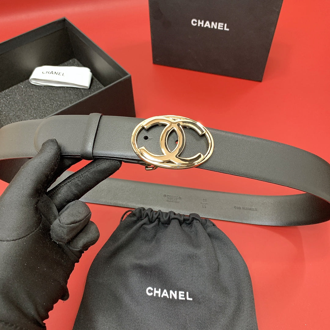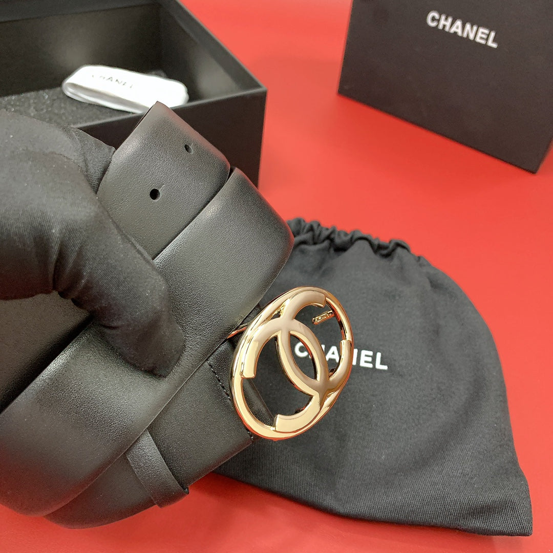 CC 40 MM CIRCLE BUCKLE BELT IN BLACK CALFSKIN WITH GOLD HARDWARE