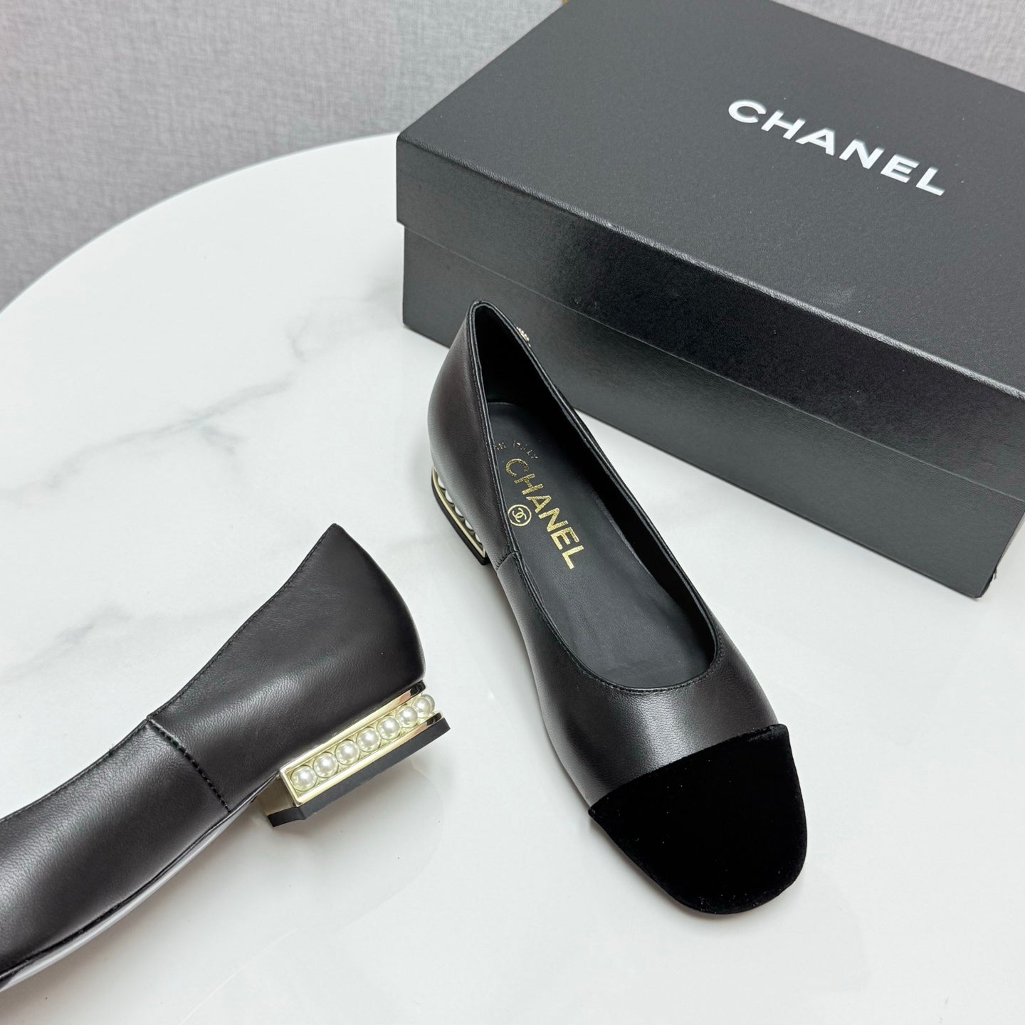 CC BALLET FLATS 25S IN BLACK LAMBSKIN AND SUEDE WITH PEARL HEEL